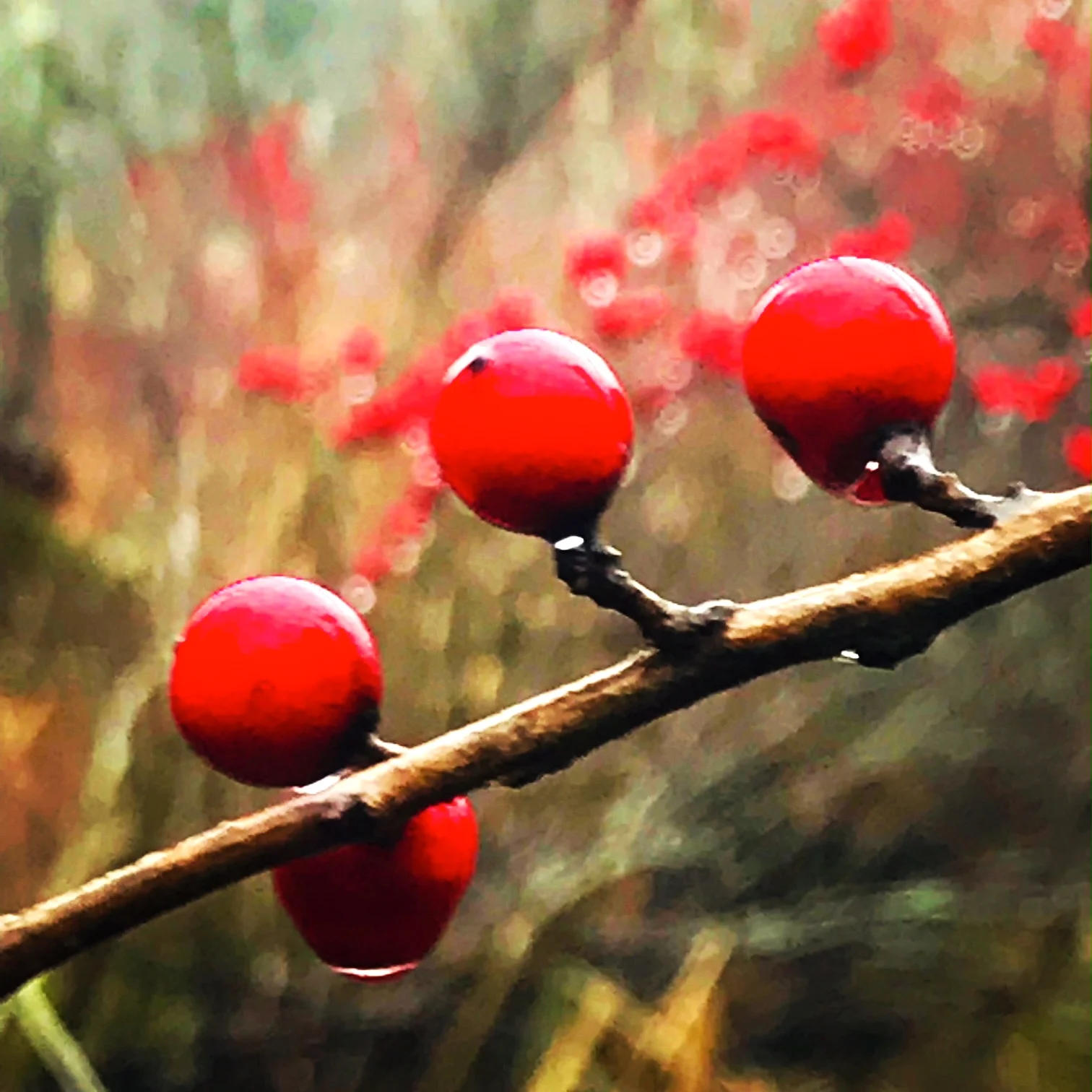 The rain kept the sky dark all morning, and poured so meanly Suzi wouldn't follow me and Charlie, she stayed indoors! while we went out into the thick of it and were quickly soaked, head to tail, but splashing along the path, we kept looking for something to lift our soggy spirits, when, as if called there, we slogged into the swamp and the branches of bunches of wet red berries found us, emanating light as if wanting to cheer us up, and they did, even though I stood in cold water up to my ankles to get a close-up look at them dripping fat bright drops of rain. We walked soggily on, almost our usual amount of time, and just when we needed another pick-me-up, I saw the red leaves arranged like a toy on the forest floor standing up straight looking just like a pinwheel, and then we were rain blasted and happy to soak on home to dry towels, a hot fire, family and a holiday mood in the house. I haven't kneaded bread in some years, so I baked some from scratch, and the November day smelled fine from the yeast and the cinnamon, the pies and the cookies and pizzas we cooked 'til our legs ached and we ate treats until bedtime, goodnight.