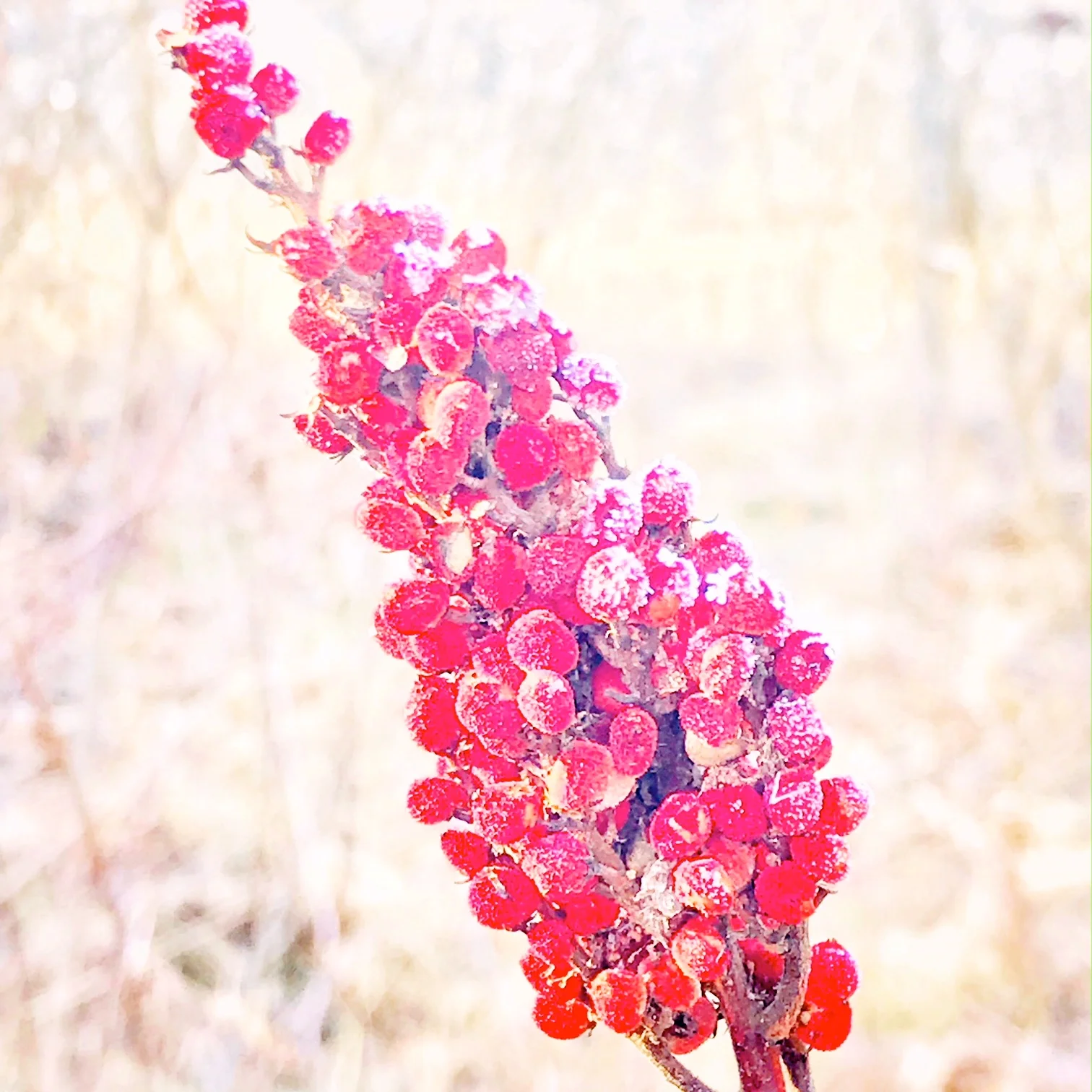 Then, the frosted sumac was in sight, so I climbed into the brush for pictures. The man approached, so the dogs trotted over and I had to climb out of the bushes to retrieve them. Charlie's enthusiasm still seemed to concern him.