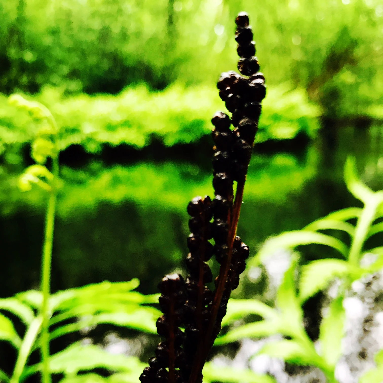Onoclea sensibilis is one of the many spring highlights of my rainy morning walk. Commonly called sensitive fern, it's one of the most distinctive ferns thriving along the brook that runs through our woods to spill into the Charles. I love how its shining stalk of brown beads will endure as a beautiful decoration of the brook's swampy wetlands in winter. But, standing in spring rain, here, in the emerald brook, is how I love beaded fern best.