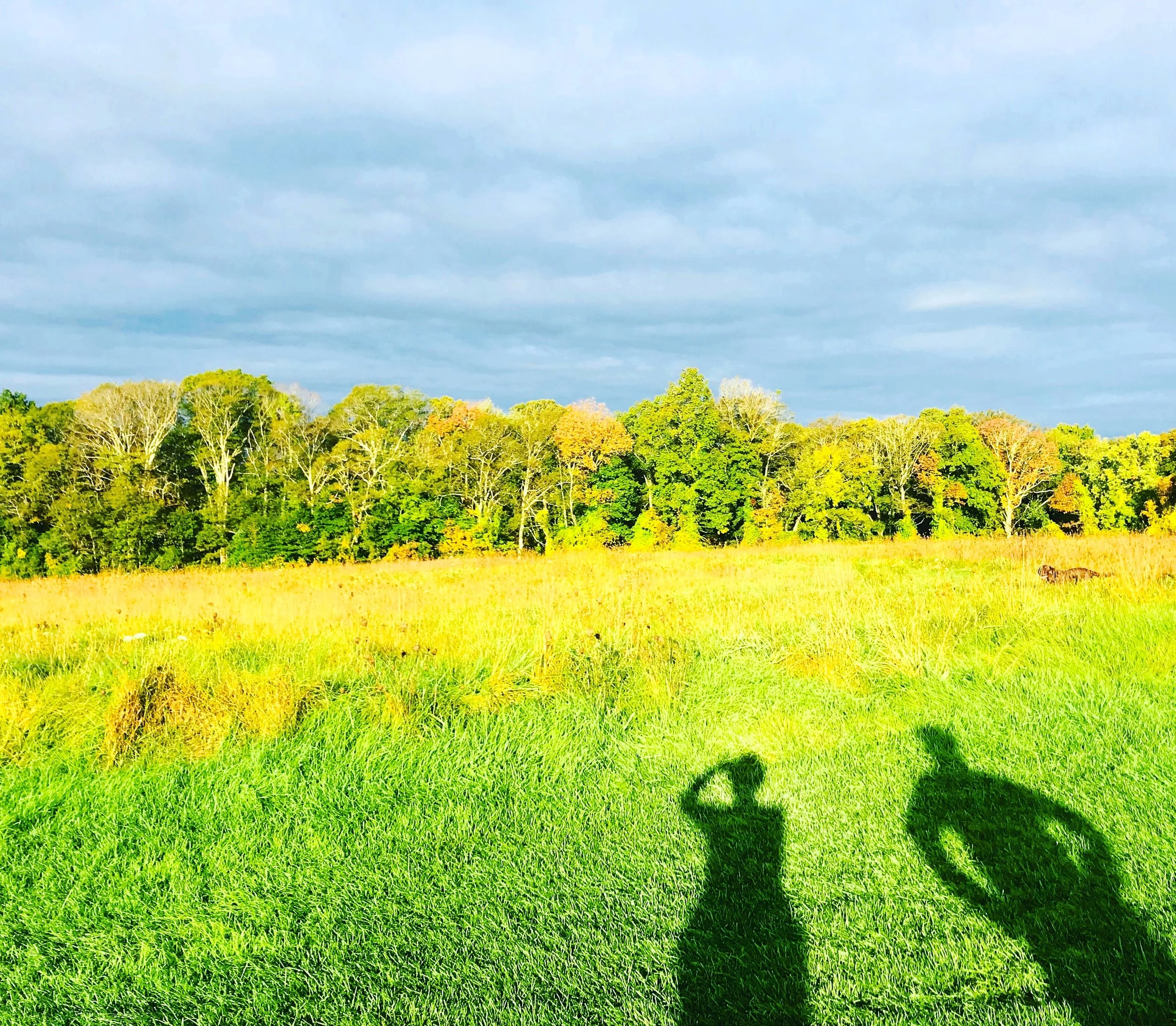 Awake at 5:00, out by 7:30, this walk with a friend and our dogs, starting at Medfield State. It’s another glorious morning of sun shine from an October blue clouded sky over the still green meadow. We take the Charles Link trail that threads along the river with many stunning views of trees framing the water. Her parents are aging into a stage where they need extra time and care; I remember those years, they are gone now, but it seems like it must have been a full decade of supporting them through so many emotional and health challenges in their last years. The tug and pull of how much they needed weighed against how much I could, or wanted, to give. Perhaps because it’s the month of my birthday I have been missing them both. I would like to rub my father’s shoulders and hug him and see his smile. I would like to see my mother in her kitchen peeling and slicing apples, rolling her dough on the cutting board for pie. And, to smell cinnamon, baking. Today, I worked on my long essay, just a 750 word slice of it I have previously drafted, to bring to my group on Monday. Very flat. I just looked at the flat paragraphs for awhile waiting for an idea. Wondering what to do. Kind of at a loss. Couldn’t connect. And yet, it’s a piece of the story I’m trying to tell, so I won’t chuck it out. She was my friend, and I’m trying to tell her part of the story, but it was so long ago. So, today was spent trying to find a way to interest myself in it, remember something, and I sat at it until I did. It’s not all the way there yet, but I just wrote what came to me, and found, well, this is making it better for sure. I think because I haven’t seen her in so many years, and this was decades ago, the secrets are not on the surface. But I got enough to be excited about going back, not tomorrow, but Monday. Now, I feel like I’m looking forward to seeing her again, on paper. Huh. Funny, now I see the connection to the picture below, the shadow of me and my friend in the meadow this morning. And the shadow of me and another friend, in my memory of high school, so many decades ago.