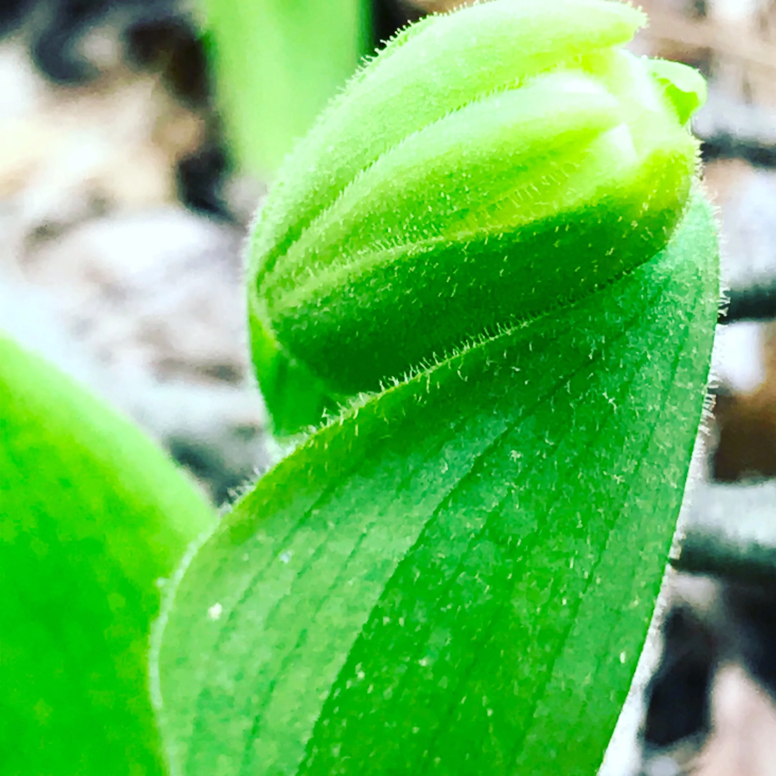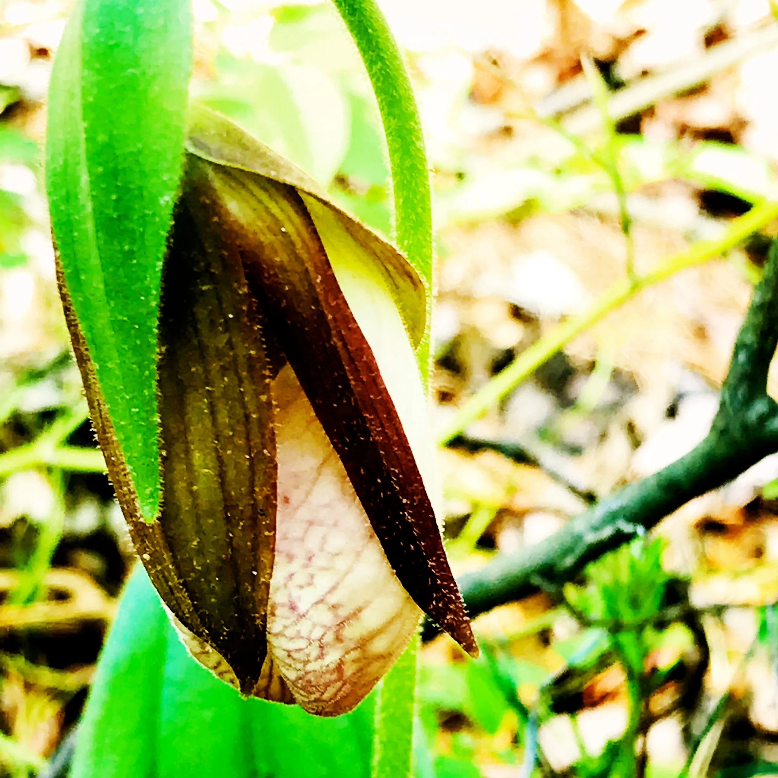 Then I get another text, this time with a picture. She has reached the lady slippers and found one, not just with an unopened blossom, she has found one blooming - the first. Do you want to come see them she asks?