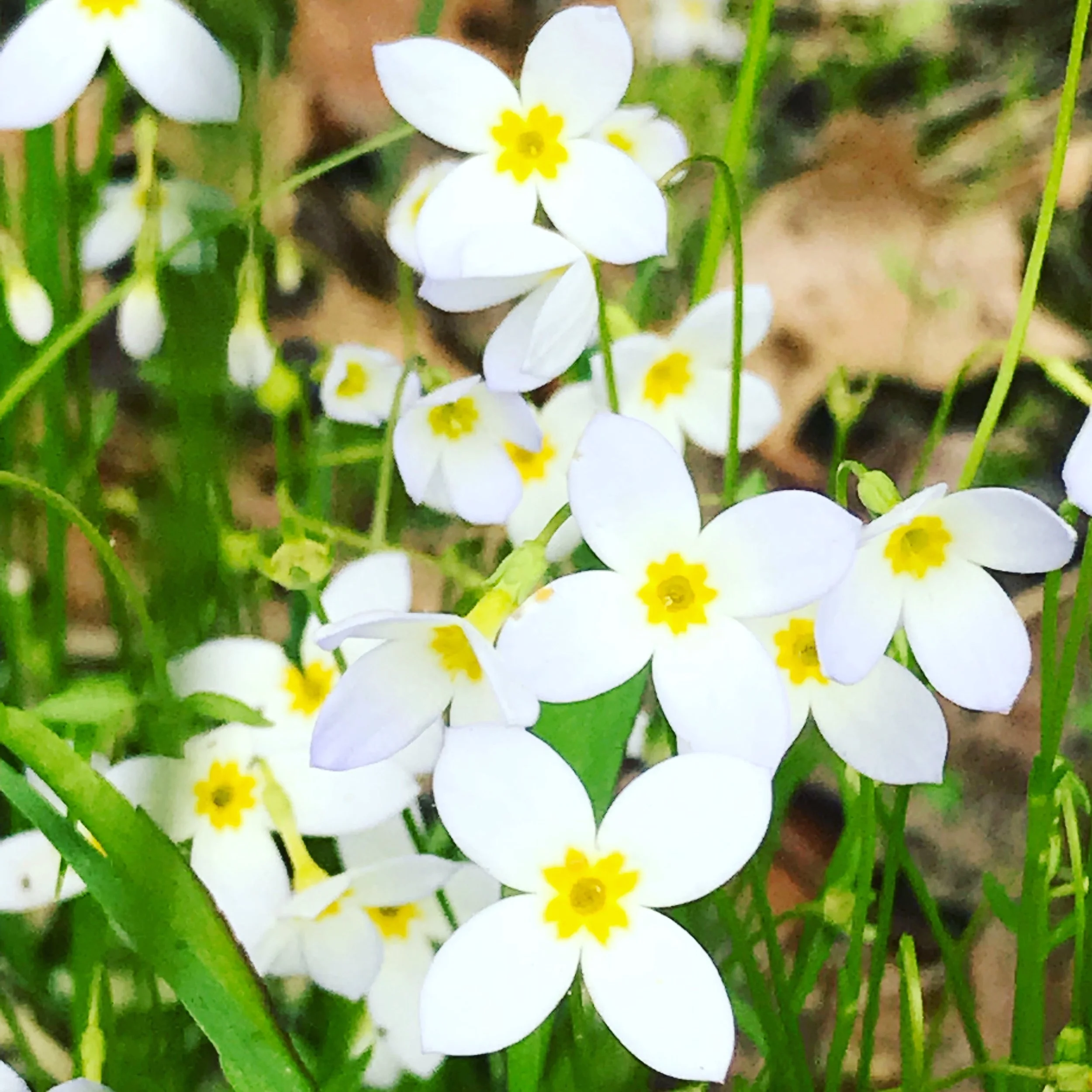 “As individual flowers the bluets are so inconspicuous that few people notice them. But they colonize, and vast patches of their white or pale lilac blossoms are like frost on the grass in upland meadows. . .
