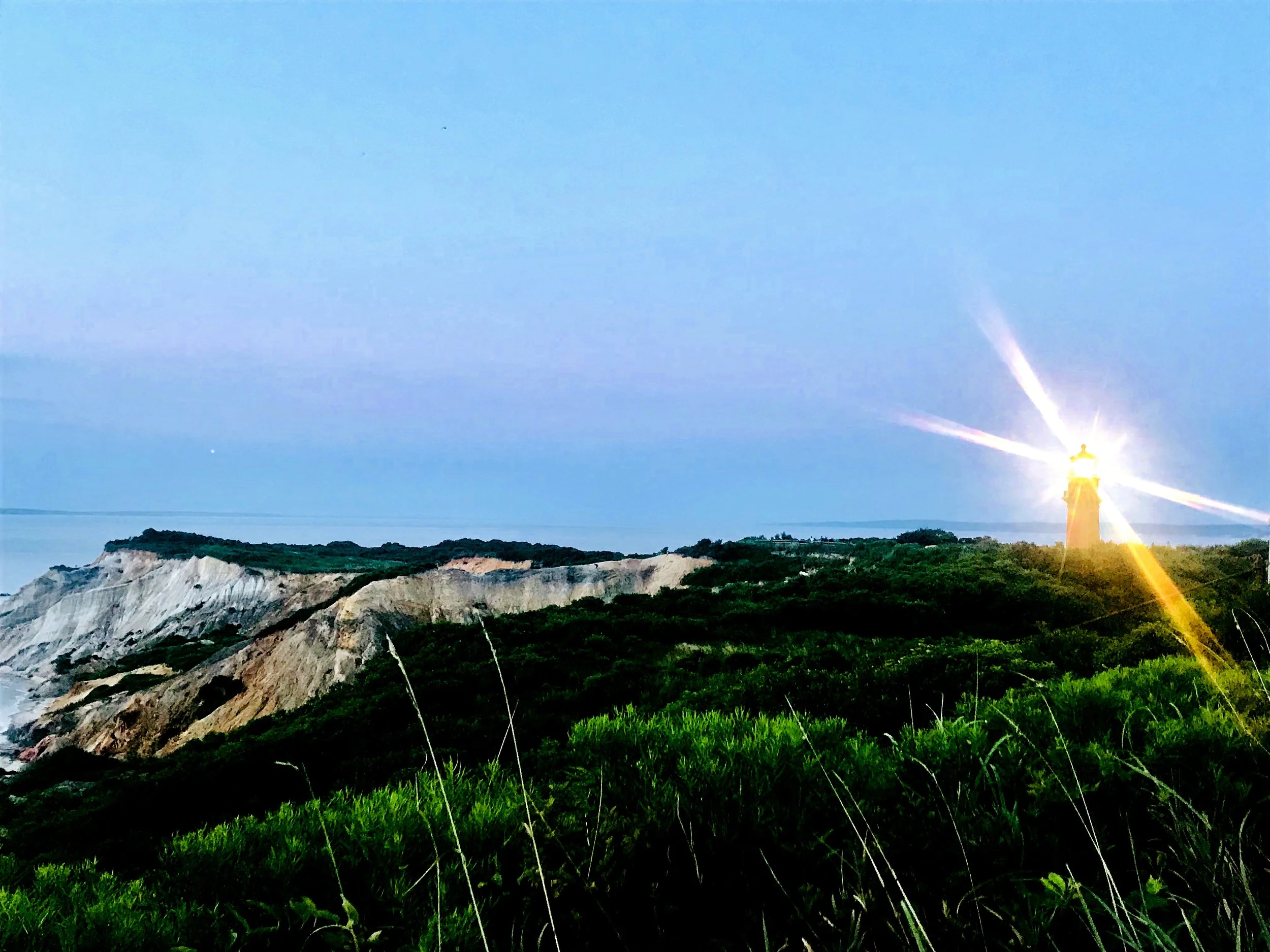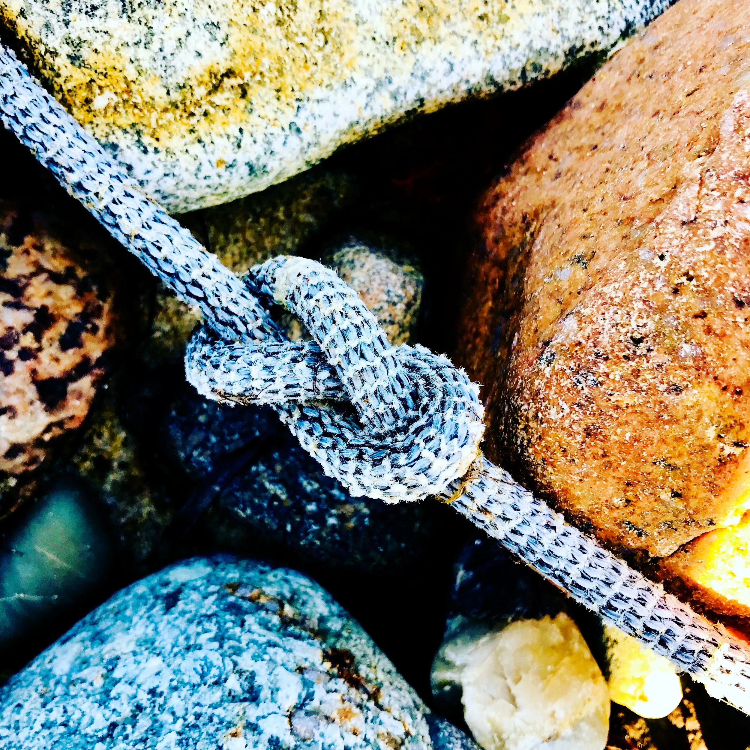 Working backwards on the day, it ends with an open air drive out to Aquinnah from Vineyard Haven where we waved farewell to my son and his fiancee as they left on the ferry from their time with us. This will always be the summer of their engagement; the summer I was turning sixty in the fall; the summer the youngest was twenty-one. My husband and I drive, alone, to the lighthouse to watch the sun go down and talk it all over so far: how they are coming and going in our lives now like the tides, in and out, here and gone. The sky is pinks and purples over the cliffs and the Gay Head Lighthouse beams its light in our direction, just a flash, and a turning away. This man, our son, a baby not yet born was with us when we said our vows that summer thirty one years ago. On the beach this morning, alone with the dogs, I found this sea worthy rope washed ashore, and this knot, tied in a figure eight, for infinity, for lasting, and everlasting ties. Our drive tonight, it started as an almost argument, those moments of stress or irritability that creep into transitional moments, inevitably. The drive starts in hurt feelings over nothing much. Silence, stewing. It's so easy in a moment like this to let good will unravel into tension, tension, and here it is, full blown, a fight. Over what? Over you hurt my feelings so I'll sulk and not say sorry, not let you say sorry. But this isn't how we want to spend the ride in the open air. Sulking. Sorry works. Say it, a word. Mean it, too, you can choose to mean it. Sorry works when you want it to work. When you want to see the sunset with the one you love the best and be grateful for the evening, and the knots. The knots staying tied.