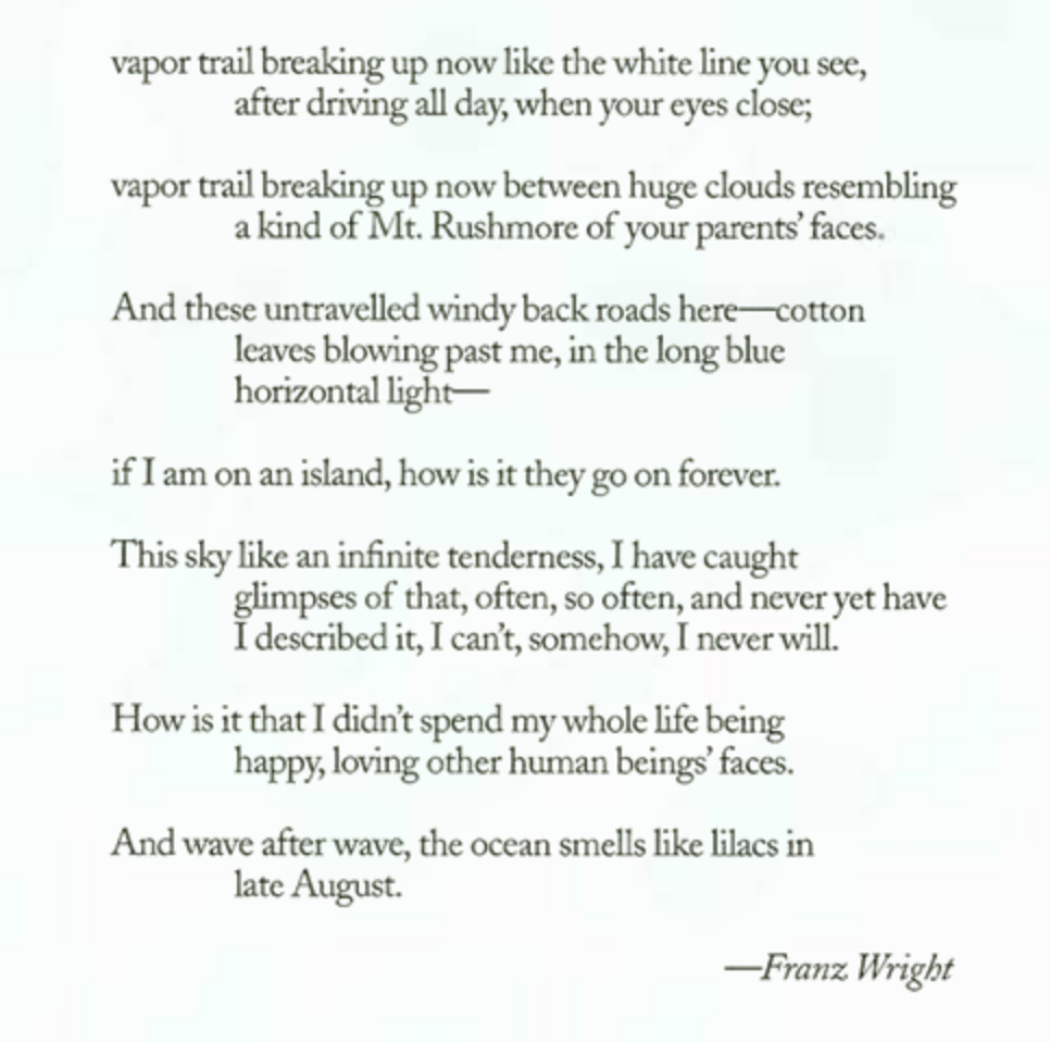 Digging around the Internet I found this Franz Wright poem, from his Pulitzer Prize winning book, 2004, "Walking to Martha's Vineyard." It's a dark poem I want to think about awhile. Franz is the son of the poet James Wright. This poem was published in The New Yorker in 2002. Standing in the breeze of Vineyard Sound at Great Rock Bight, in the company of stacked rocks and yarrow wild, in bloom, in sand dunes, I feel like I might begin to understand something about what this poem is saying, "if I am on an island, how is it they go on forever"
