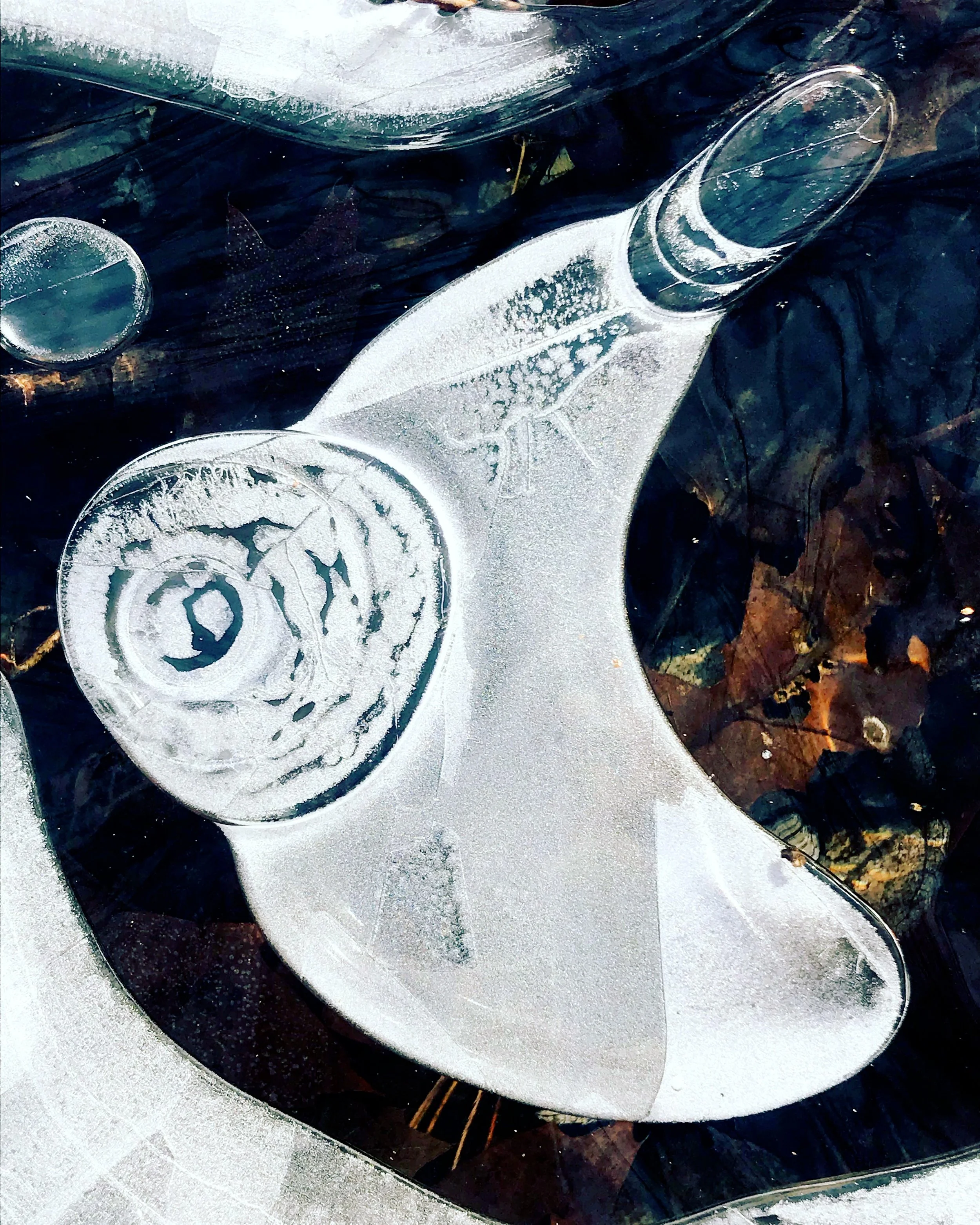 Very cold. And the river is bearing ice, and the brook and wetlands can support my weight, again, so I glide across the glassy surface in my boots looking at the shapes in the ice. I am looking for an image that speaks to me today.