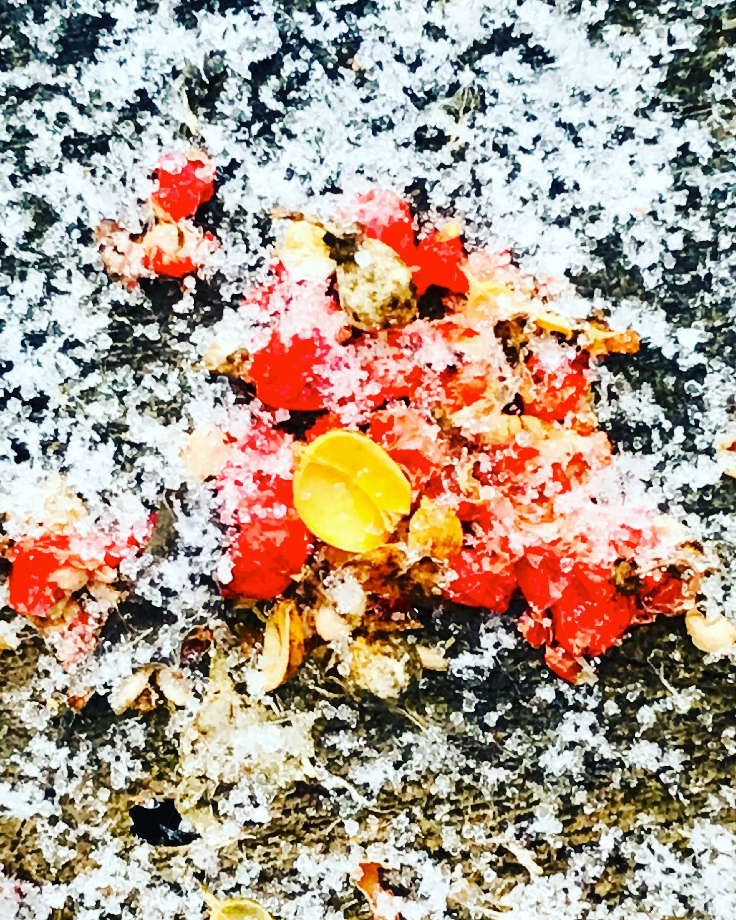 Falling from the clouds, the lightest drops of snow. Dryer than rain, a quiet pelting. The landscape, unfrozen. I walked without energy, out of discipline, more than passion this morning. Awake too early? Just tired? I kept going, looking for pictures in the uninspiring landscape. Some days are just like this. I centered my breathing and talked to myself: find the gratitude, energy will follow. These spilled bittersweet berries are on a log - they’ve been there for days in the swamp. Today I liked them sprinkled with snow. The sweetest part of this day was indoors: the girls, grown up, hanging out in the kitchen. Just before evening, after a day of a lot of sitting, I went for a walk in the blueness of dusk. When I returned home, my youngest was in the kitchen making soup and her two best childhood friends were gathered. All home on college break; their senior year. I get to feel like a second mother to these young women, having known them intimately for twenty years and more, through every stage of their young lives. We told stories and laughed and I fed them and their high spirits and affection fed me. Having the three of them in the same room, the kitchen, of course. Did I say sweetest part of the day, laughing and hugging and feeding and back rubbing them? Yes.