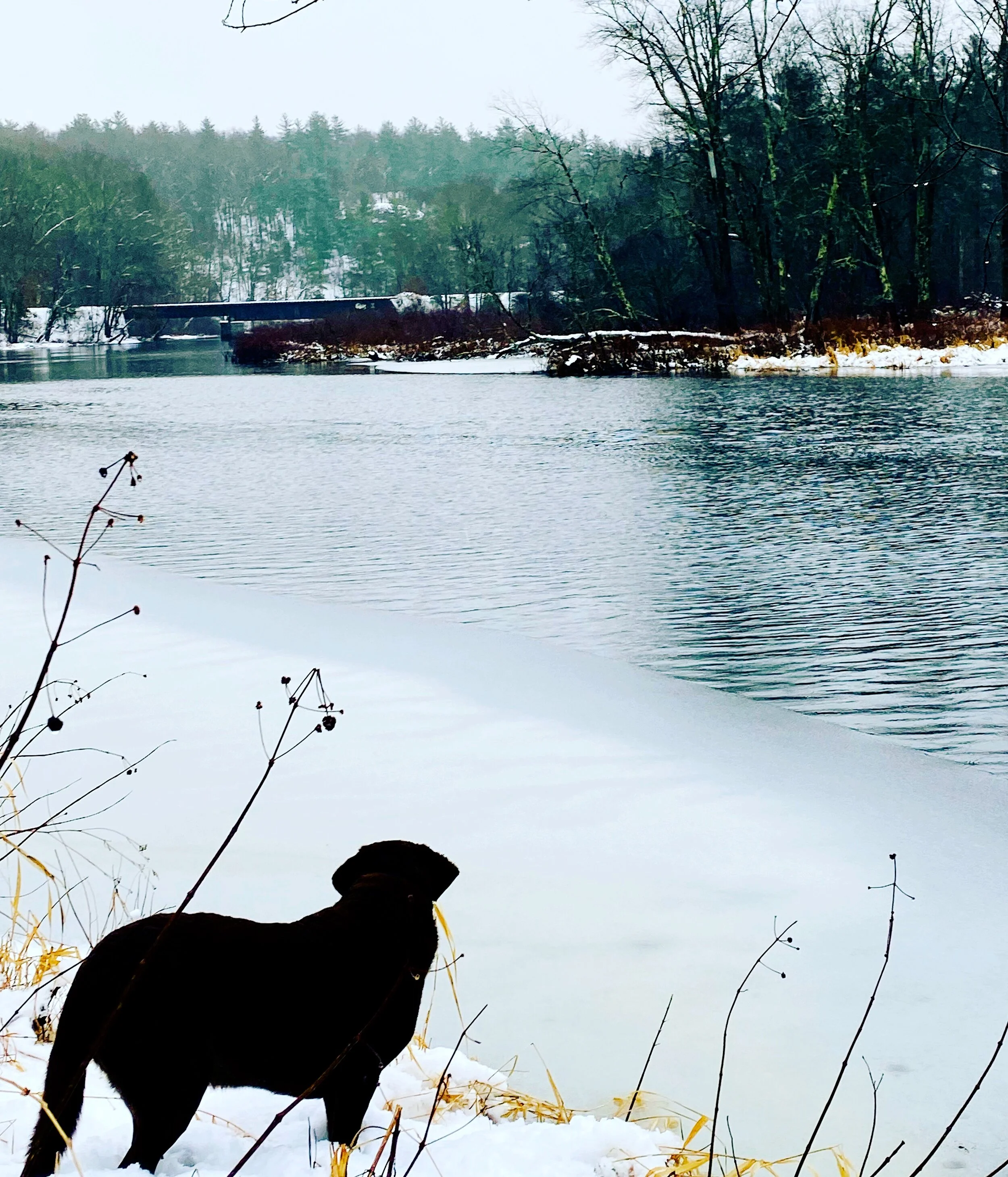 Early, I wake, expecting soft snow, a fast ski across the field, wonderland. It’s raining over the six inches that fell. Still, we go out early into the wet, we don’t want to wait for the weather to change. I put on snowshoes instead. It’s a hard slog. Fairly unpleasant, in fact. The landscape has changed, though. The dead leaves and sticks are covered with white. By the time we give up and go in, it’s snowing again, very lightly. It’s the birthday of my first child, my son. After we go in, we don’t stay out more than an hour, I make my son an omelette. It’s gorgeous. A wondrous birthday breakfast. Snow falls through the day. After dark, I think about going out for an evening ski. But I’m tired. And I want to give my son a gift. Every birthday, I give a massage. By the fire, I set up the table. Light the candles, and put on the relaxing music. The room is dark, flickers by candlelight, and outside, the yard is lit, the snow falls tenderly and in the glass framed tree of life the flames of the candles dance. All day, before this lovely time, I worked on my poem for Monday night workshop. It was hard to decide what poem I’d bring, but then I opened my notes I wrote from my travel photo prompt, the photo of Frank walking the Charlie in the Montreal pre-dawn. I cull from all my raw material a decent first draft: it’s too long. But there are parts that are working that I like. My prompt worked. I bring it to the workshop tonight. Instead of driving in to Cambridge, because of the weather, the workshop is held on Zoom. I get some helpful feedback; and find, I think Tom’s right. There’s a poem within this poem, there are two. I see how to split it. It’s still snowing, and even more snow, another storm, is expected by morning. I was so grateful, that night after he was first in the world, and I had managed his difficult birth, I was relieved he was alive and well, sleek cheeked and soft, a boy to grow up in my life. He’s such a thick and meaty guy. His head holds the weight of a cannonball in my oily hands.