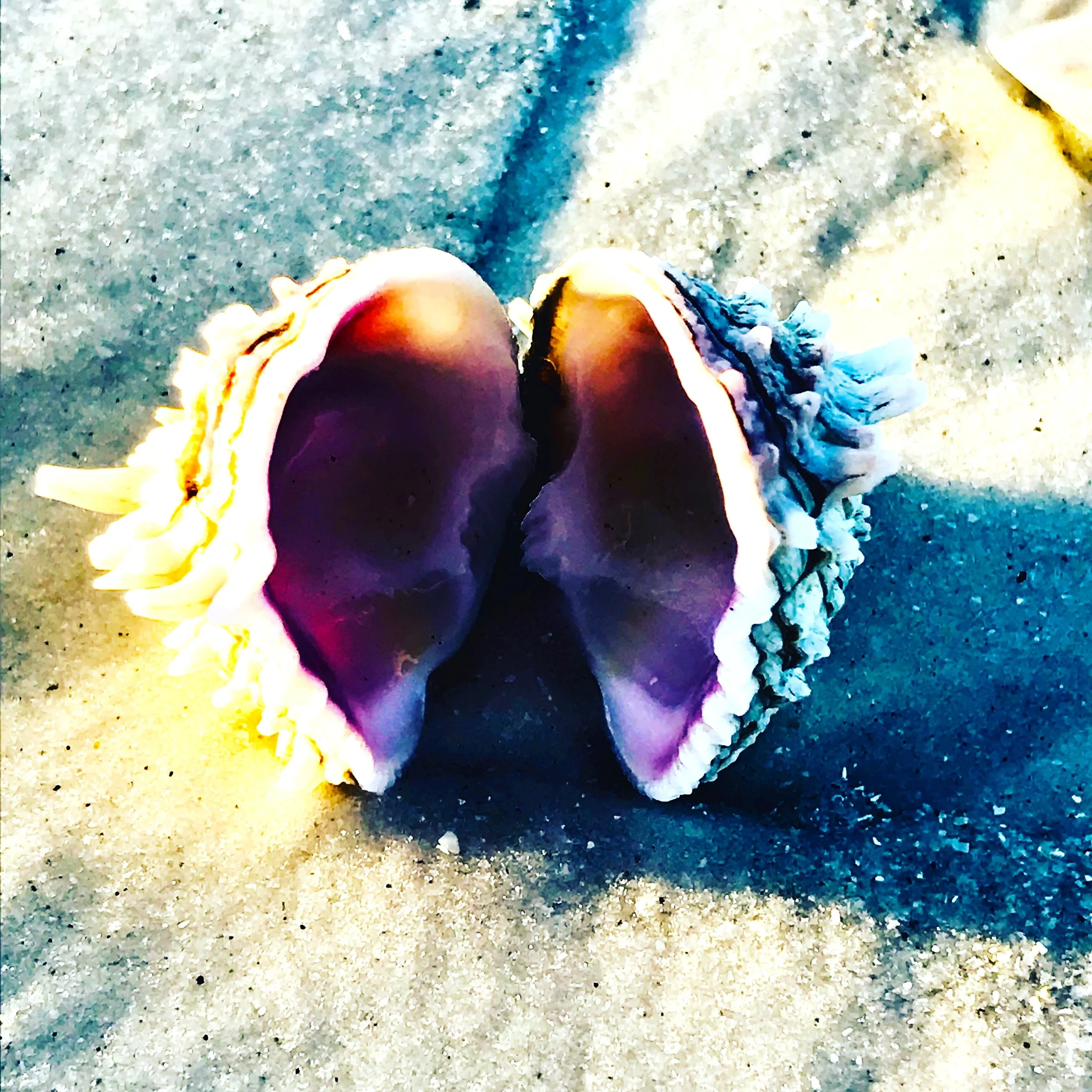 It’s warming up and I walked early in the sunshine this morning. Awake at 5:15, happily, so I could get the boarding passes online for my daughter’s early, early flight tomorrow. A lot of shell pickers came out early in the nice weather. I saw some gorgeous shells washed up from the night. My favorite was the spiny jewel box – lucky for me to find the bivalve still intact. Then, I saw a figure looking up at me, half buried, half revealed in the sand: she seems like a priestess, wearing a white headdress and a silky blue robe. I worked on my post card poem project for my Monday poetry group, because I’m so excited to take the weekend off to look for shells and play with my daughter on the beach.