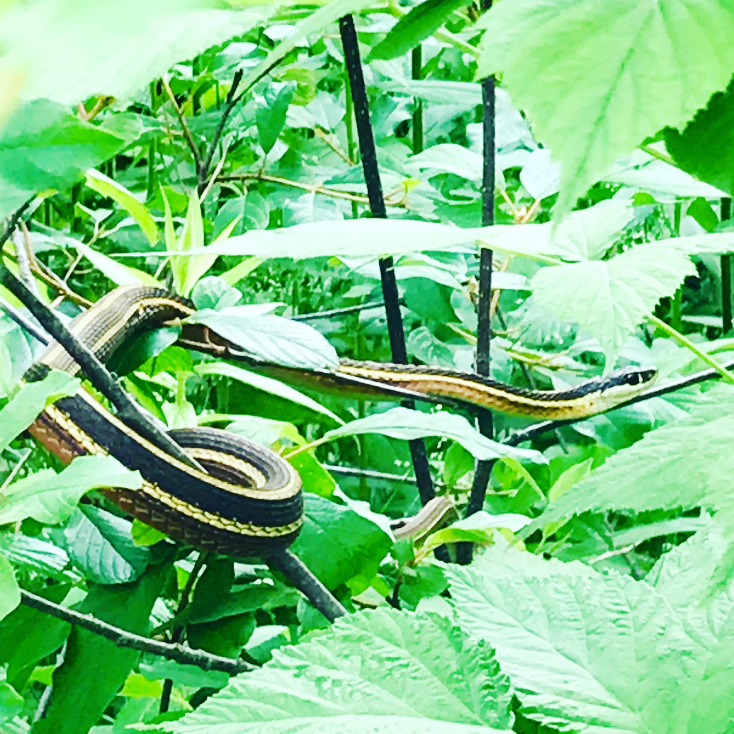 My friend texted me when I woke to go paddle boarding, but I was bleary eyed and couldn’t act that quickly, so I walked instead, and this made Charlie happy. It was cloudy and cooler and I was distracted for the first bit, not seeing, because I took a phone call from someone who needed someone trusted to listen to her venting and I was happy to be that listener and to understand and encourage as I walked in the lush landscape. I believe she felt better when we ended the call, and I did too, having had the chance to be useful to a loved one in need. Then, I began to notice the morning very intentionally. I stopped on the trestle bridge, entranced by the reflection of the clouds and how the picture made the drop to the river seem terrifyingly high when it is only fifteen or twenty feet. The clouds made it look like oblivion. And then I crossed the meadow and returned by the tracks, and now I was on the phone with Frank, heading home from his morning meeting, saying hello for the first time this day, and that’s when I happened to notice this common snake just resting as pleasantly as could be on the branches beside the tracks. Such elegance and relaxation, it caught my breath. And not because I was afraid. I used to be terribly, terribly afraid of snakes. Phobic. Still, I wouldn’t want to hold one, not in my hands, at least, but in my gaze, yes. And this one allowed for that. We didn’t bother each other in the least. And I was so surprised to catch this snake in such a balanced position, wrapped in its habitat. In the late afternoon I crossed the yard, the field, to the river, I was going to do some gardening, but settled for a walk with Frank in the wet grass as the most fantastic light breeze blew through field across our bare arms. Tonight, with the windows open wide, the breeze blew and then the rain came, heavy and heavier, and I shut the windows reluctantly, and the sky glowed a mustardy yellow. Now the rain has stopped and the windows are open again to the croaking frogs. I love that John O’Donahue quote above. I found it today while seeking a different quote about friendship for the closure of our Farm Pond Writer’s Collective for the summer after tomorrow. Because this is what this almost three years of my daily blog has become: my answer to what did I really see this day?