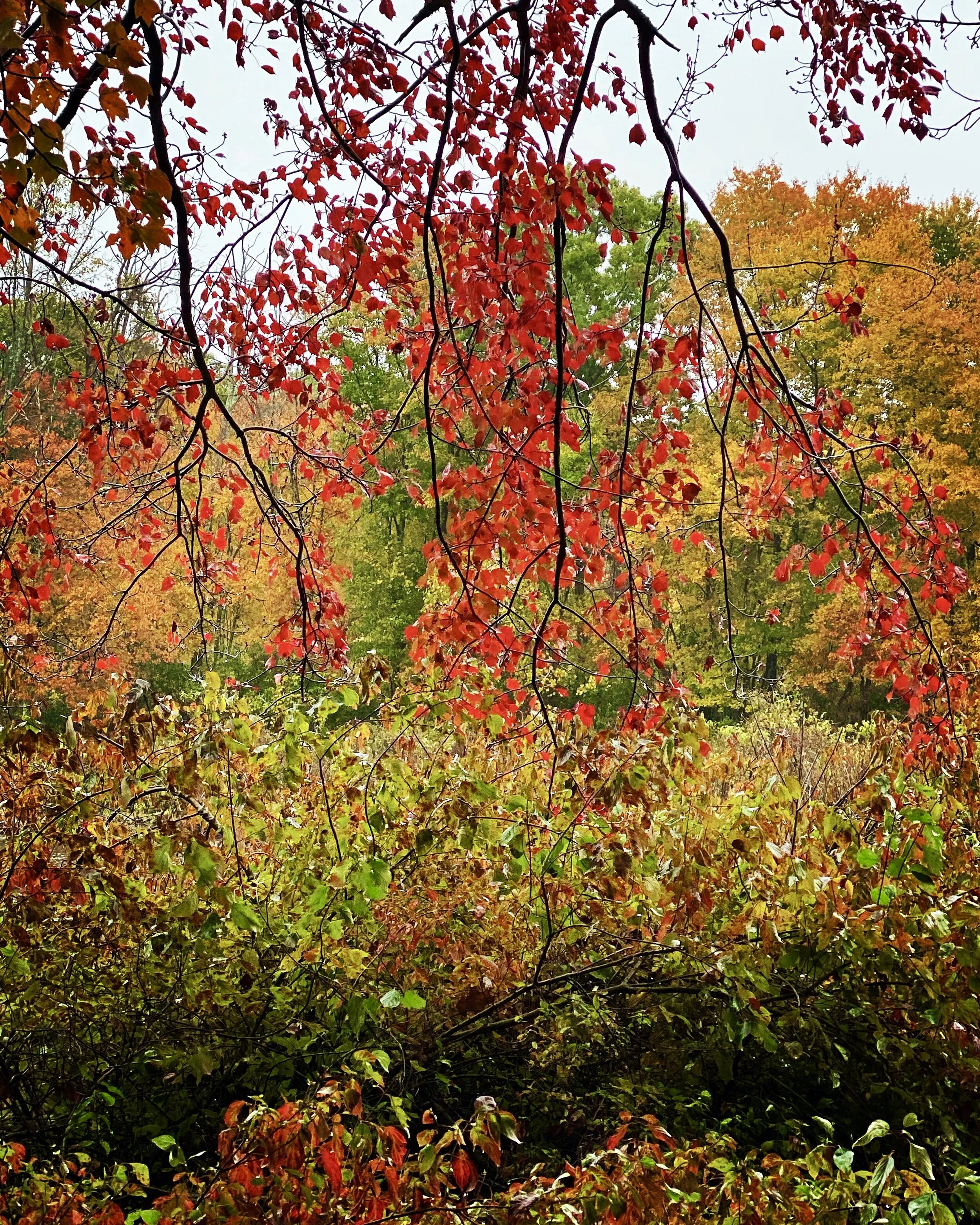 Wonderful rain. I go out eagerly with Charlie. I have a busy day and I walk toward the river across the wet meadow thinking we will not stay out long. But the foliage is seductive. The river is colorfully drenched and appealing. Everywhere I look is spectacle. I keep going. I am taking it so slow. I have so much to see and appreciate. We get soaked, and happily so. It’s warmly inviting. We cross the river over the trestle and go into the wide open meadow. I forget so many things in the meadow. I just want to see everything. There is a day, maybe two, in autumn in New England, where the landscape is ecstatic. Today is one. The milkweed in the red leaves, pods like wings of birds. The yellow berries making wreaths in bushes and vines. The trees reflecting deep bruisy colors of light and dark on the surface of the Charles. I forget there is a baby to be born or work to be done, I am in the field of wet, bent stalks of Queen Anne’s Lace surrounded by lit up trees. We keep getting wetter and I rub Charlie dry with a towel before we go in. I get both my groups coming up this week prepped and ready. I read the wonderful rite of passage stories posted by the participants in my How Pictures Heal course. I make a nice dinner, we sit by the fire, I go to an IWWG Board Meeting and then run my monthly critique group: more lovely writing and sharing. I hardly see my daughter today, we get a few minutes here and there to check in. Everyone in the house is busy today and the rain, so necessary and desirable, pleasantly falls through the day. My son, my first born, he took his time, his own sweet time.