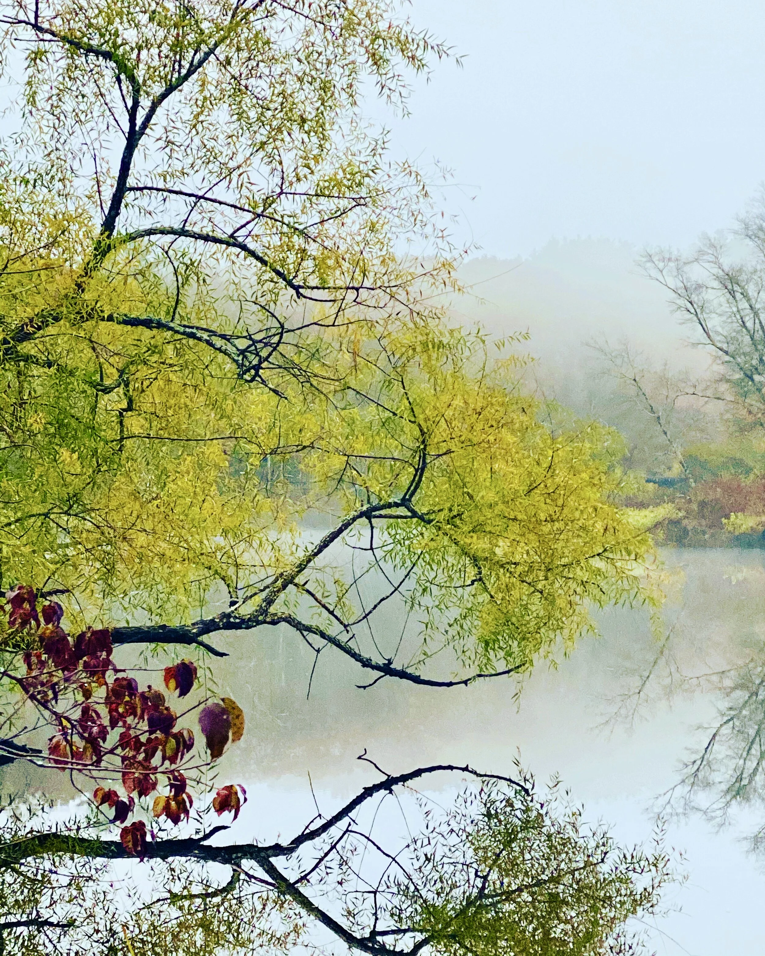 Mysterious, synchronistic things happen in the woods. Even in rain––especially in rain? Such a wet walk, all the leaves dripping, and the color going, and the brown leaves slurping instead of crunching, they are soaked, and so are my feet. There is such a muted light, because days are shortening and the trees are letting go, letting go, and the snow is coming, the frost and ice, and cold. For most of the walk, I’m afraid of my mood. I want to be feeling spontaneously cheerful and grateful and eager outdoors. But am I only going through the motions, much of the way. Except when I am in the wetlands, and the straw under my feet is dry enough to let me creep through the cattails close to the winterberry, so bright, this food for birds. It must be exciting for the birds, these huddles and clusters of berries in the middle of the cattails, so hard for a human to reach. I need to charge my body a bit, move up the steep hill and down, I go up and down twice, and I head back home. By the brook is commotion. My dogs meet a neighbor dog, they must whine and growl. The dog’s human is there too, we must stop for hello, except I’m in a hurry to get ready for a client appointment and would avoid the conversation if I could. But I can’t be rude. We say hello, we exchange small bits of neighborly news. The dogs sniff each other, they’re friends. The brook is running, the birds are singing, her face is falling, cracking, trying not to. I have asked how she is. Not good, she doesn’t lie. So, this is a conversation that will happen. I listen. and I have some thoughts toward hope. Not superficial ones. But ones that I feel because she is telling me the truth, and these are some things I believe might help. And her face lifts a little. Her eyes flash when I say: “phoenix rising.” A new beginning, some day. She tells me a bit more. I tell her a bit more. She is accepting my suggestions. She is claiming some hope. But, more than that. See how my mood is transformed in this rainy wet woods. I have some ears and words. We cannot hug; there is a pandemic. But the trail between her and the brook is narrow, and I pass her, and feel it, the way this moment matters so much, to both of us.