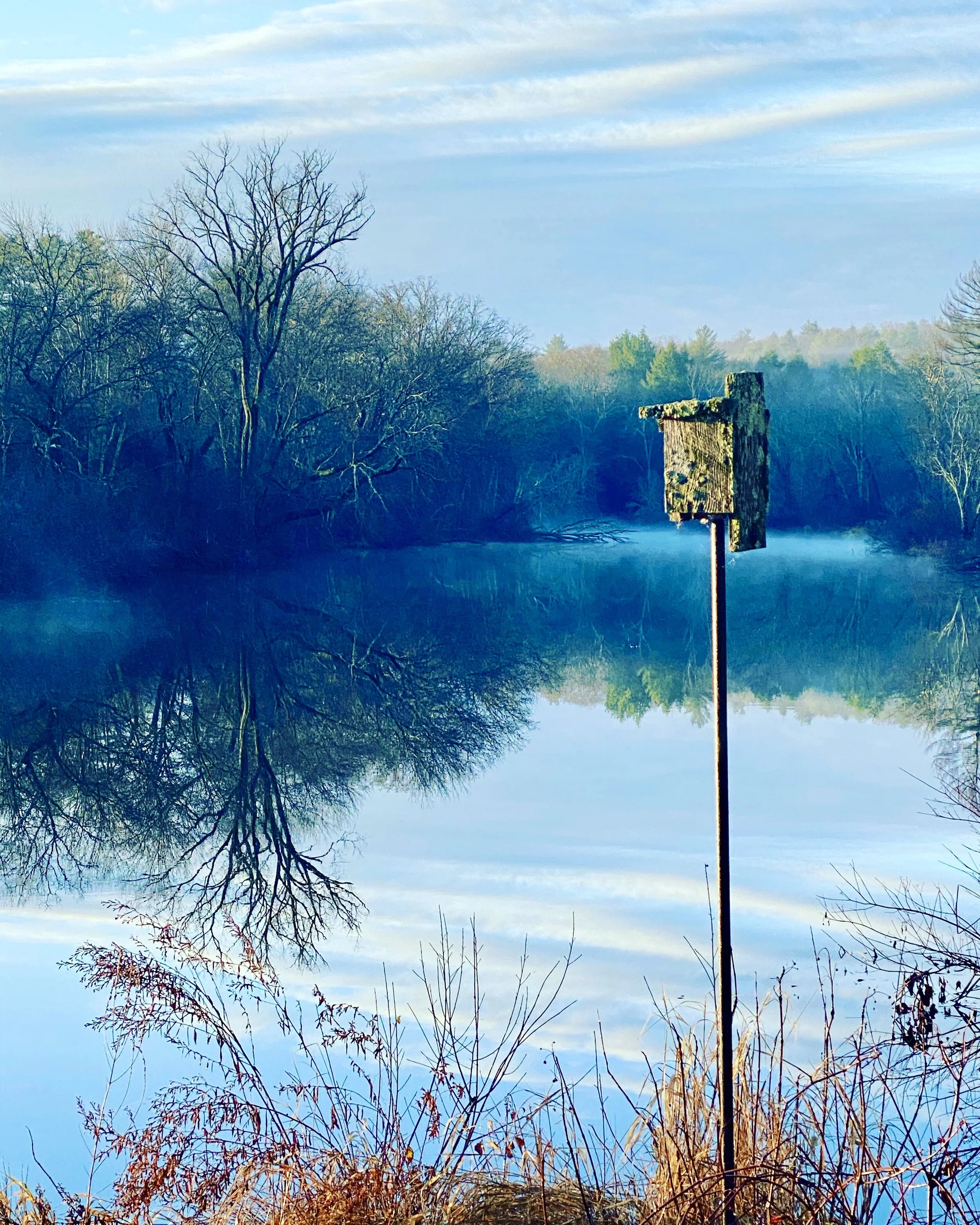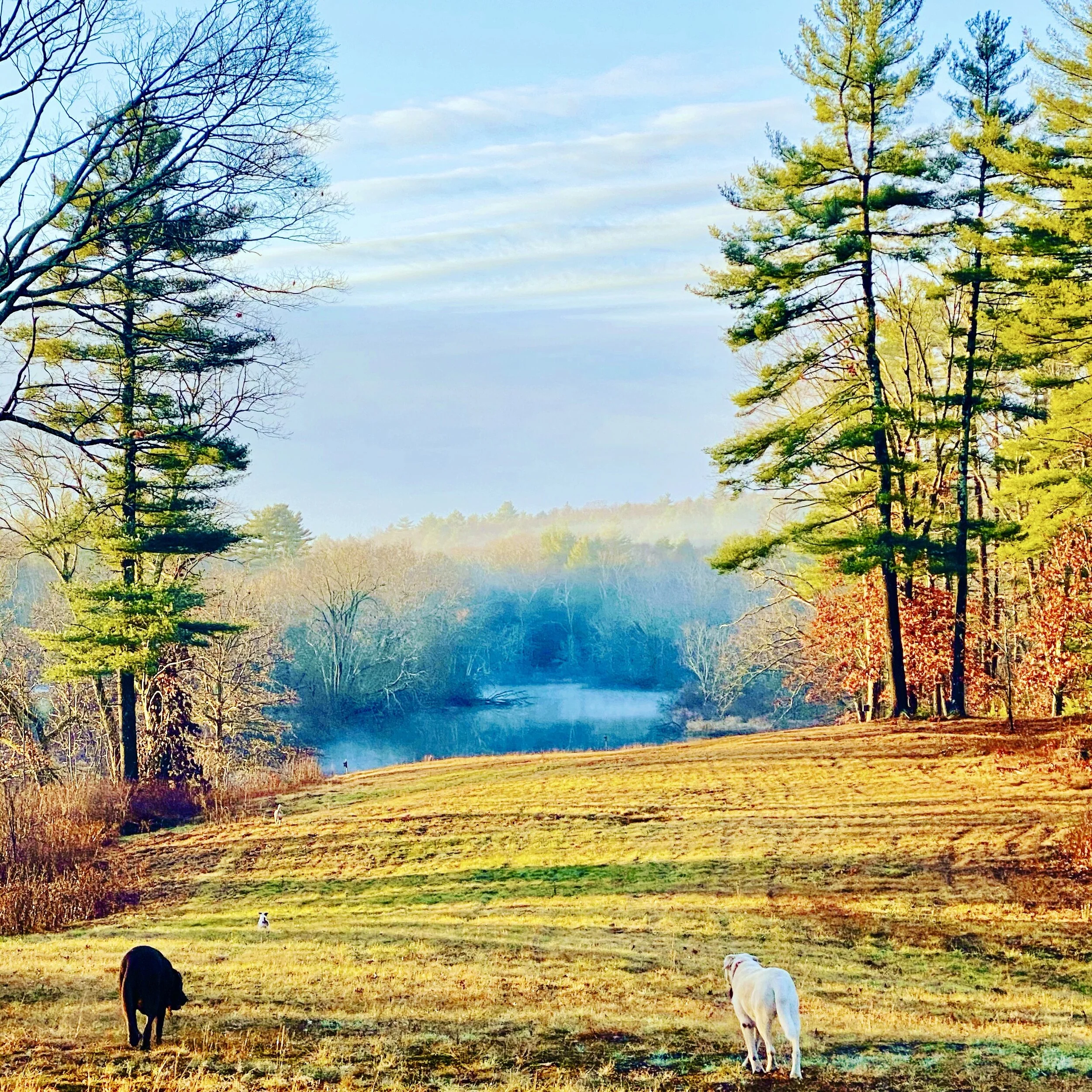 The alarm was unwelcome. I snoozed. But I wanted to have a welcome home walk with a friend, and so I got up. Got out the door quickly, with both dogs. It was wet and mild and I walked fast to the meadow to meet my friend and her dogs–our dogs reunited with joy too. I love this picture, above, the mellow, cheerful, welcoming tones of sunflower gold and green-blue mist and pine green and rust. I love the day after a holiday; the satisfaction, the relief. We walked and talked so briskly over all our concerns and successes and things we’re clear and unclear about. I felt so productive and positive and energetic today! I got so much work done on projects. And, a highlight, an hour of pure play with a grand nephew who visited. While my niece and daughter visited, I engaged him, or, he engaged me, with the joy of our yard and woods. We fished the dead leaves out of the frog pond, but sadly, had no sightings of frogs or turtles. We walked to the river where he had to relieve himself. We walked the wooded trails of my property, which to him felt vast, limitless and I could sense he was a bit afraid of being lost. But we played imaginative games, pretending we might get lost and need to spend the night. We’d use my coat as a tent. But neither of us had matches on hand for a fire, so he knew we would have to rub sticks together. I let him trust his instincts and choose the paths that guided us back to familiar territory. We had many, many running races up and down our sloped yard. I laughed and laughed and so enjoyed his company. My daughter said my niece probably very much appreciated it. But the pleasure was all mine. I got to play the way this little boy plays and I liked it.