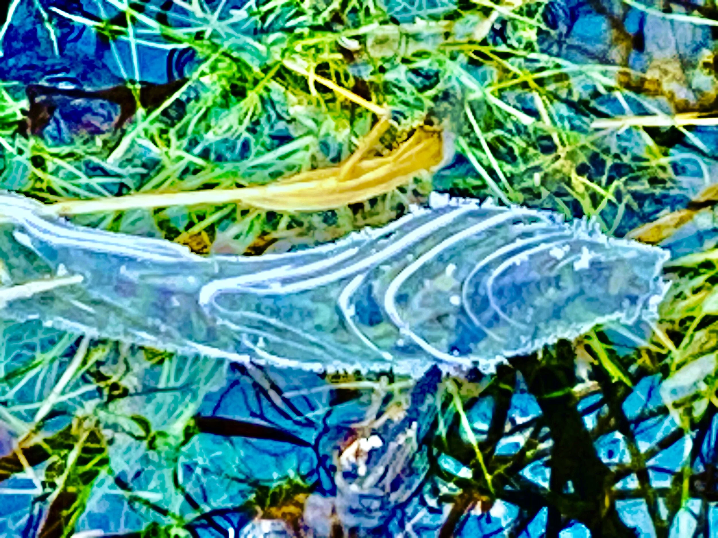 A lazy sunrise: I see the lilac striped clouds over the river from bed. It’s pleasant outdoors. The river’s edges have thin, lacy ice. It’s just me and Charlie. There is still snow, messy, half-melted snow. I find a lovely ice fish swimming in the puddled grass in the wetlands; she reminds me of summer in her blues and greens, my favorite summer colors, and this is cheerful and refreshing. But, even more so, hilariously, I find, on the edge of the Charles in the brush, a washed up frozen rubber duckie, just the one you would take to your bath to bob on the surface and keep you company.