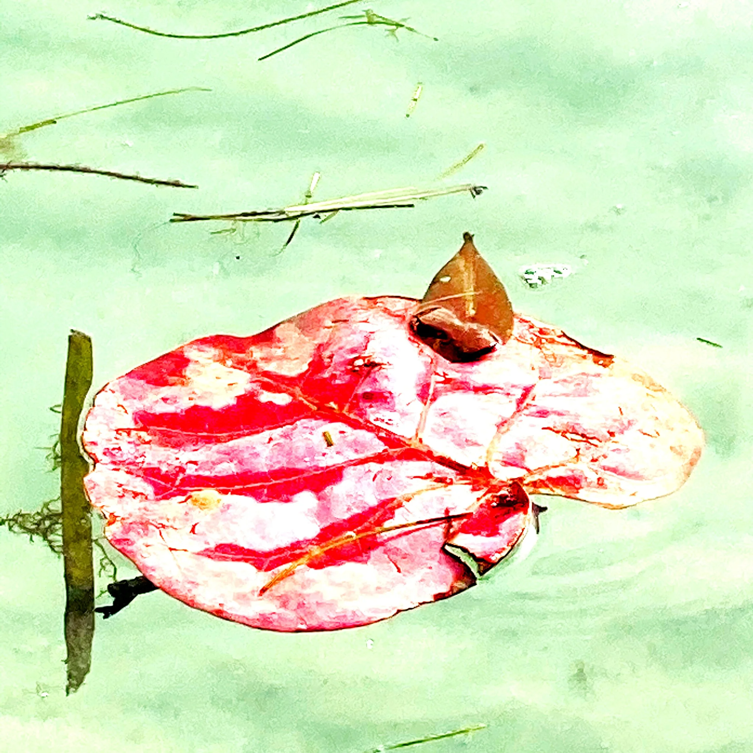 Up later than usual; awake in the middle of the night. It has grown very warm and sunny; the wind has passed and my morning walk is soothing in the sunshine. Frank calls from the road; he has left for a meeting in Miami, early, and two hours in learns the meeting is canceled. He is coming home, and I’m glad. I feel a low grade sadness, and try harder to focus on the beauty of nature around me. There is a bright pink leaf on the green surface reminding me of gentleness. At Longboat Pass Bridge I see an unbroken, fresh washed up sea urchin with its beaded test. This is a simple, glorious treasure. I appreciate, in my picture, how pretty it is, delicate as a pin cushion. The snowy egret seems to say, enjoy the froth. Someone has left a lean to on Beer Can Island.
