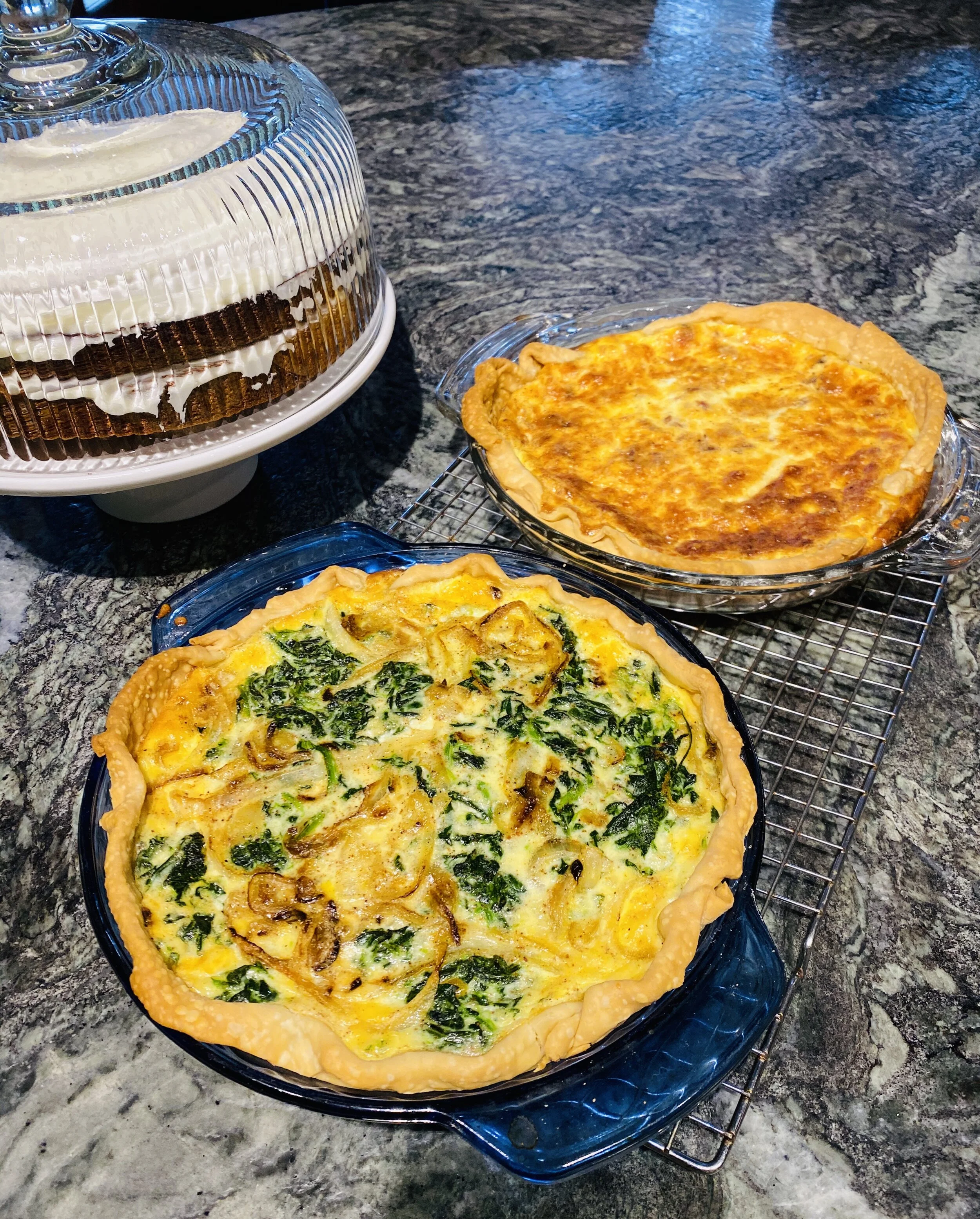 Spinach and cheddar quiche, quiche Lorraine and applesauce cake