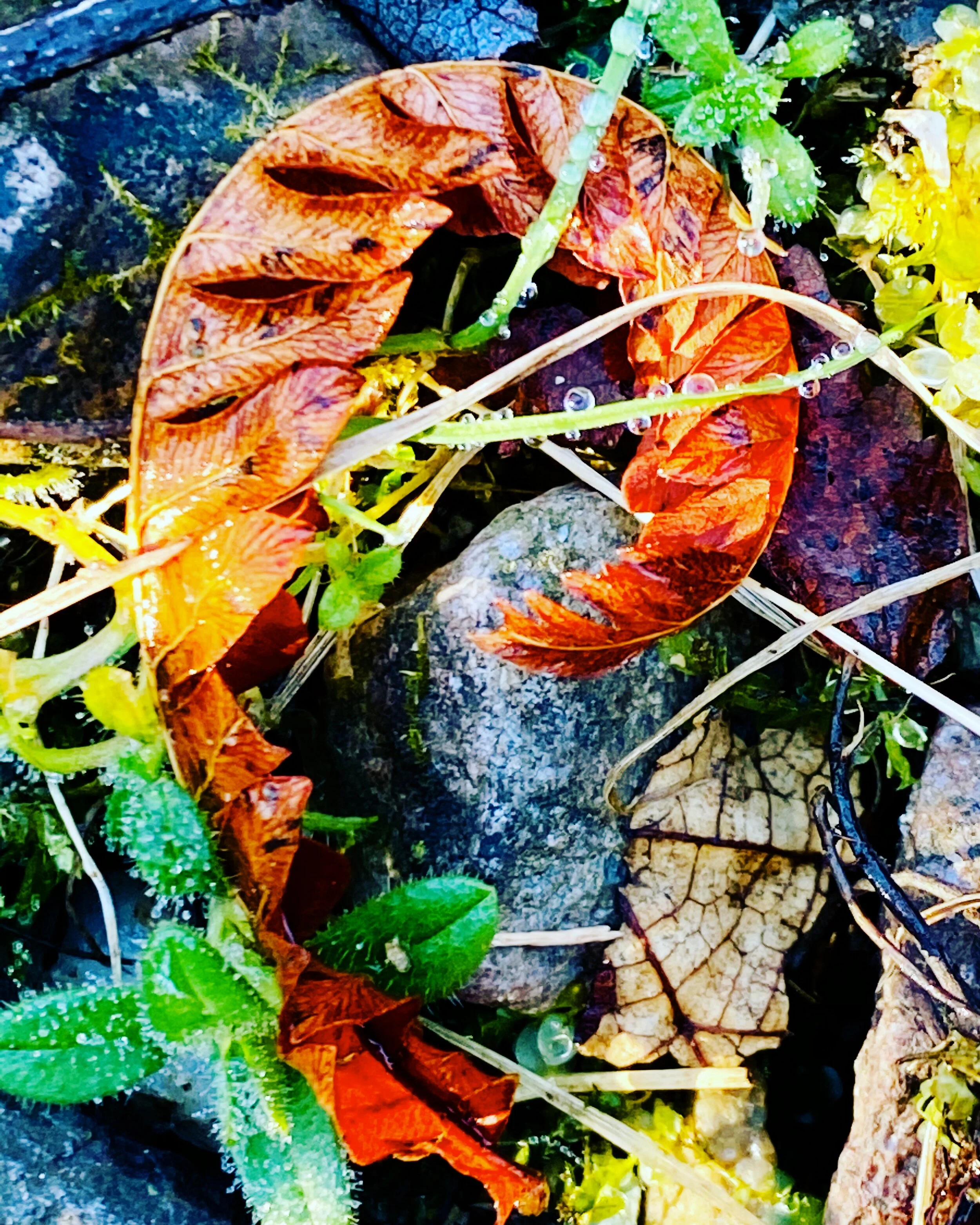 I went into the Sunday morning walk without enthusiasm to be wet and cold. I felt resistance, boredom with the woods and my walks in the landscape that began to be spring and then halted with snow, now melting. So, I breathed into my resistance and grew quieter, walked more slowly. I let go of my resistance and my frustration and just tuned in. What could be here to be seen of interest to me? What can I find that is beautiful and mysterious? My whole body and spirit and mind dropped into this question. So I saw the chunk of old tree, this design in the wet bark. This, this moves me, I thought. And I knelt down, and then I had no desire to be anywhere else but here and now, in this color and substance and texture and accident of design, made like black ink onto the easel of old bark dampened by spring snow. I kept going into the peace and interest in the morning woods, finding my way. A golden wet old fern curled into a question mark. A new leaf lit by sunshine. A droplet of water on a branch holding a world I cannot discern, but I want to. All this charmed me and more. It’s Sunday morning in the sanctuary. My spirit renewed.