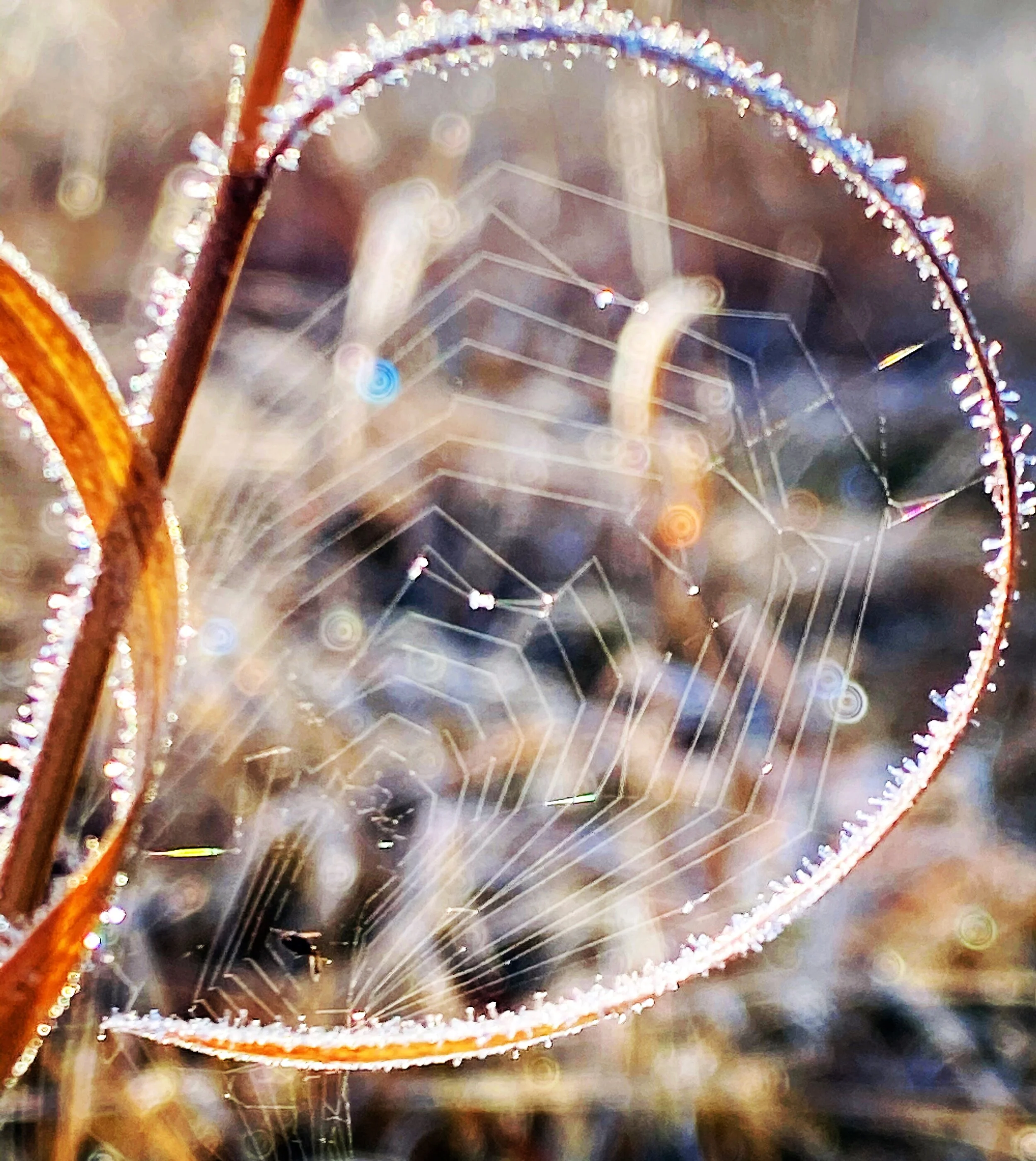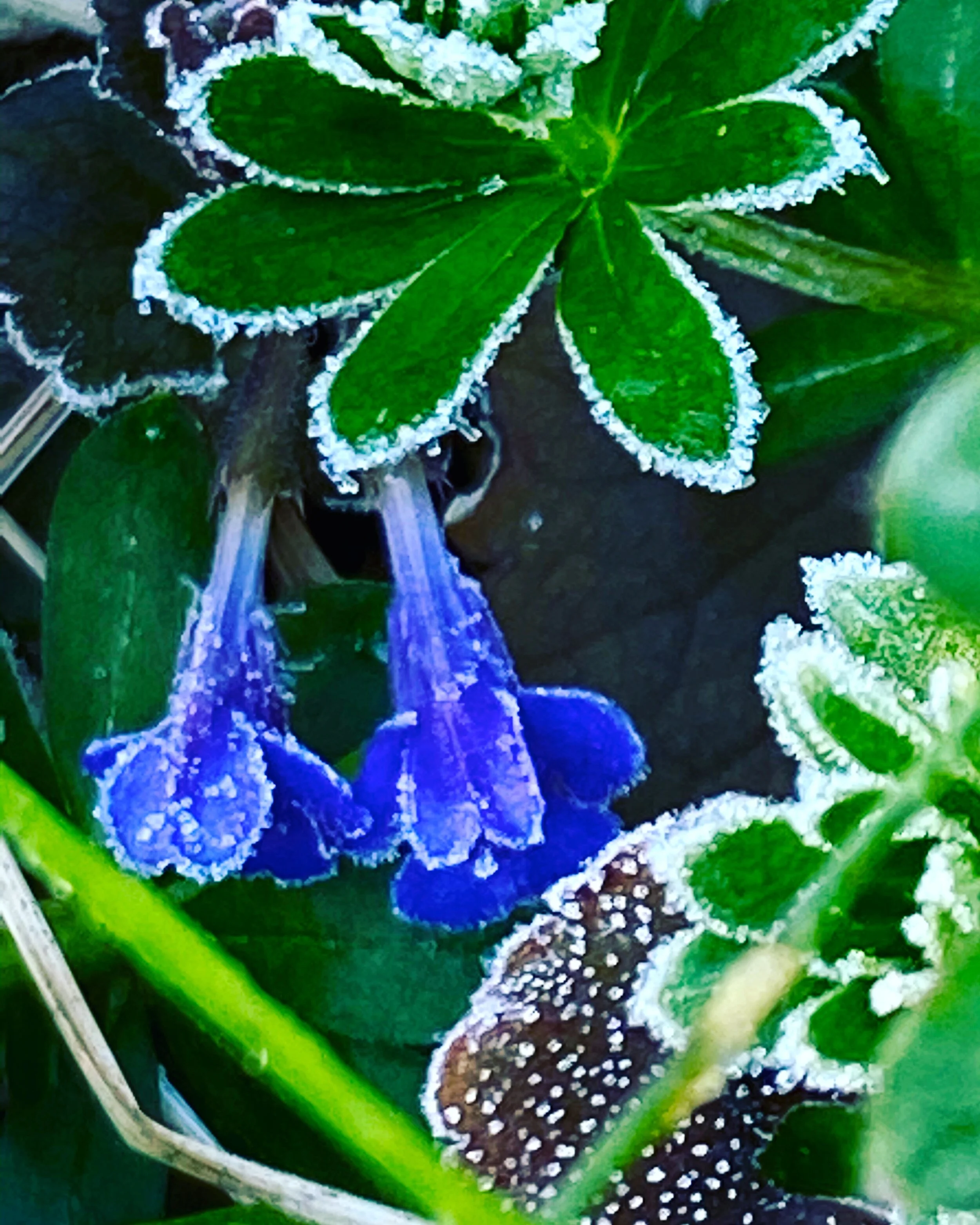 Yes, into frost over the meadow. I do not see the web until I stop, bend, look. What caught my eye, what made me want a closer look was simply the blade of brown meadow grass, in a frosted circle. And then I saw the spider had found it too. Who knows how I knew there was something exceptional hidden in the little world of this blade of grass? How fortunate that I looked. Yes, it is a lesson I learn, a lesson of reward for me, more than once this morning. I cross the trestle bridge; both dogs trot along behind me. We have heard the 7:00 a.m. train whistle so we know we’re crossing in safety. Once again, spring is tiny and low to the ground, almost hidden and shivered in frost. I bend for a close look because the frosted green leaves are so cheerfully edged in white. And there! I see there’s more––the purplish blue blossom, the cheeful-ist of all. There is a lot of delight in my morning walk. A busy day, meetings on Zoom, two of which I’m producing for writers and all goes well. There is so much hope and intimacy when writing is the topic to explore. When I am done tonight, and leave the computer, happy, satisfied. and very tired, I find the living room full. No one has gone to bed, and I am happy for the cheerful welcome and warmth of family. And the most perfect chocolate chip scone, baked by me in the late, late afternoon.