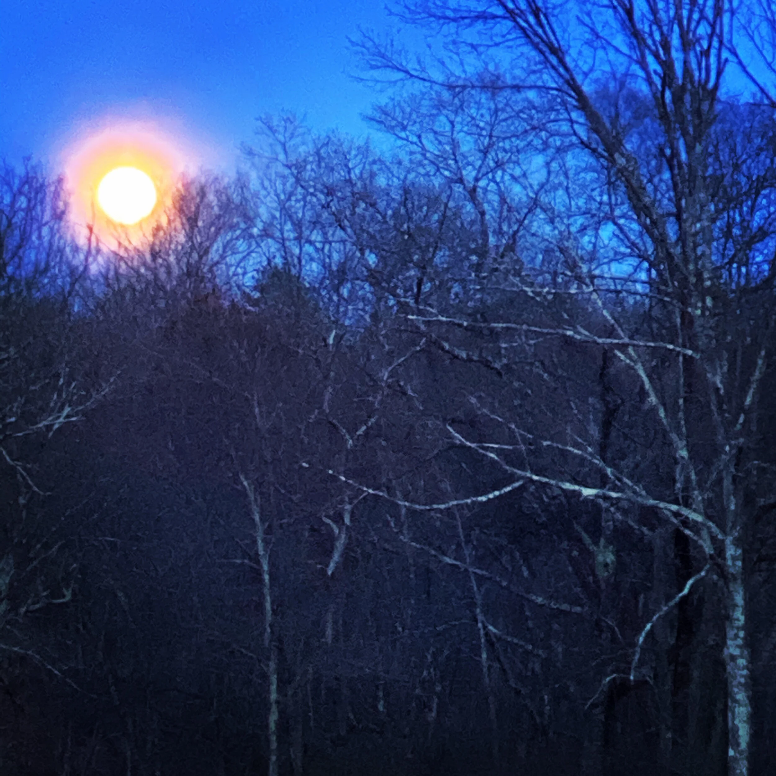 3:00 a.m. wake up into a beam of moonlight on my head through the window and I feel grateful to feel its charge of energy on my forehead, a kind of blessing. Later, the sun beams on my back, heating me like my walks on the beach not so long ago. I feel like sprinting and charging through the woods with sunshine energy. I cross the trestle bridge and walk through the meadow along the river, then cross the street into the far meadow where I can be with the buds on the trees and the far reaching sky all in cloudless blue. Such a lovely old nest I find, and I see a bluebird fly up onto the bare branches of an aspen! What a gorgeous day on this earth to be walking. I take my time for a rainless day. Today I have meetings and work with the IWWG, and I also think hard and consider some fresh ideas about where my letter project is going and I feel re-engaged, having read some Mary Ruefle erasures; she always gives me insight and enthusiasm with her imagination and humor and vision and voice. April fresh I feel today and humbled and grateful for the bounty of this good day. Tonight, I meet with my poetry pals from across the miles. Marlon shares a chapter from his novel and Randy a new poem inspired by the pandemic; and I share a poem I’ve been writing since last September and recently revised. We laugh and deeply connect and appreciate all there is to appreciate about each other’s writing. I thought I didn’t feel like meeting tonight and sharing. As soon as I was there with them all resistance evaporated, and I got exactly what I needed. Giving and receiving. Just before I met with them my daughter came in from her trail bike ride in the woods and said, “Who wants to see the super moon?” I ran across the meadow to the river, because I certainly did want to see this amazing sight.