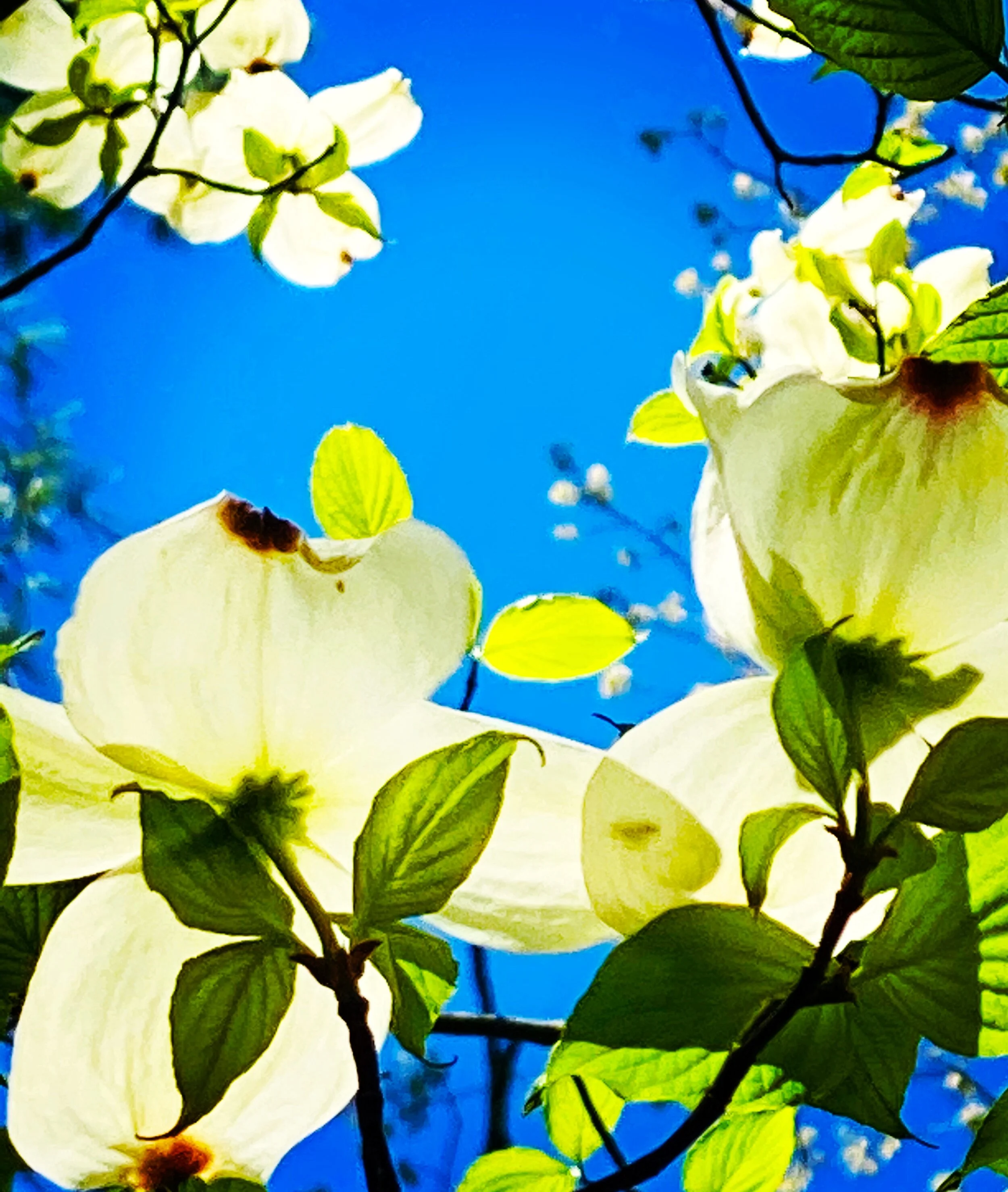 This morning I knew I could walk in any direction and see spring wildflowers and blooms. So, I let my feet choose their way. My feet walked me to the lady slippers, now blooming full on pink. And my feet walked me past the wild dogwood tree, all white with blossom and rusted edges of the blooms, the way wild dogwood goes. It was warm and windy and dry and I felt very busy, with a crowded day after many crowded days, and I thought of all the things I felt a need to do, and I shut out all that mind talk and said to myself, this is what matters now. This is free time to see things, be touched by beautiful, mysterious plants and trees and noise and fragrances, and very much also, to be moved by the view of trees and leaves reflecting in the brook and river and streams, and surprised by the many snakes that shake the long grass and the frogs that jump from the edges into the pools with a splash and the mallards, surprised by us, quacking and flying away. And this turned out to be my first walk. The girls went out in the afternoon and I went too, ready for a break from sitting and writing. We quacked along like the ducks at each other. It’s a wonderful intimacy and conversation we keep having on these walks; settling concerns, talking over possibilities, comforting and encouraging each other, and the dogs too. Always the dogs. Tonight I attended a Zoom webinar my youngest led, on Playback Theatre, hosted by Playback North America and young actors. I taught her Playback, with her friends, when she was in elementary school. And now she’s teaching playback. On my instagram feed of the picture of the dogwood today, a friend wrote: “A feel good picture.” Yes, the dogwood under the blue sky was a feeling worth keeping.