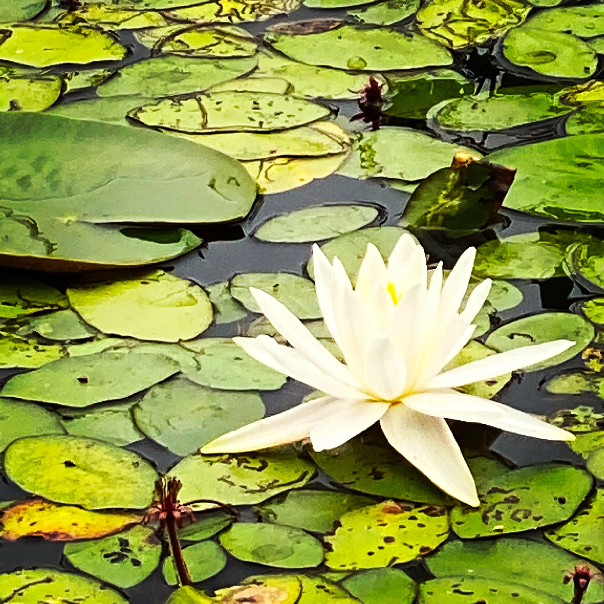 After my long walk with my daughter, under the clouds, while I am about to water the flower gardens, I see a bright splotch of blue, whole, unscathed, unbroken, and unborn, an egg. Stolen from a nest? Dropped? Found. By me. Lonely egg. Nothing to be done. I water all the gardens because there is no rain. Hello Monday. On the walk, we took the way through the meadow, over the trestle bridge, The teens who have been, daily, gathering on the bridge in bathing suits to frolic over the river and jump, have left tons more trash, beach towels, cans and bottles and wrappers. Tomorrow I will bring a bag. How lovely to see the pink milkweed blooms, and the white and pink and yellow flowers on the lily pads in the wetlands.. Instant relaxation. Flower of peace. At home, I work on a poem from the letters. I’m a bit unsure about it. Tonight I take it to my workshop, and I get feedback that’s very beneficial. It’s not quite there. I will go back to work on it tomorrow. There is a skunk, Frank warns us all, living under the garden shed. Oh no. This is trouble. As I sit down to join my workshop on Zoom I hear my daughter yelling in the yard at Charlie––the wild tailed skunk, the strangest skunk I’ve ever seen with an extravagantly fluffed white tail is strolling through the meadow grass in early evening daylight, as happy as you please. Somehow, Charlie noses toward him, but wisely retreats and isn’t sprayed. The skunk waddles into the pines. This is not the end of the story.