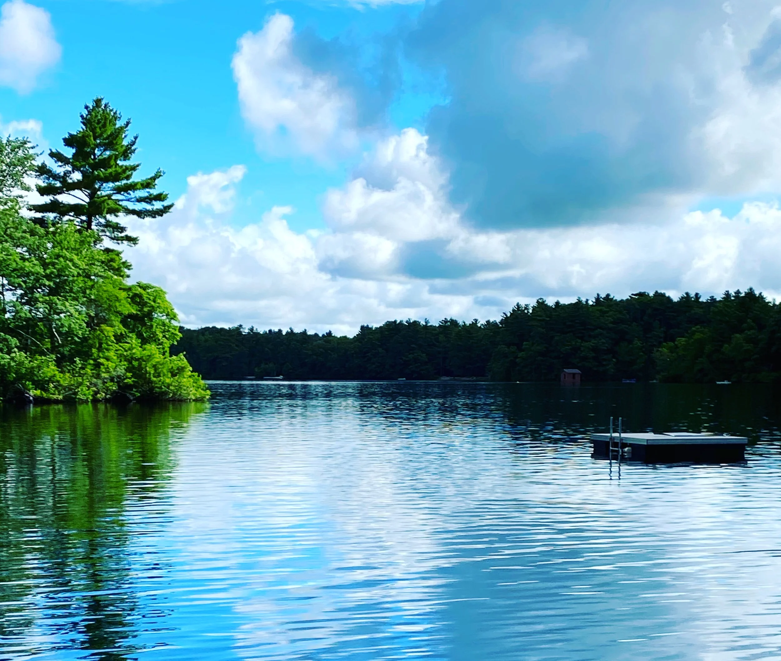 Up early and out into the humid morning, the wet gardens, the river still, calm, high. I walk with Charlie for a morning swim at Farm Pond. He fishes at the shore while I swim around the island, under the clearing sky. It’s July. July and glorious summer. I want it to stay July 1 for four weeks and begin again, July. Charlie is waiting for me on the dock. We walk home through the woods, past the wetlands where the cattails are fresh and the roses too. I talk to my sister, I talk to a friend. My youngest calls, she was home for two nights and is leaving now. I work on the poems from letters again; I am pleased with my progress; pleased that I feel engaged and the project is moving. After dinner, Frank and I stroll with the dogs across the yard to the river, so still, un-rippled, and greened by the reflection of trees. The house is quiet. We are three now, not five, for dinner. I feel peaceful, un-rippled, at peace, like the river, filled up.