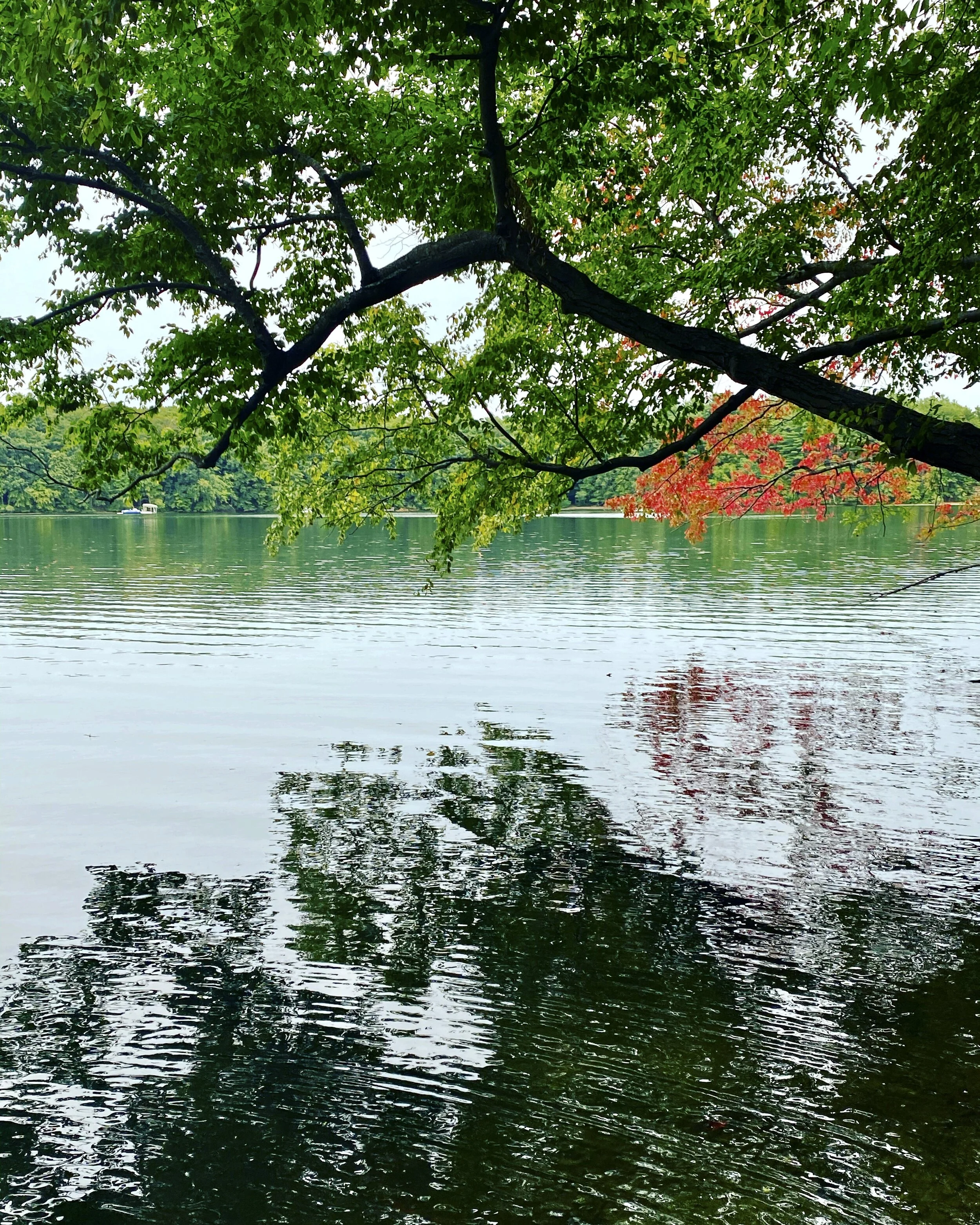 We were both awake for no good reason just before 4:00 a.m., and that turned out to be a good thing. I made coffee, we chatted in bed, catching up. Soon, my daughter, sleepless as well, joined with her coffee and the three of us had a lovely, early morning catch up. And I had gone to sleep feeling sorry that I did.not have a poem for my morning poetry workshop. Thought I would cancel, or go empty handed. Except, I woke with a new title for this not-yet-draft. And before I knew it, I had a good draft of the watermelon poem, ready for workshop, and sent it off. Back to sleep. Which made Charlie moan for a long time by my bed for his breakfast. I got up, and gave him a fast walk, promising him more later. My poem was surprisingly successful at workshop. Time for my break: took Charlie and Suzi and walked in the warming sunshine through the woods to my friend’s dock. She saw me in the yard and spontaneously decided to join me. Both of her dogs, too, followed us down the path to the dock. She didn’t have her suit and skinny dipped. I said, let’s go around the island. She said, let’s swim to the pump house––twice the distance. Sure, why not? It was a gorgeous swim, one of my best of the season. We reached the pump house, turned back, and the sun filled my face when I surfaced for breath, and I was so peaceful and joyful–until I saw two animal heads swimming toward me. I was only a third of the way back. The dogs! I yelled to my friend. One of hers, Alby, and one of mine: you know who. Oh no! Poor Charlie seemed tired and I was concerned. So, he turned toward the nearest shore and I followed him, my friend and her terrier just behind. We got them up on shore for a rest. A nice woman offered assistance from her house; we assured her we had all under control. We decided the dogs might be able to walk back, along the shore, and we’d swim beside them. Charlie was game, Alby lagged. My friend said well, I could pick him up and carry him home, but I don’t have my bathing suit on! I forgot through it all she was naked! I laughed and laughed, and she did too. And she did carry him a bit of the way through the cove, and I was still laughing, and Charlie trotted along at the ragged edges of lake and trees and finally, the four of us made it back to her dock, safe and sound. Quite an adventure for what is likely to be one of our last swims of the season. At the end of his day, Frank went to water ski with his pal who lives on Lake Cochituate, and my youngest and I went with him to spot. And I wanted to seem him ski, as he’s been skiing most of the summer and I haven’t been with him. It was a thrill to see him out there, strong and skilled as he was in his thirties. And then he coaxed our daughter in; she hadn’t skied since early childhood. Without much trouble, she got right up. And we rode home to his friend’s dock at dusk, and for this fun-filled September Lake day, I was so grateful.