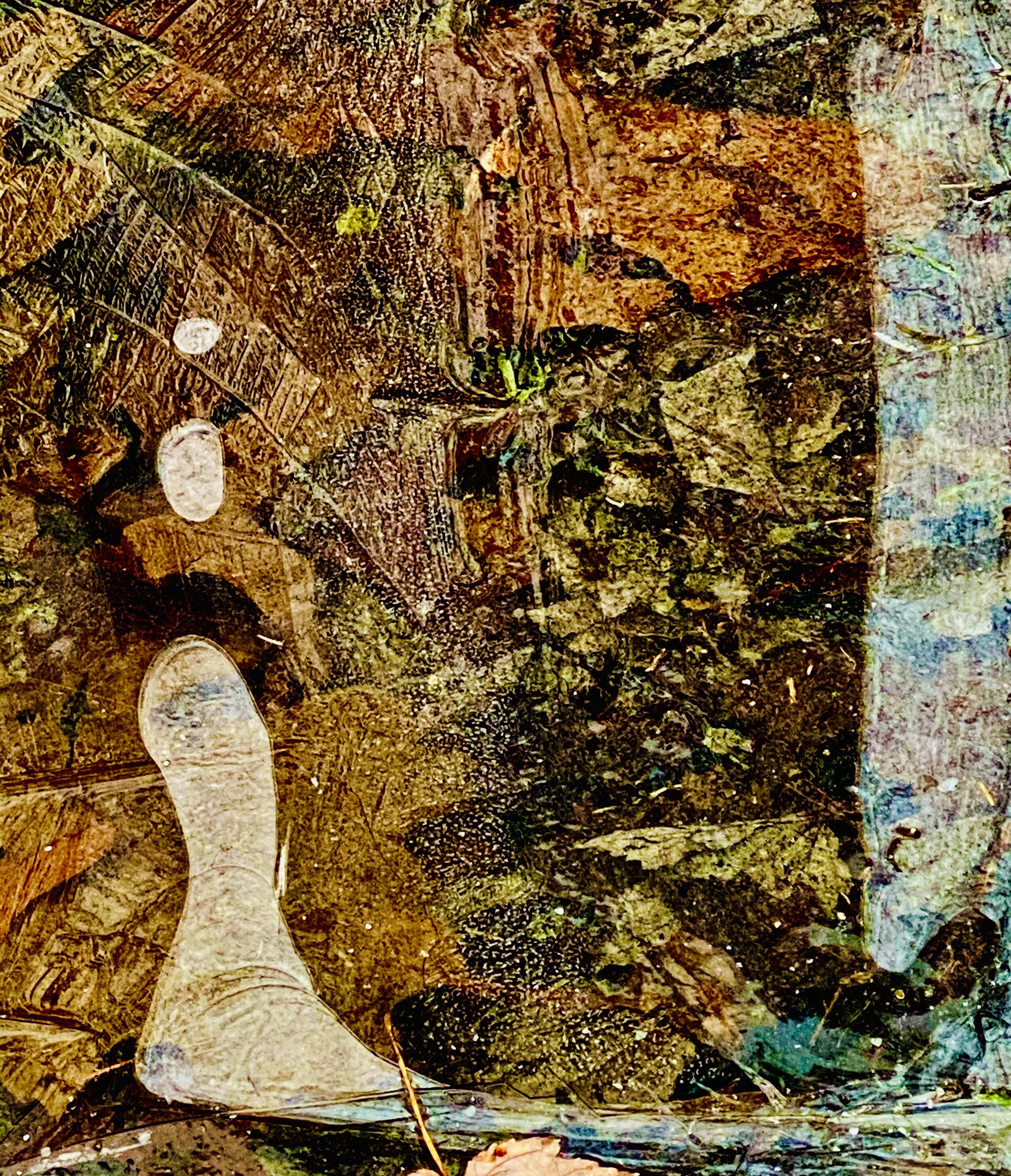 I walked to the river, a bit later than usual, this last morning of the holiday break, and only the tiniest of edge of the river had little laces of ice. But parts of the wetlands are iced, and some of the trail, and I slid precariously over the glassy freeze. I was listening to the Upaya Zen podcast again, and the Roshi was talking about posture in meditation, and I looked down and saw the ice figure––woman seated in meditation with. a lovely posture; a glorious discovery. I walked for a long time reflecting on presence. And poetry. And my frustrations lately with writing, and all this frustration started to lift as I just focused on this very moment on earth and the wonderful beauty and imagery of the brook. In fact, my frustration lifted more when I had a poem immediately accepted by a journal; one that has been rejected a few times. It found its home, and I’m glad. I sent out, after my walk, my Aim for Astonishing weekly prompt and worked on the daily activity of cleaning up from the holidays and putting away clutter, clutter, clutter, and Frank and I spent some time finishing the renewal of our youngest’s bedroom since she moved all her belongings out and now we have a guest room, well, it’s always her room, but it’s fit for a guest if the need arises. Or fit for meditation, where I will sit with a lovely posture and reflect on my brook full of leaves and water and ice and all kinds of fascinating organic matter recycling and regenerating and making a habitat for many worthy beings who belong to it.