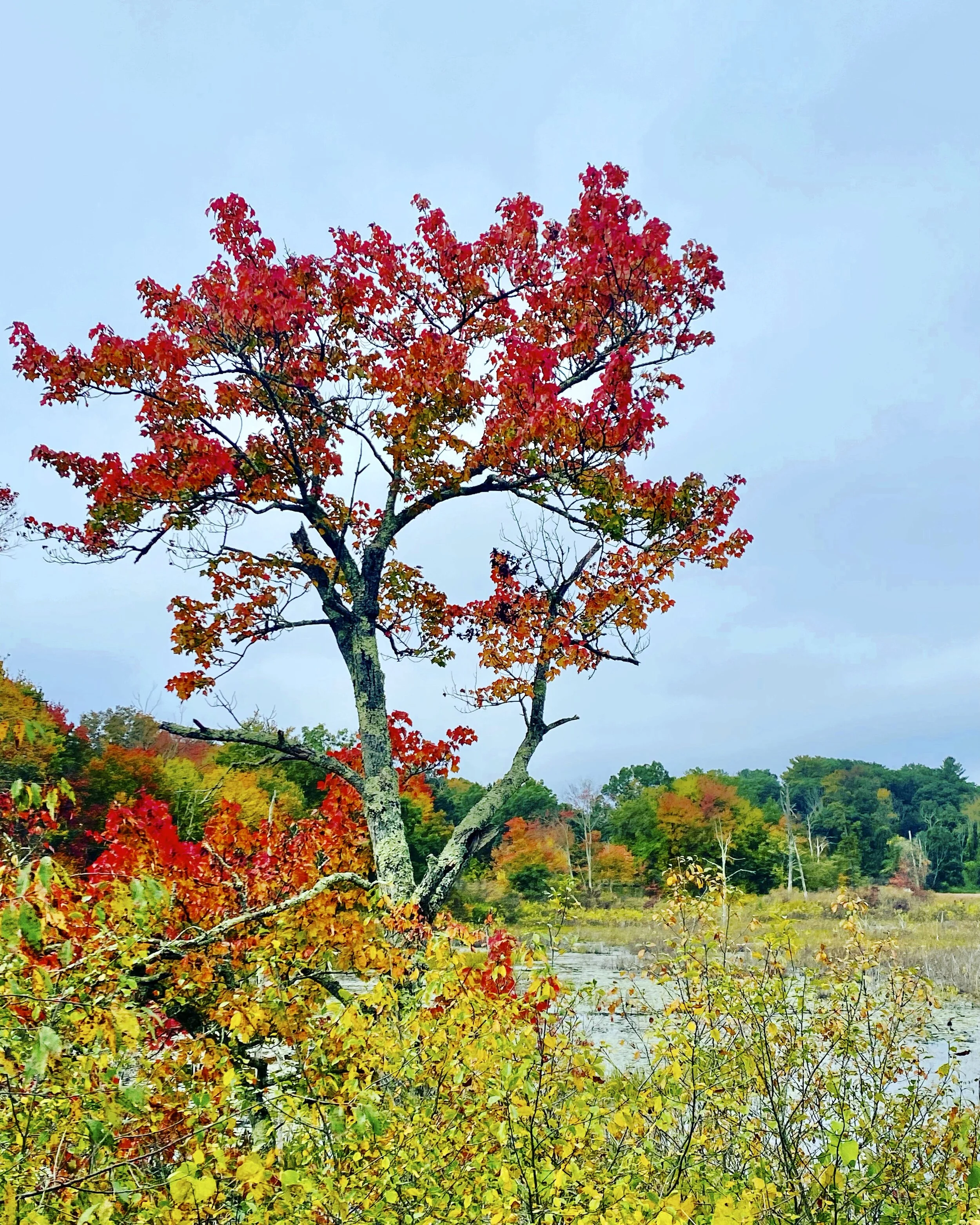 A Monday that isn’t really a regular Monday; a strange feeling, here in Boston. Marathon Day in October, on Indigenous People’s Day, instead of Patriot’s Day. Frank leaves earlier on his plane, realizing that he won’t be able to get to the airport after the Marathon starts. I am so proud of my friend, Megan, working mother of three young children, running and finishing! Instead of running, this morning, I walk and enjoy the warmth, heating up, appreciating the foliage brightening all along the river’s edge and in the wetlands where I notice this spectacular flaming tree. I’m warm and want to swim, but I can’t run to Farm Pond with Charlie and I have a lot to do and want to get to my desk. I decide I won’t go. But, somehow I find myself getting into my bathing suit, grabbing towel and goggles, and getting in the car. I think, I’ll just jump in and out of the pond. There is no one on the beach, no one in the water. Even the geese have gone. I dive in and realize I don’t want to hurry out. The pond is all mine. It’s wonderfully cool and a little choppy, and every time I lift my head I see the trees lining the edge of this small world, brightly lit. I am so glad I came. A perfect start. It turns into a busy day at my desk and I don’t get everything done. I manage to send off my poem for workshop tonight; revisions done a few days ago. Taxes not quite done, must be wrapped up. Tonight I feel my revisions are successful. All day, I am cheered by this tree. Red and gold, such energy, such warmth to carry with me, after the pond swim, I am warm.