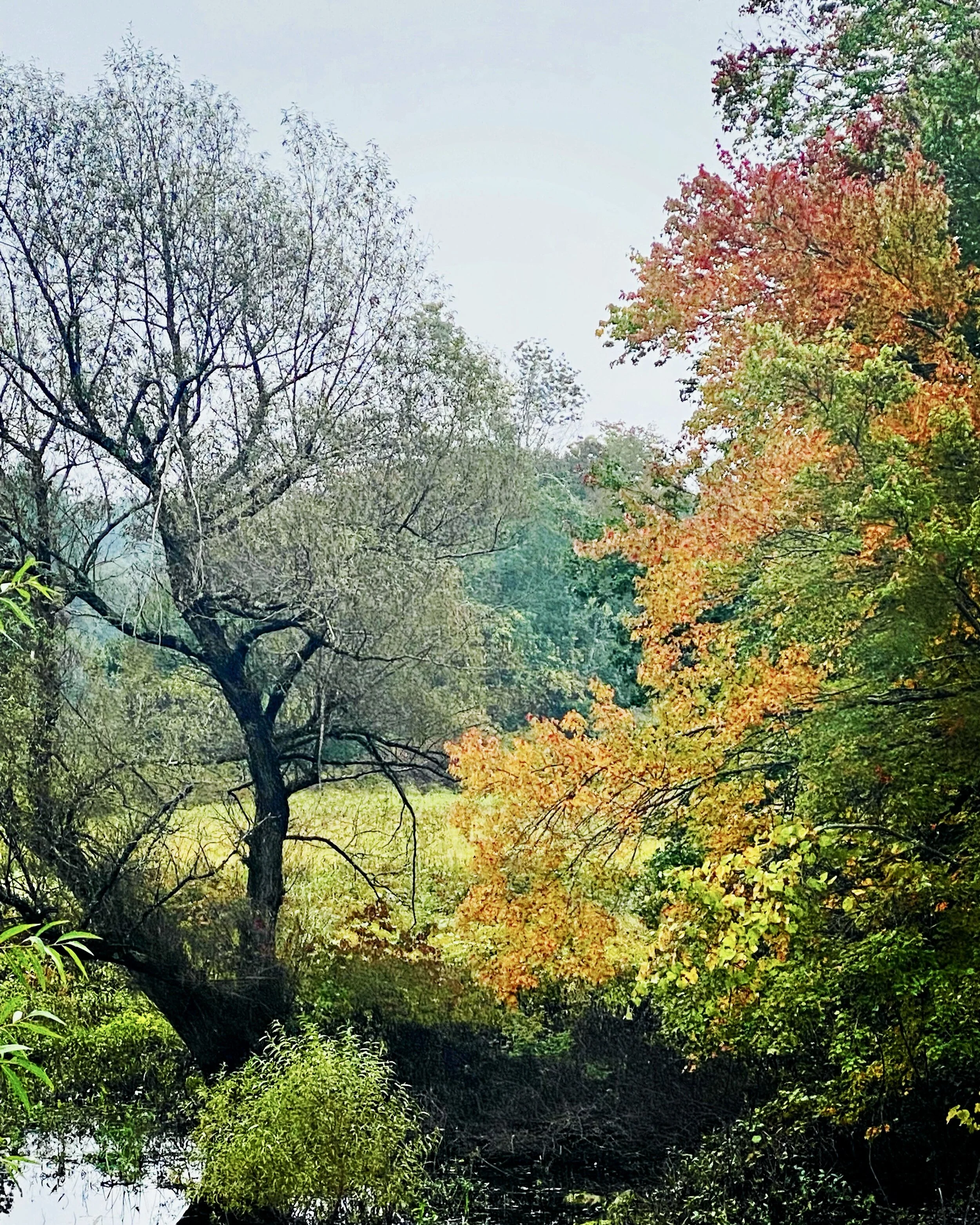 Woke well before the alarm I set and rested in bed until it went off. I wanted to wake early, even though it’s Sunday, to get my Aim for Astonishing weekly writing prompt sent. Which I wrote from bed before rising. And then, went for a walk in the dry but overcast morning, with both Suzi and Charlie, as Suzi seemed to have the energy and I wasn’t determined to go fast or far. She did well, keeping up. We walked to the trestle bridge for a view of the river foliage, still slowly, slowly changing. I do hope to get out on the kayak very soon—that will be spectacle, a little further on. I arrived home from my walk, eager to get back to my desk and prepare for my monologue Play Lab on Zoom tonight—and Charlie was with me in the kitchen, and I asked my daughter if she had fed Suzi her breakfast, and no, neither of us had, and I went to feed Suzi and then I realized she wasn’t home! So, out the door I went retracing my steps in the woods. No point calling her by name she is stone deaf now! I walked and walked to the point where I thought she might have fallen behind and then not realized which way I’d gone. No sign of her. Called my daughter, and just then Suzi was approaching the door. I was so relieved! Breakfast for Suzi! Frank and I attended the lovely back yard wedding reception for my dear friend’s daughter and the rain held off and it was so special to be dressing up a little and going out the door to A SOCIAL EVENT with my husband! It’s raining heavily now, this evening, outside my closed window. The plants have responded so well to these evening rains that drench the earth and their roots. My Play Lab ran long and was so so rich and worthwhile. The monologues are really coming along and the writers are so supportive of each other. And I had the thrill of two guest actors, dear old friends and collaborators of years past from my own playwrighting days, and they gave their talents so generously. It’s so satisfying to experience the writers risking and learning and growing. It’s going to be a very dynamic showcase on Oct. 28. Tomorrow, after my walk or swim or whatever i do I must get to my own writing and find a poem for workshop tomorrow night.