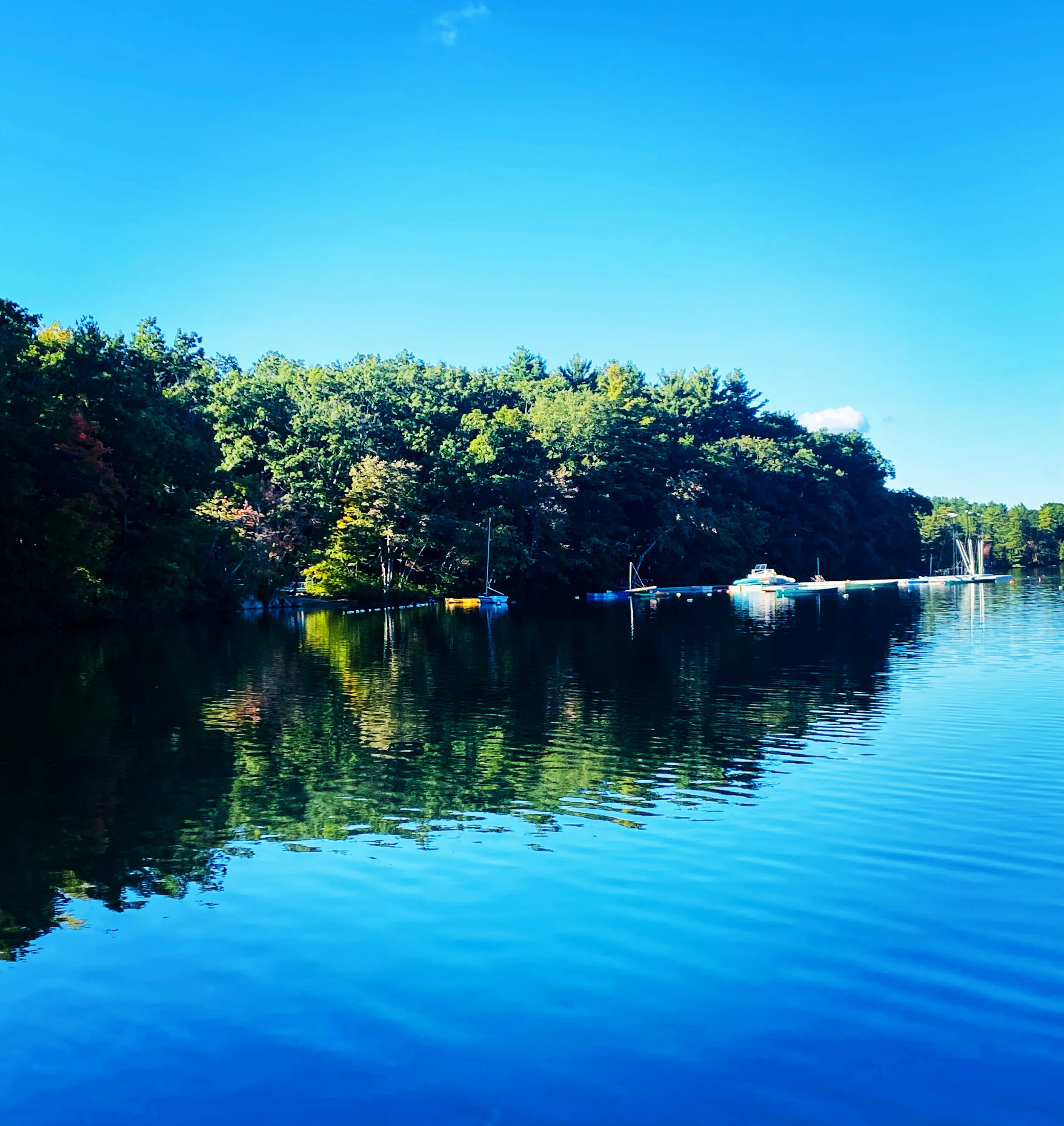 Yes, in the yard, it’s very warm. But cool in the shade. Frank is done with his work. We go together to pick up the special one and then stop at Farm Pond. I have worn my bathing suit—just in case. But I am pretty sure I won’t swim. But, here we are. Glass smooth, the pond. I take off my shirt and pants, still doubting I’ll go in. It has rained for days, since the last time I swam. But I am here. I will at least dive in. Or not. But yes, I do. And a few strokes, and it’s very cold/warm, it’s perfectly pleasant, it’s wonderful, really, and the sun is on my head, I’m swimming in liquid glass and so I take my time and a great swim, and enjoy every minute of this surprise. It’s no colder than it was last week, and feels warmer. The maples turning red leave a beautiful blurry reflection on the blue pond. Soon enough, while making the roasted vegetables for dinner, the after-chill wears off.
