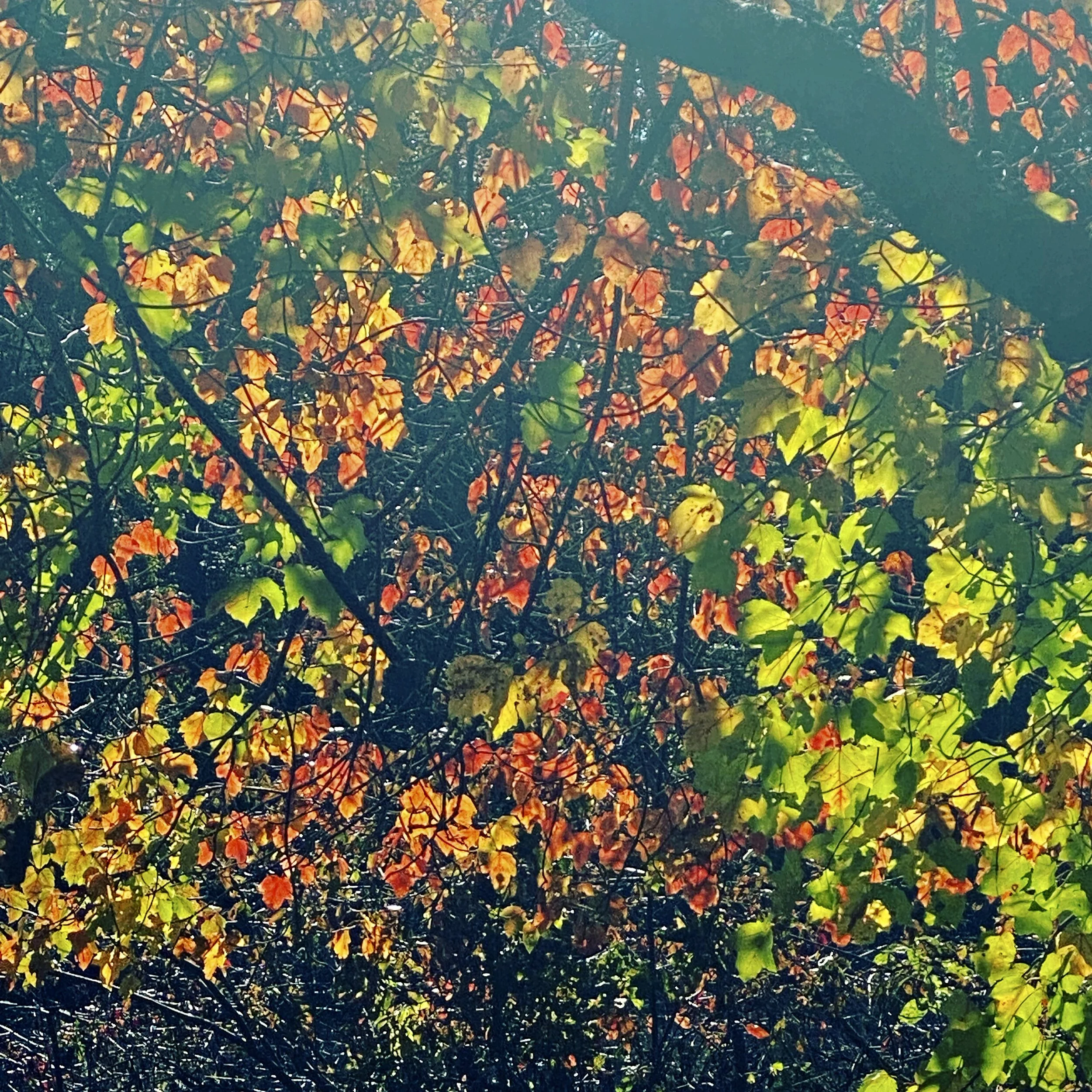 I lingered in sleep, through an exceptional amount of early household noise of husband using the vacuum on the dog hair and daughter getting ready for work and dogs and more, because I couldn’t sleep until around 3:00 a.m. I lost my sleeping spell and stayed up so late reading an article in the NYTimes and then listening way too long to audible. I got up and the house quieted and I went out with Charlie. The foliage is really bursting into color now, especially on the river’s edge. I decided to walk. It became so sunny and warm I thought I might just have to drive over to the pond for a swim. But I wanted to get to my desk and decided: later in the day. I prepped for tonight’s Journal of Expressive Writing open mic event that I was hosting with featured writer Vanessa Gabb. And then I worked on poem revision which I will bring to Monday night workshop, I think. I wanted to revise it fresh from yesterday’s workshop. What I also did was face my anxiety about my new manuscript. Last night, while I was awake, I began to feel doubts about it. So, I just opened it up and re-read it. As it comes together for publication, I am thinking about the title, which I played with, and as I read it I felt happy with it, and very surprised by that. I laughed here and there, too. Then I was very glad that I just faced my fears and resolved them. For today. Then I took a swim, but in the pool, not the pond, because I had lost the sunshine on my head and because I was tired. My goodness, with my window open, I hear far off in the distance the coyote pack yipping like crazy! Goodnight coyotes! The event tonight went very well: like a ritual–-”like a collective prayer.”