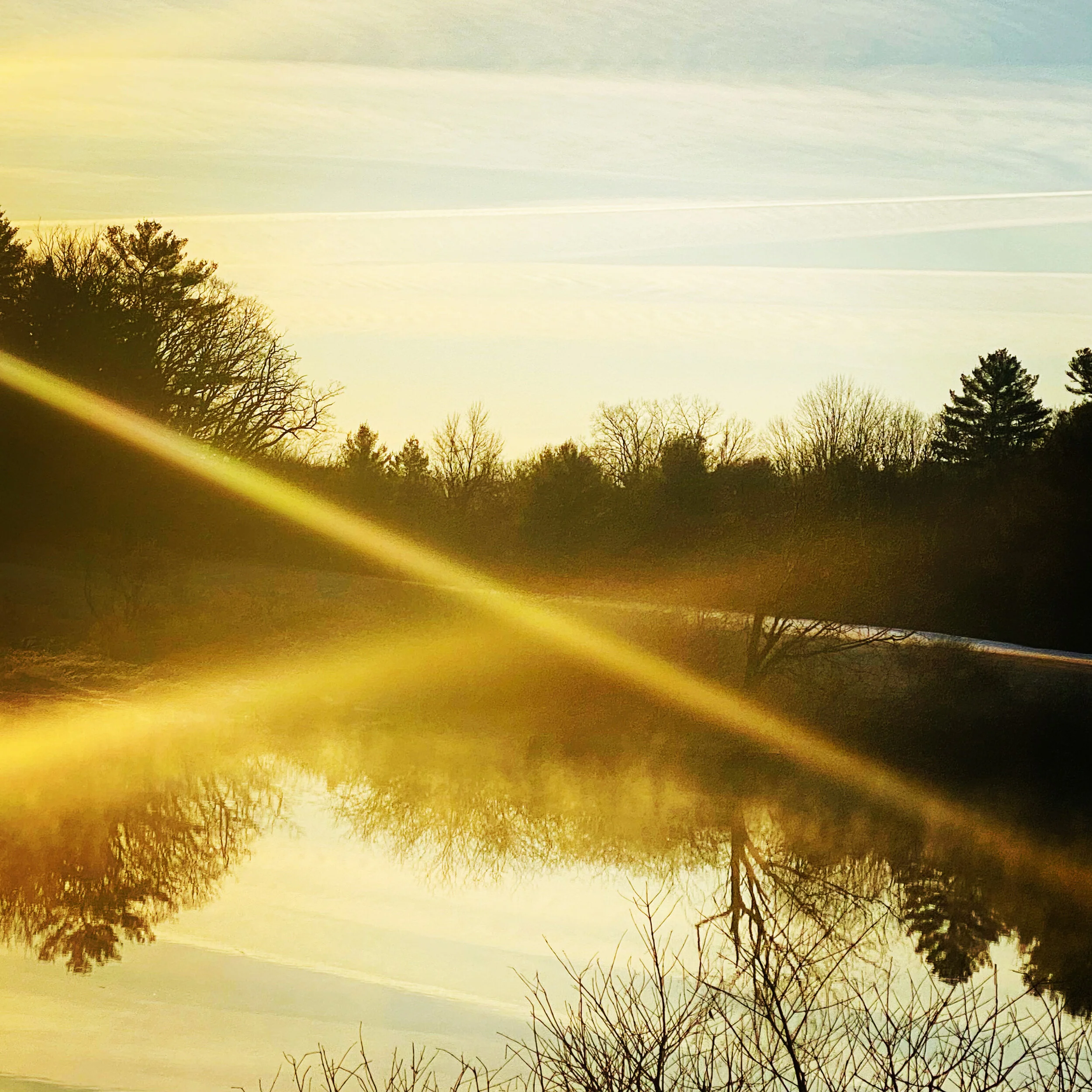 Frank and I sat, after lunch, briefly on the deck in a flood of warm sun. I had just lit a fire in the cool house. He called me out. I was stunned. The difference in temperature. We watched old crust of the snow melt on the field. Early, I walked. Awake around 5:00 a.m. Not much sleep last night. I’m in an overthinking time with things on my mind. I read a funny text from a friend and laughed out loud, but did not wake Frank. So, I got up, and finished the prep for my Farm Pond Writers, then went out. Beams of sun over the river. It was very quiet. The wetlands in melt, but some ice left, and wandered where I could without getting my feet too wet. I went in, and we had a small workshop with the Farm Pond writers, and the prompt I brought worked well. In the afternoon I was quite tired, but I prepped and opened the final week of my monologue class which is going so well and I will be sorry for it to end. I walked again, later, realized the overthinking is resolving. I felt, under the blue sky and the evergreens, the positive, hopeful way of accepting change. There is quite a lot of clean up to do from this winter. Make dinner? No, I let the fatigue take me. Frank heated leftovers; I made an omelette. A poem! I almost forgot! After omelette, revised a bit the newest one and sent it off. A year of pandemic living. A year! My daughter and I mused happily tonight: we may go out into the world again soon!