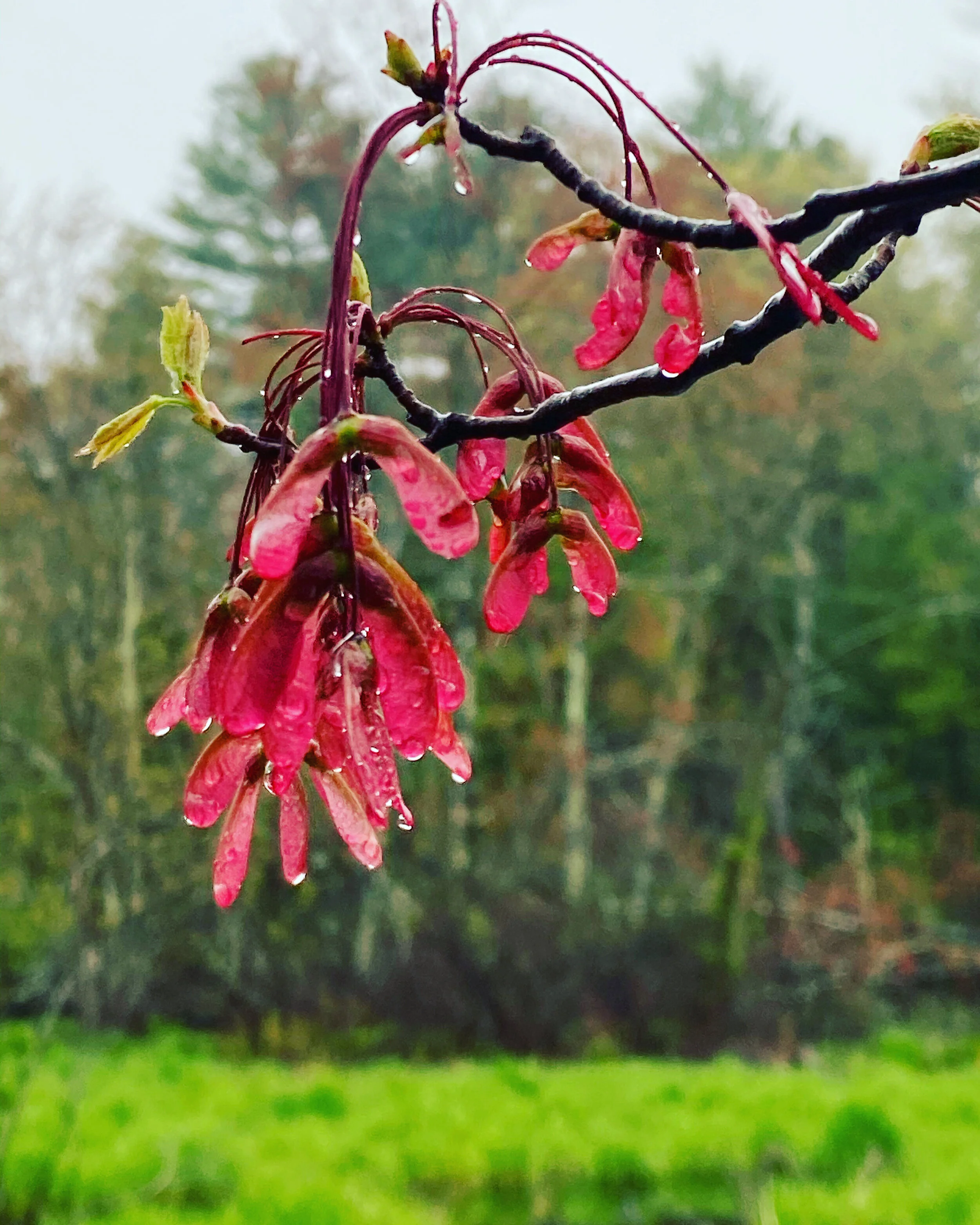 Soft and steady, all night, the rain fell outside my open window, and I kept waking into its refreshing and comforting steadiness. All of the plants, all the new plantings, the plum and the lilac, the juniper and hydrangea, all being drenched and rinsed in their new homes in this earth. It was a restless sleep of knowing I needed to wake extra early to have time for a brief walk before going to Falmouth High School—online, of course, not by car. And I did wake, earlier than necessary, and I did go out into the lovely wetness. And I did linger at the maple wings with raindrops, knowing they are going going, will soon be gone. And I stopped at the brook and looked at the trees and the ripples. By 7:26 am I was teaching my first of three morning classes to a screen full of high schoolers for Student Day of Poetry, sponsored. by Mass. Poetry. (I am among a group of Mass. poets leading workshops in schools this week, something I’ve done in previous years very happily; none last year, of course. 7:26 a.m.! I was leading my Your Pictures As Poetry: Writing From Your Photo Stream workshop. It was a little awkward to have students share, because many are in the classroom, masked, and the audio was a challenge. But they engaged and I think it went very well. After my first workshop I had a quick break and ran into Frank in the kitchen, and laughed, and told him how much it reminded me of the work we were both doing when we met and become best friends and fell in love. We used to teach substance abuse prevention in private schools around the US; we’d go to a different school every week and teach usually four classes a day and meet in between classes for quick hellos, coffee, walks. . . and then find fun things to do once school was out. He laughed and smiled. Then I ran back for my next class! All three went wonderfully, th students wrote from photos, and I do the same tomorrow. The rain stopped in the afternoon, the sun came out. I worked on a poem from the letters for tonight. It was one I started a week ago. And I worked on the project a bit more; I am so nearing the end of the letters, and determined to stay, steady as rain, focused and productive.