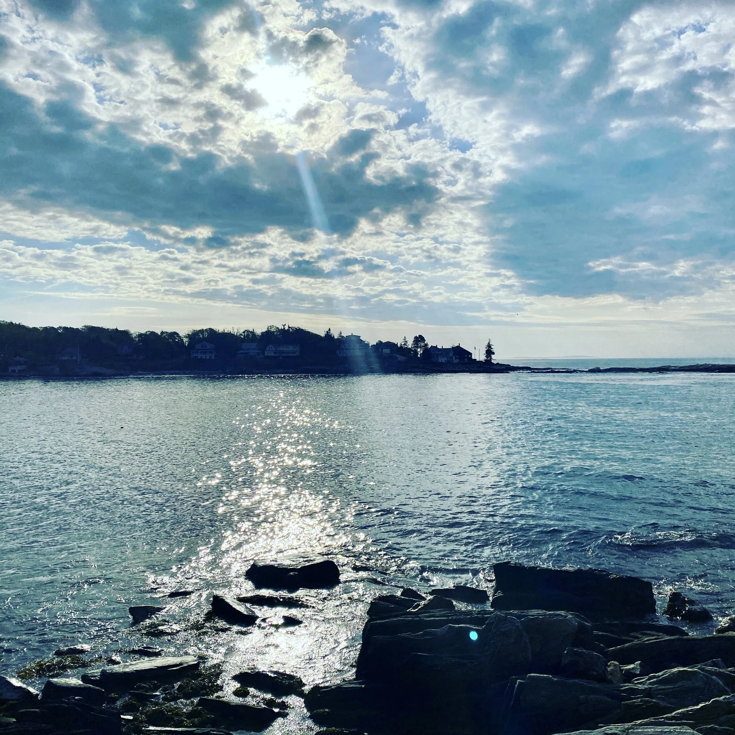 Sleep to sound of sea rolling outside my window. A deep and restful sleep, sun pouring in through the window, early. I am the first one awake. The dogs have escaped from their blockade, but they have behaved and stayed off the furniture. I find a place to walk them across the street, a long dirt road up a hill in a very wooded area. They are happy to explore. Lupine in bloom, all colors, which we don’t have in Massachusetts. Our view is intensely amazing overlooking the Atlantic in this cove from our deck and the sun is hot. No mist, no chill. A day of gentle weather. We walk a half mile up the road later in the day and I wade in the chilly, icy salt pond, actually a National Preserve named for Rachel Carson. While Frank went to the supermarket I sat in front of the water and wrote my Aim for Astonishing weekly prompt. It is so satisfying to travel after so many months. To be somewhere new, seeing scenery, away from the familiar, and breathing in a sense of relaxation and delight. All day the view of the water in the cove changes, light shifts, clouds shift, tides shift. The whole day a day of renewal and gratitude and feeling quiet in just the right ways.
