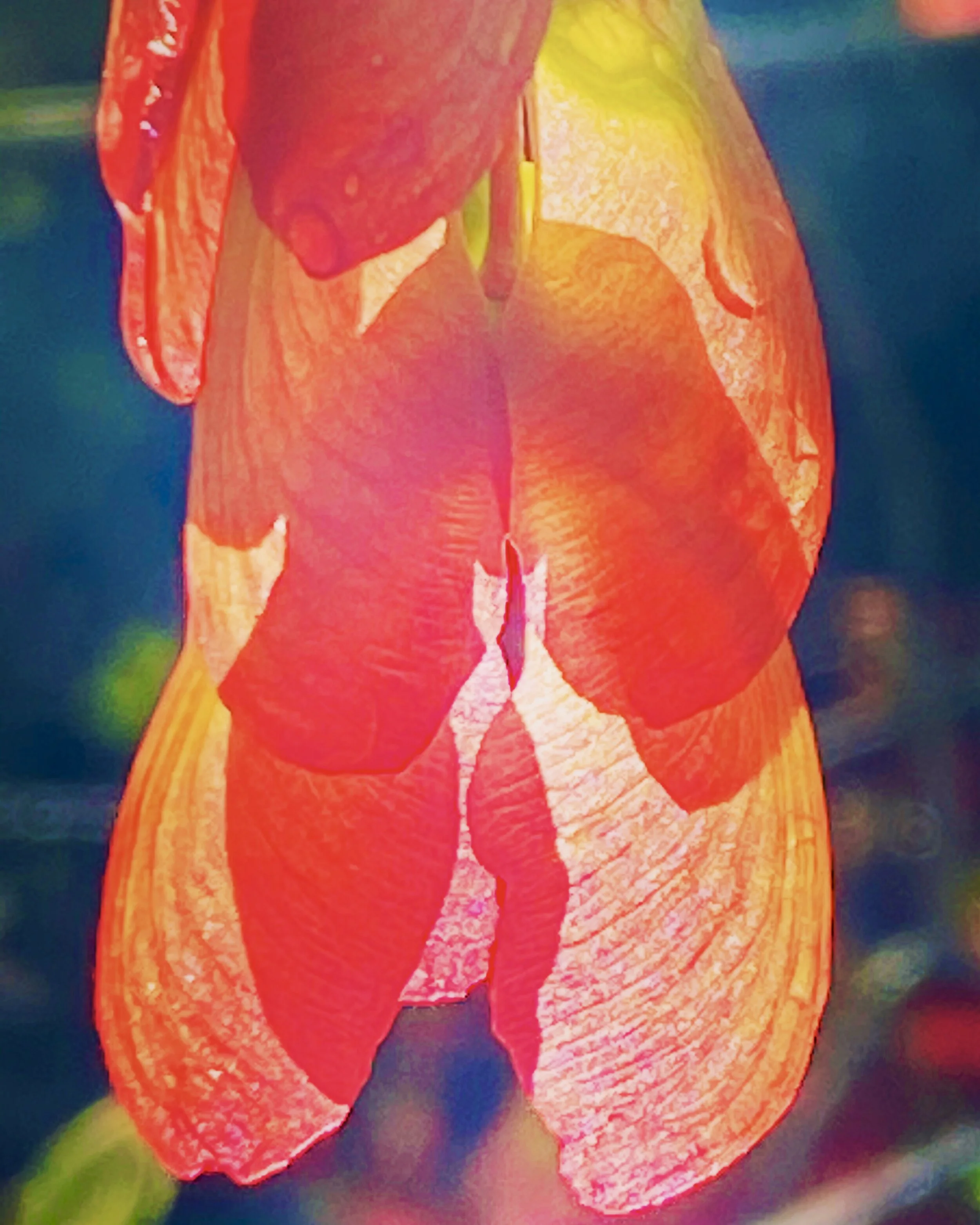 Sun through the trees, no rain. I am out early. Listening to a Fresh Air interview with the author of “Finding the Mother Tree,” by Suzanne Simard. The memoir sounds fascinating. I will listen to the book on audible. Everything going on around me is about the trees. Here, these maple wings, and the sun shining through them, a lamp. And, along the trail, by the railroad tracks, I find the tiny milkweed plants coming up. Up the hill, the steep hill, a birch tree has fallen across the path. Stitches. It’s time to go home. I teach a webinar for high schoolers on writing from photos. They are masked in the classroom. It’s hard to tell if they are engaged, but there are a few comments. In the afternoon, I splurge myself with things to plant: juniper bushes and hydrangea, a lilac tree, a plum tree sapling. I plant the day lilies I bought a week ago. And I rake a spot on the driveway I’m trying to clear to plant the trees. I am just so happy to be out in the sunshine, planting. It’s May.