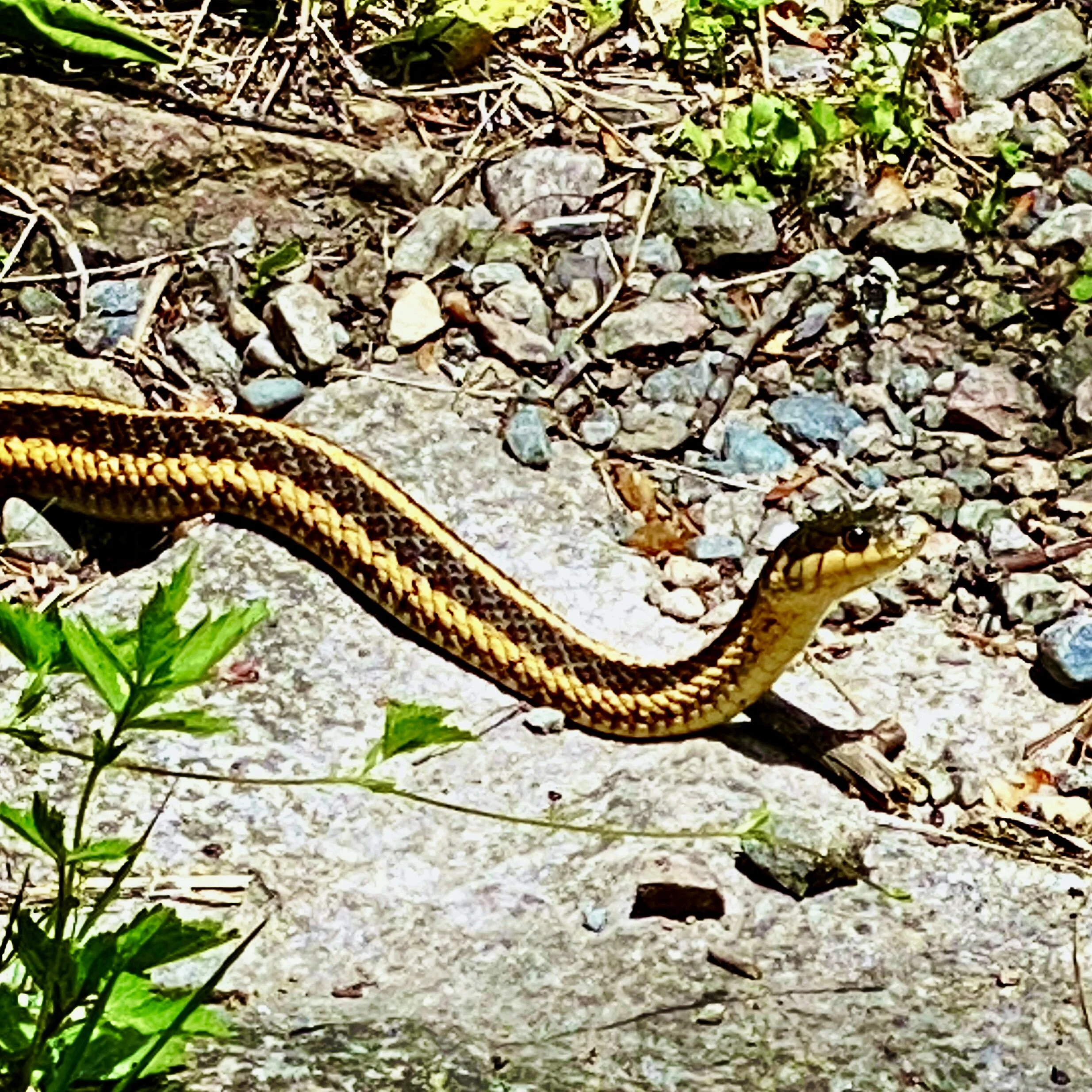 It wasn’t until afternoon that I took my walk. Another early morning, awake at 5:00 a.m. and throwing the doors open to the cool fresh post-heat wave comfort. I am eager to be in the garden. I have a new idea for a rock garden inside the fenced garden with the vegetables and I have bought some young perennials, INCLUDING swamp milkweed and other pollinators. First, I water the hydrangeas, of course. I weed a bit, here and there. Then I start collecting some big rocks from various places into my wagon and pulling it, hoping I am not straining my lower back. I water the entire vegetable garden and all the grass seed. I need more rocks. I find creative ways to get them into my wagon without having to lift them. Then, I go to poetry. I have brought a revision of a garden poem, and get great feedback. We meet the snake, my son, daughter and myself while walking to my friend’s dock through the woods. We surprise it at the brook on high alert. It goes back to the.brook after sensing us for a bit. I take a swim around the island in a cool breeze. Later, I finish the planting and arranging of my rocks. and transplant some ferns from the woods. Ta da! Tonight, on Zoom, a poetry launch for two friends, and then a meeting with my poetry pals from Texas and Mississippi. Whew! How am I still awake? The windows wide open to the crickets and cool fresh air. How does a snake separate itself from its shadow? I will dream on that question.
