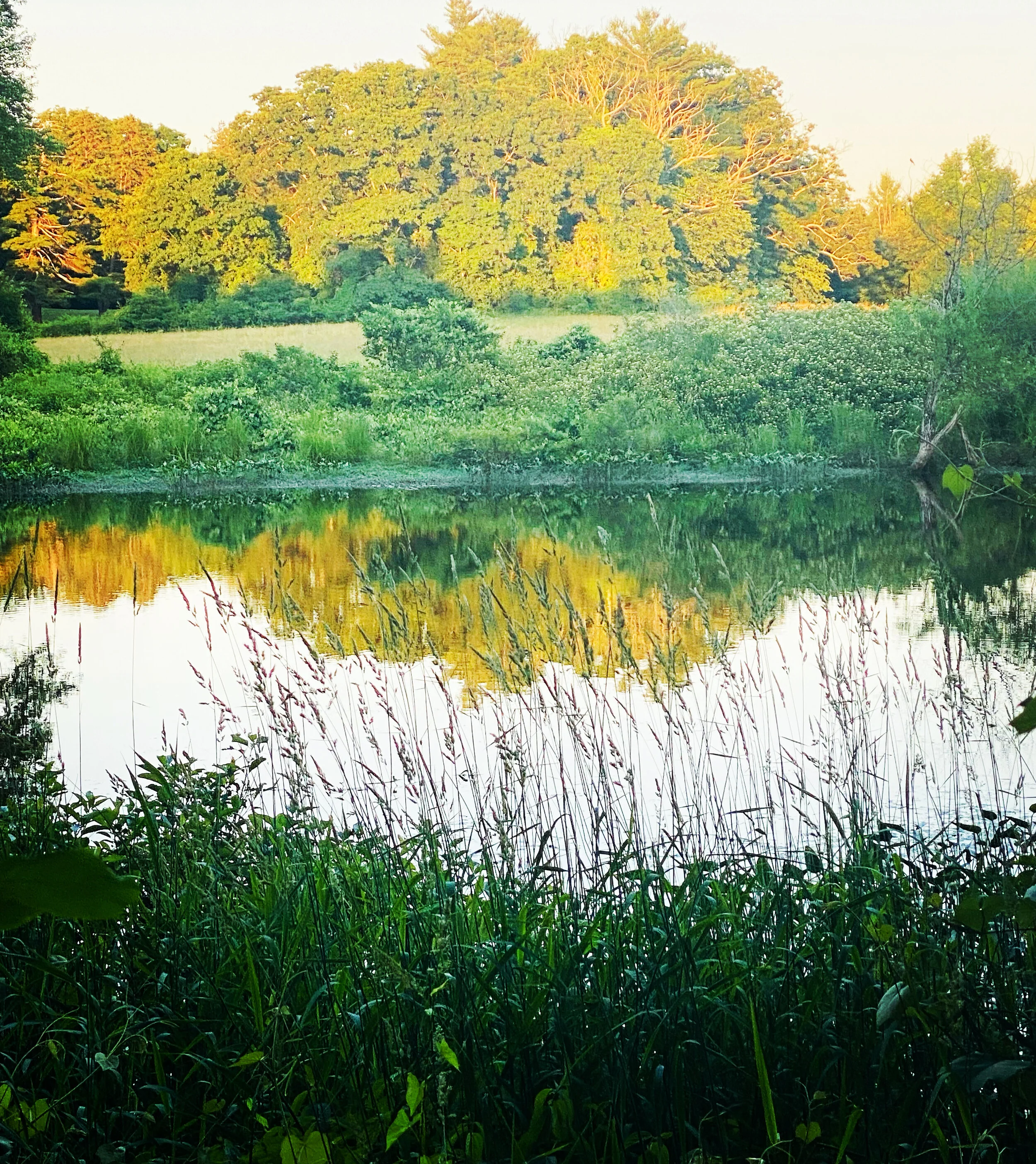 Oh, the weeds. I pull some in the hot sun after watering. And plant the pumpkin seeds, more pumpkins. First, I have to prepare a patch of soil and Frank has gone and there is a spot left that I want to fill. I get the seeds tucked into their little hills; and water all the garden. The best moment of this day: tonight, walking pre-dusk, but the light is low and glowing gold, I walk toward the river and there, flitting and perching and flitting in the pines is a small flock of Eastern Bluebirds that have made their home on the property. A good day means I have been outdoors for most of it, and had a fine swim in Farm Pond with my girls. I went around the island, and then my daughter said, will you go around again with me? and so, of course I did. I sleep soundly these nights of all this activity. I sent my Aim for Astonishing e-mail and will host a free webinar on Tuesday night. Frank and I had a chance for a walk in the fresh bright morning, just around the house to look at plants, and coffee on the deck. “Someone needs to fill the bird feeders,” he said. “And we’re almost out of food.” And I was pleased that he worried about his birds, and promised to fill the feeders while he’s away.