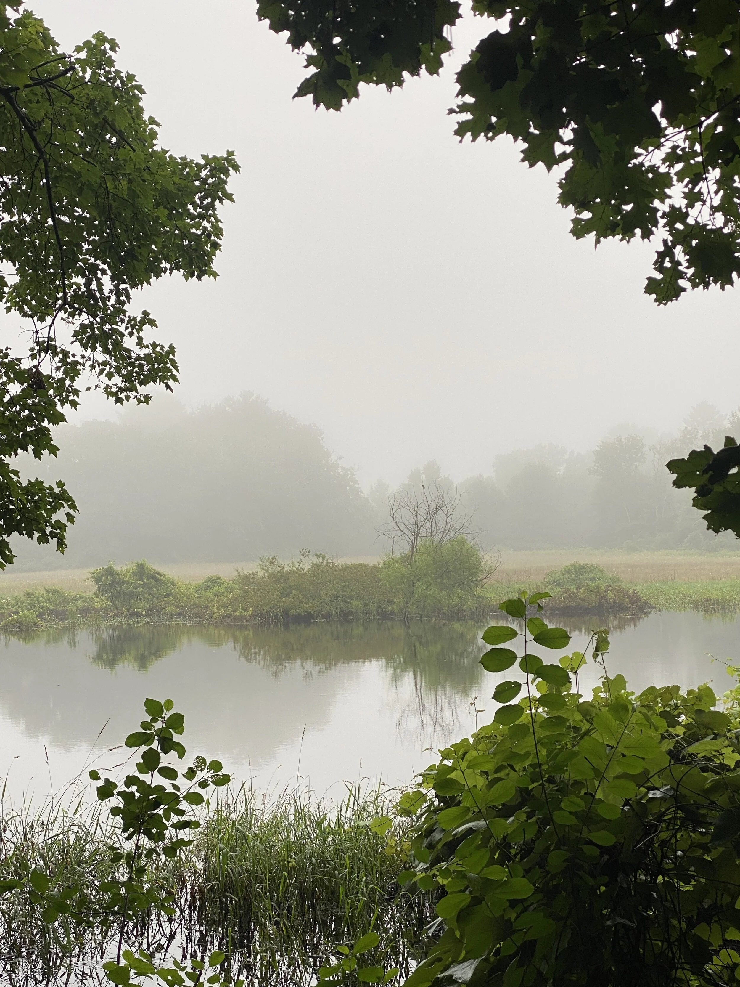 I feel waterlogged. Not a speck of sun today. So, when I saw, on my morning walk, in the wet woods, this leaf layered on a leaf, it caught my eye, the color, the hint, the flash of a kind of sunshine out of the corner of my eye. I saw it, passed it, then quickly turned around. At the river I found a dead fish. Then, at the brook, a couple of more. Then, on the trail where I’ve been wading through the overflowing brook, where I saw the fish yesterday, they were dead today. I waded through discovering this, and went another way home. The wettest July in forever, they say. It was a quiet day, a rainy indoors kind of day, and I am discouraged about the garden. I didn’t go in. Nothing needs water. Everything needs sunshine. We packed the bikes up for a bike ride on the nearby Holliston rail trail, but abandoned the ride when it started raining again. I worked on a few of the poems from letters and also plans for a winter trip to Costa Rica. Where the sun might be shining in February. My youngest came in the late afternoon, determined to swim. I wanted a nap and took one. Then, she was going and I thought, I will go and watch her swim, but I won’t swim. Then, of course, even though it felt cool and was completely overcast, once on the dock, watching her head off, I couldn’t resist, and I went for a swim. The water was the perfect temperature, and I felt terrific. She did a big swim and I waited for her and felt very proud of her; she did a mile and a half! And I was so happy I swam after all. It changed my whole spirit about the day, of course. What a blessing that the water was so fresh and warm.
