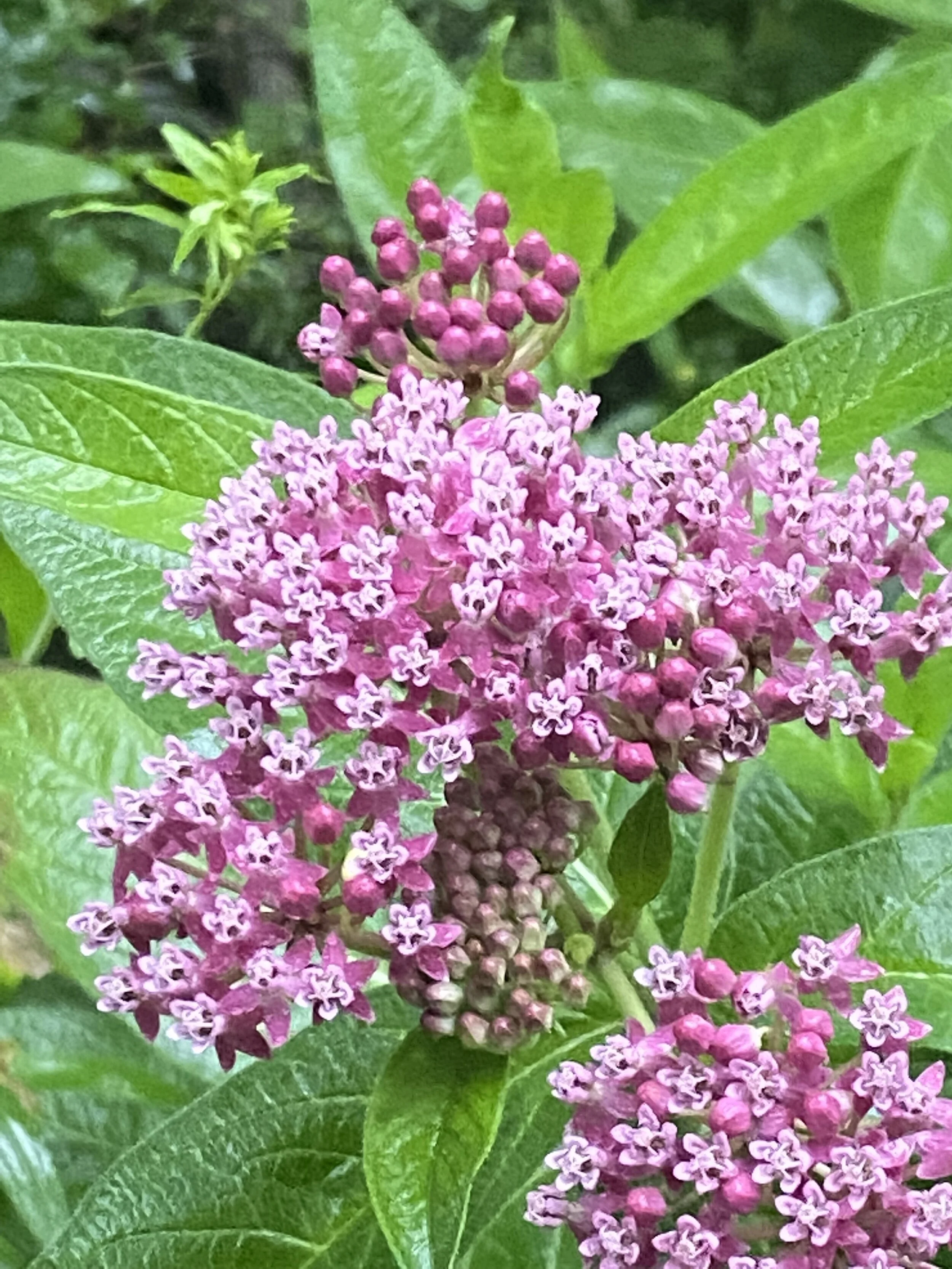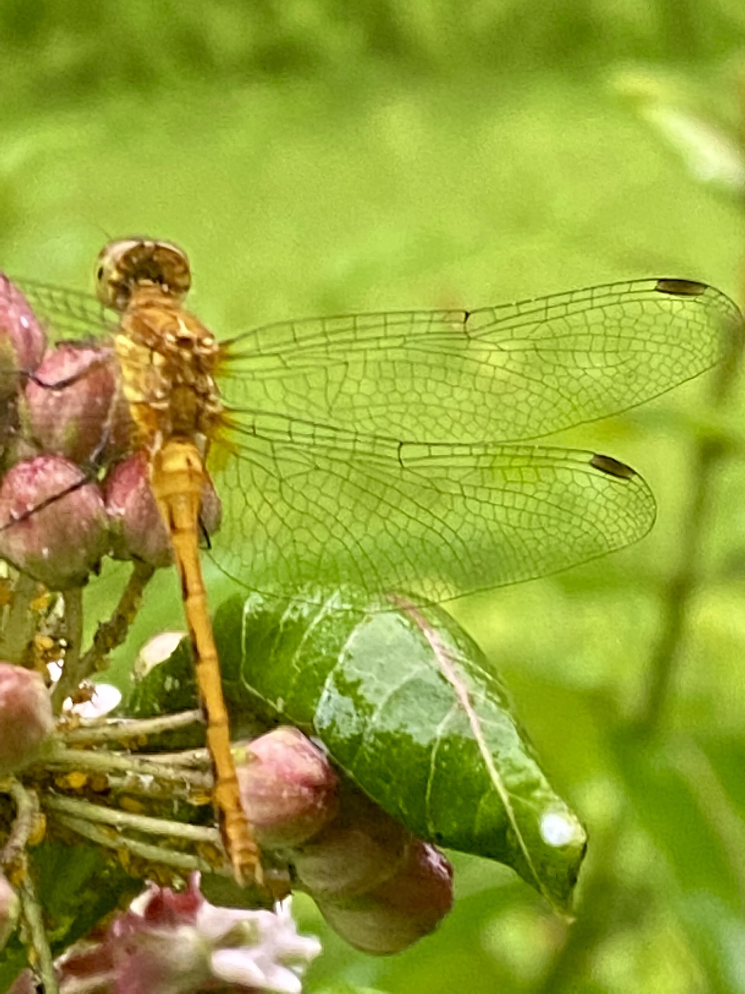 Oh, did it pour and pour and pour, and it came down heavy on my long walk. Amazingly, a few mosquitos buzzed around me––how do they do this in such rain? It was peaceful, all except the buzzing, in the amazing puddled woods. The river and all the wetlands and brooks running full to overflowing banks. Such a steadiness to this storm. There is a meadow where this colony of milkweed blooms and I stopped again to get a closer look, after finding, two days ago, the mating beetles. This morning, still as could be, this dragonfly, as if stunned by the downpour. Lovely pink blooms. Frank’s father unable to arrive today for his birthday weekend as planned, a canceled flight from Tampa; but tomorrow, for sure. I flomped home through the puddles and dried Charlie, faithful, soaking Charlie, on the porch and dumped the water out of my boots! Quite refreshed! There is the feeling of a celebration, and a party, throughout the house. The preparations. My battled with the clutter, everyone’s clutter, to not let it build before this party. Errands to run, bought flowers and ice cream. Mostly worked on the pictures for a slideshow; always a huge project, but fun. Culling photos from the dusty mass of chaotic boxes and boxes of old photos and negatives in the photo closet. Yes, a closet! Frank is getting excited about his party on Sunday. I do so want him to have fun. In the late afternoon, my daughter and I talked each other into swim at my friend’s dock which we did at the tail end of the downpour; it was so choppy and cold, but I swam around the island happily. As we drove home, the sun came out. O sun, the vegetables need you! Thank you for coming back to us today!