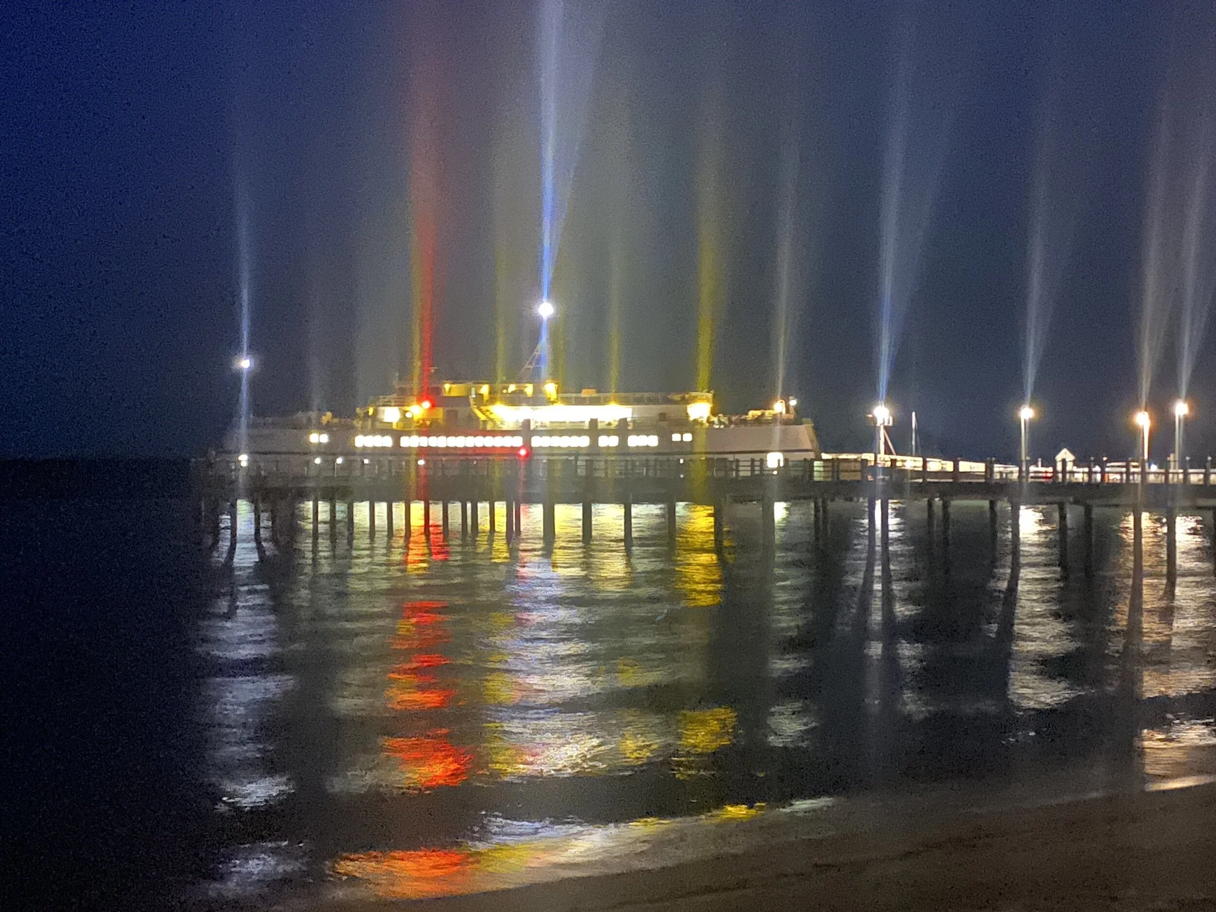 Tonight, after dinner at my brother and sister-in-law’s house we drive into Oak Bluffs and walk around after dark, watching the harbor and all the busy tourist activity. A lovely warm breeze, a half moon in a starry sky, and the colorful lights of the ferry departing the dock for Woods Hole. The blessing of this trip has been the extended time with my brother and his family, and their hospitality after a year and more of having really seen very little, or virtually, none of each other. And all the memories of Vineyard summers and holidays here for over thirty years. Having our girls with us, them having time with cousins. It has been a strange trip of hotel hopping, a patchwork of them, to make the long weekend work, and worth it, for this special reunion. I had a wonderful walk early this morning from Lambert’s Cove Inn, down the long dirt road in the pines, and up the street to Lambert’s Cove beach where all the dogs of the island are welcome with their humans before the clock strikes 10:00 a.m. So many many happy dogs romping in the sand and surf, dogs of every shape, size, breed, personality, and all joyful to be in their happy place on Vineyard Sound. Sadly, mine not with me. But, home to them soon. Biggest relief of this trip––no mosquitos!