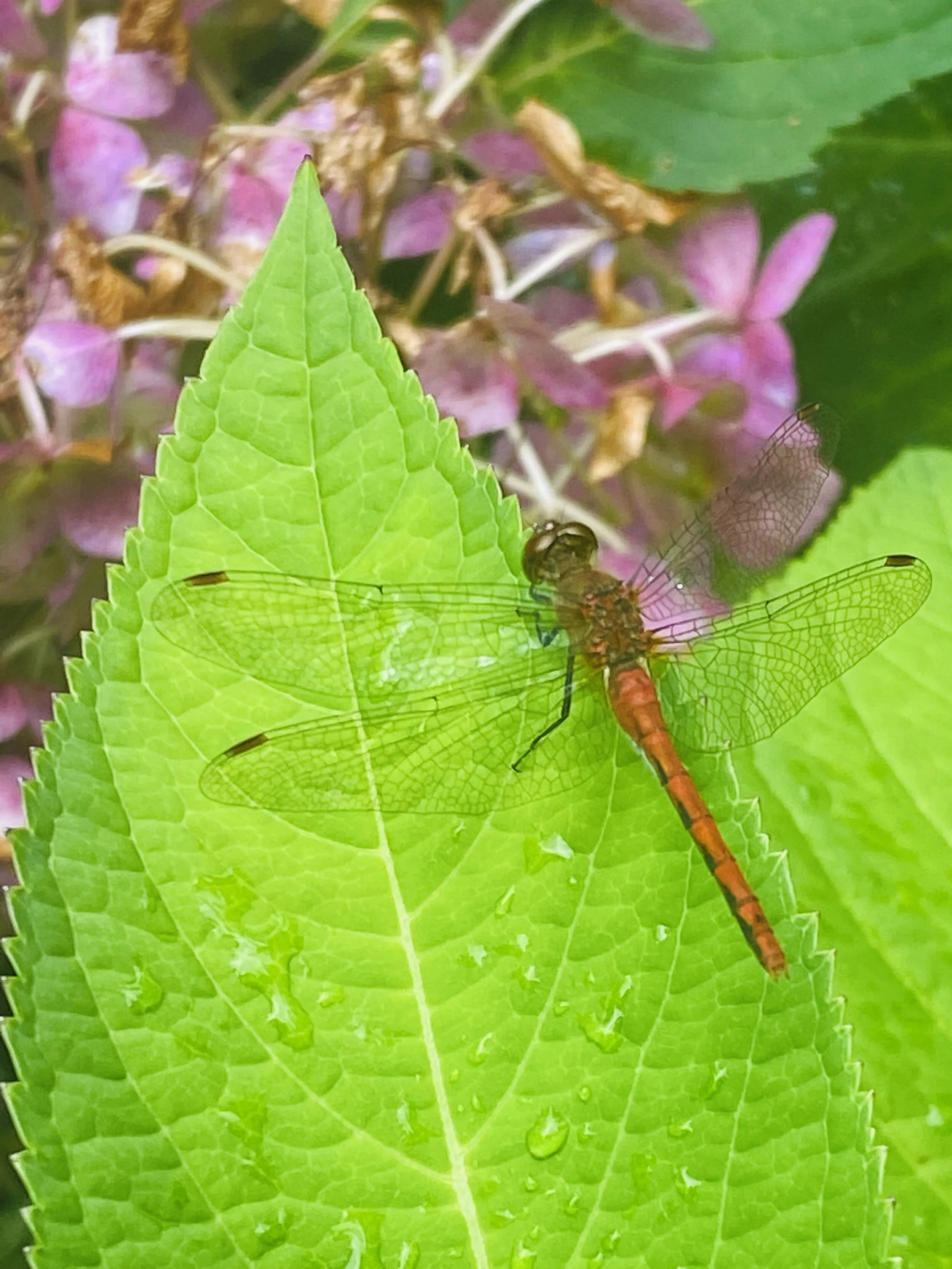 A heavy rain, and I went into it bare armed and appreciative. All the flowers, plants, trees drinking up the refreshment, and me too. I had a short walk before poetry workshop. Stopped by the garden for a few veggies. Later in the day, after the rain and all the tornado and hurricane warnings around, I found the lovely dragonfly. And the day dried and a wind blew up and the leaves scattered the trail on my second walk, with my daughter, to Farm Pond, in the later afternoon. A whooshing wind blowing more refreshment, and, of course, the sense of the season changing. Despite the wind, how still the lake was, unruffled, clean, pure pleasure. Big white clouds, warm air. My poem needs work. I see what I can do to improve it. I swam around the island, walked home through the quiet woods. I made a chili for dinner for Frank and felt the baking spirit, the cooking spirit of fall coming, saw a can of pumpkin in the cabinet and thought: hmm. I may bake something soon for autumn. Oh, not yet, though. Not yet. I have so much more swimming I want to do. And a big goodbye to make. O red dragonfly.