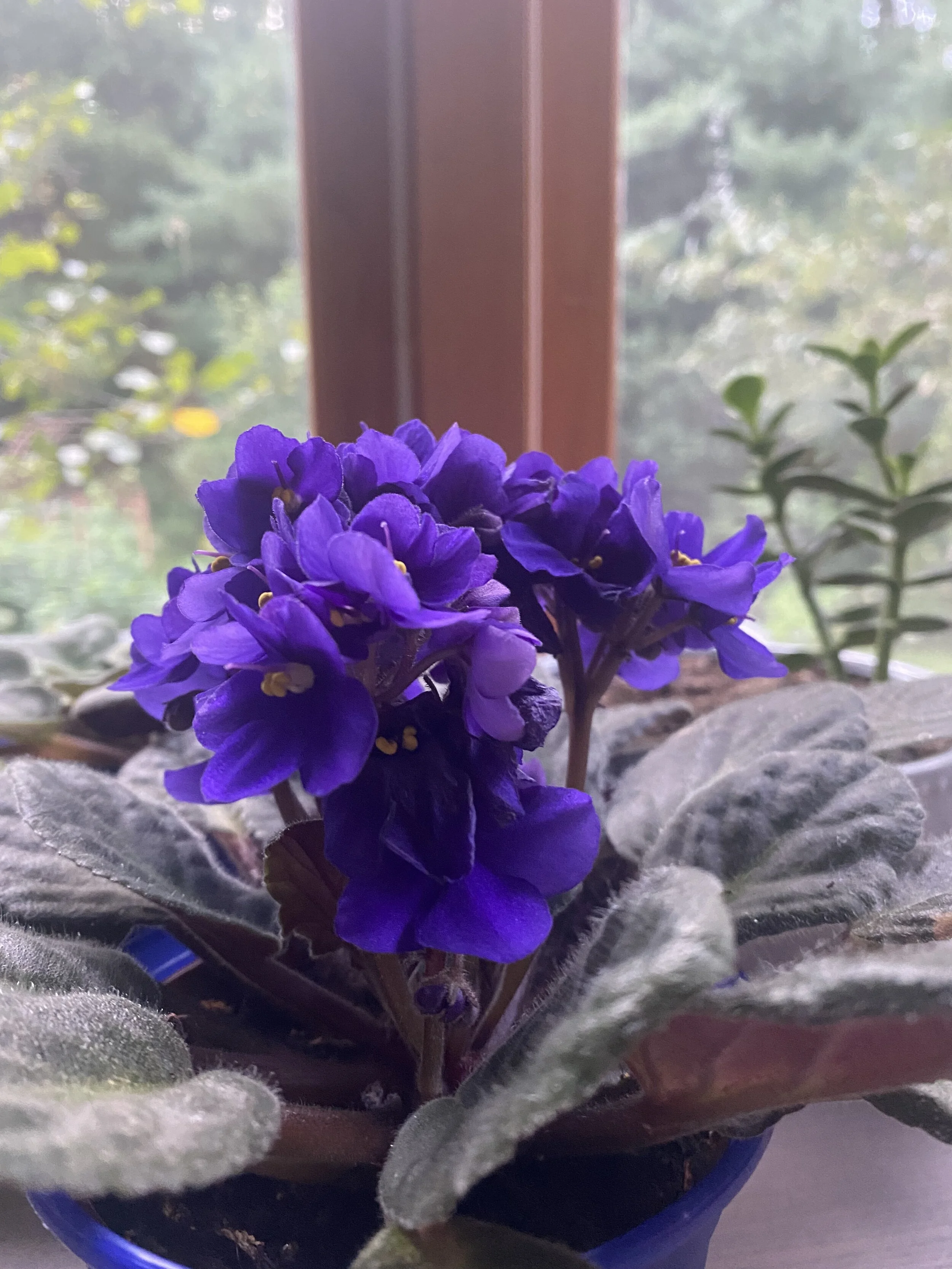 In my office tonight I took this picture of the violets in full bloom. Frank gave me this plant some months ago. It’s thriving in this spot where I work. I have weeded today the most troublesome garden in the center of the circular driveway. So overgrown and poison ivy vines running where they will to trick me. I have managed to elude them so far. In the late afternoon I planted all the new plants and watered them all: the hostas and cone flowers and a few others. My walk this morning was with my dear friend and her dog in the woods, catching up. The first thing I did this morning: wish my older brother a happy birthday through a sibling text. I am so fortunate to have an older brother and an older sister and a younger sister and a younger brother–symmetry of siblings. I need to work on a poem for Thursday. So far, not sure where this will take me. Tomorrow will be a discovery.