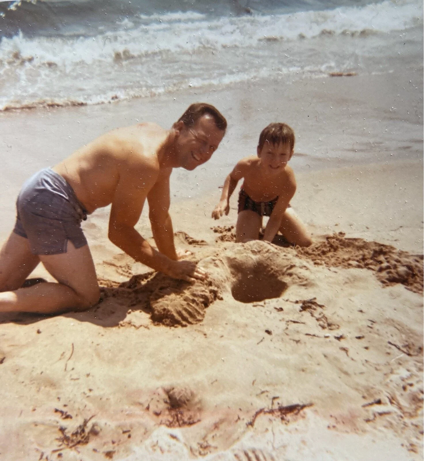 Recently I put a bunch of family photos on my desk. I, and my kids, keep rifling through them, and they scatter the desktop, catching my attention as I pass. This one caught my attention the past couple of days, and so yesterday I had an impulse to text this to my siblings. It started a very warm and lovely thread; all so glad to see our father, young, thin, smiling, healthy, with Bobby, the youngest of us, enjoying a day on the beach.