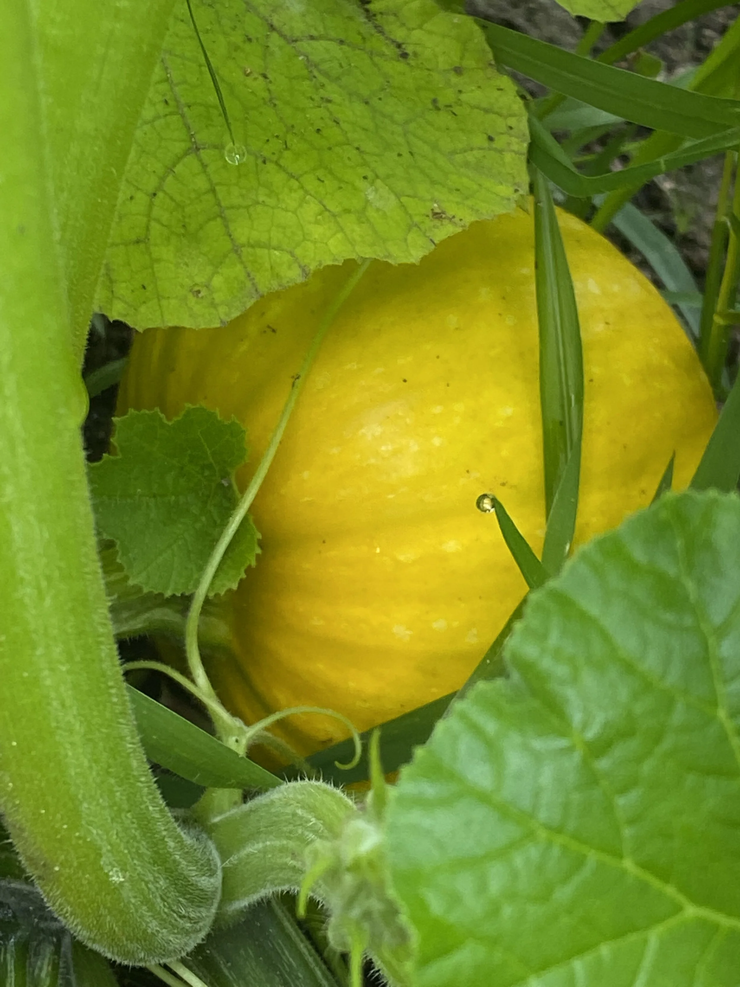 The promised rain, last night, did not materialize. I went straight to the garden this morning under the overcast sky. Brought my big basket. So much to pick: tomatoes galore, all sizes and shapes. Sadly, I miscalculated, left my first big heirloom tomato on the vine too long, waiting for it to ripen red. It softened to mush without moving beyond blush. No worries. It’s all experiment, it’s all low risk, high reward out here in these rows. My watermelons are quite promising, and my pumpkin patch, and the cucumbers have staged a comeback. And the sweet potatoes too! I know nothing about what these sweet potatoes are doing undergound, but, above ground, they are leafy and green and thriving. Tonight is pizza night. Basil harvest. A short walk in woods around our property, and I find this balloon. Not local. Very much out of its territory, which, I discover through google, is Levittown, New York! Indoors, I finish the blurb for my friend’s poetry book and send that off, happily. Revise a poem for tonight. In the late afternoon, my daughter and I take a bike ride up Hospital Road and riding through the old Medfield State Hospital property, now owned by Medfield, I find, to my surprise, someone has planted a wonderful sunflower garden with pumpkins and tomatoes, and to water it, they are collecting rainwater. I wanted to get a good picture, but couldn’t. Next time. And home, down the steep hill, in the hazy late afternoon, past the meadow of colors, goldenrod and purple loostrife and creamy queen Anne’s lace. Pizza night. Roasted tomatoes from my garden, basil from my garden. My best. My best.