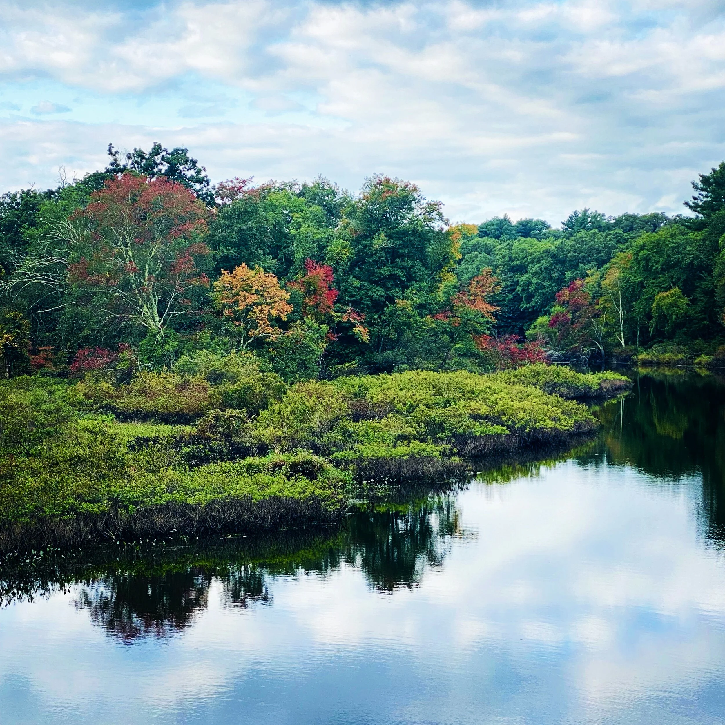 A rollicking storm last night; tonight, a clear sky, full, Harvest moon. Is it full? It’s beaming over the field. I woke fairly early and went out early for a lovely autumn walk as the foliage changes. I am letting the garden go. Did not get in there today. I do not know if my butternut squash are going to have time to beat the frost. There are watermelon to pick. One or two last cucumbers. I went for a massage. It was A plus. Every muscle was grateful. Then, one last (?) trip to Home Depot. I bought hydrangeas and azaleas. Frank teased me a bit, but dug the holes, most of them for me. I wanted very much to feel as if the garden, my shade garden, made with plants my friend gave me upon moving, was finished this season. I wanted a border around it. I still needed to plant the hosta as well. It was hot and bright in the yard and I was so happy to be outdoors even though I felt I should also be indoors at my writing projects. Everything got planted, and I was satisfied. There was some extensive weeding on the driveway garden where I put the final two hydrangeas near by new plantings and bench. This was the last garden area to weed. Done! Everything new got a long drink. I could have stayed out longer, drinking in this pleasant weather. We went to dinner outdoors at a friend’s house; so I did stay out in lovely September, a long, fresh, relaxing day. And the river is receding as the foliage on the banks reddens and yellows into autumn. It’s so hard to believe all the garden plants will be resting for the long winter ahead so soon.