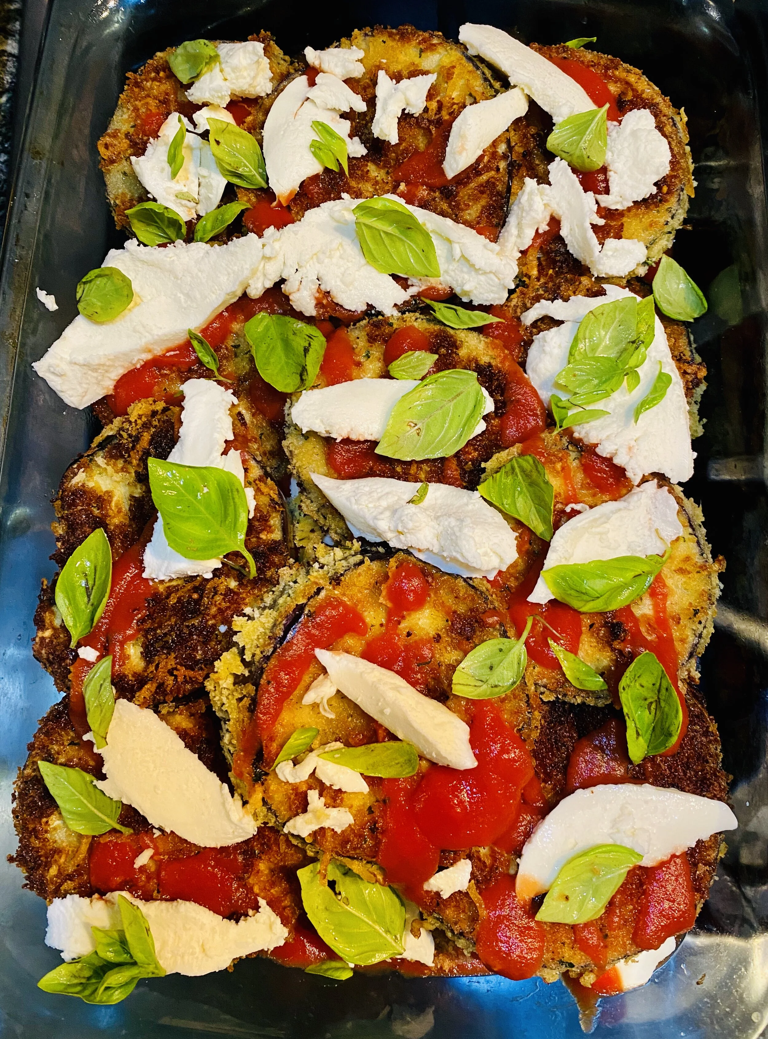 To solve the problem of no water in the house, I took a four and a half mile run in the woods with Charlie and it was quite muggy, quite hot, still summer. Then, I hopped in the car and drove to the beach at Farm Pond, planning to just jump in and refresh enough to start the day. The sun was glorious above me, and the water was actually completely comfortable. So I took a good swim, and it was the sweetest swim of the summer, even though, it’s now fall. There was no one there but me. I came out of the water smiling and clean to start the day. Got right to work—a poem to revise for tomorrow. The doorbell rang and the pump men arrived and very quickly solved the problem: nothing was broken. Something had become unplugged. A mystery. A happy mystery, and the faucets ran. It rained a bit when I was running; then the sun came out again. Crazy weather, happy weather. I got a draft of a poem. I sent off the manuscript draft of my poems from letters to my publisher. I submitted batches of poems. In the late afternoon I went to the garden and picked one of my last eggplants, a purple beauty. And grabbed a fat handful of fresh basil. Made my eggplant parmesan exactly as I like it: breaded in seasoned panko bread crumbs, fresh parmesan, and sauteed til crisp in olive oil, then baked in a simple tomato sauce with the basil and fresh mozzarella. Oh. It was perfection.