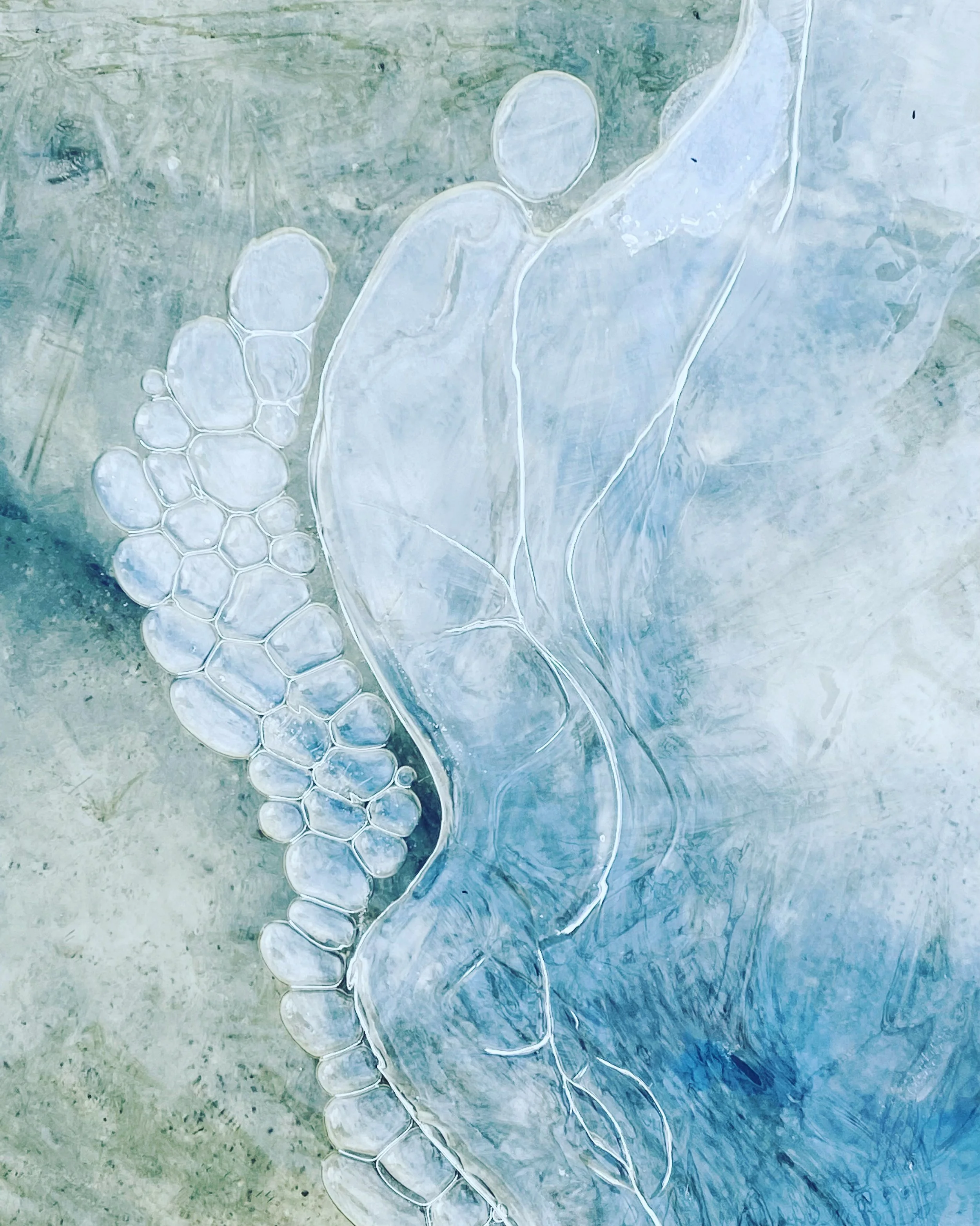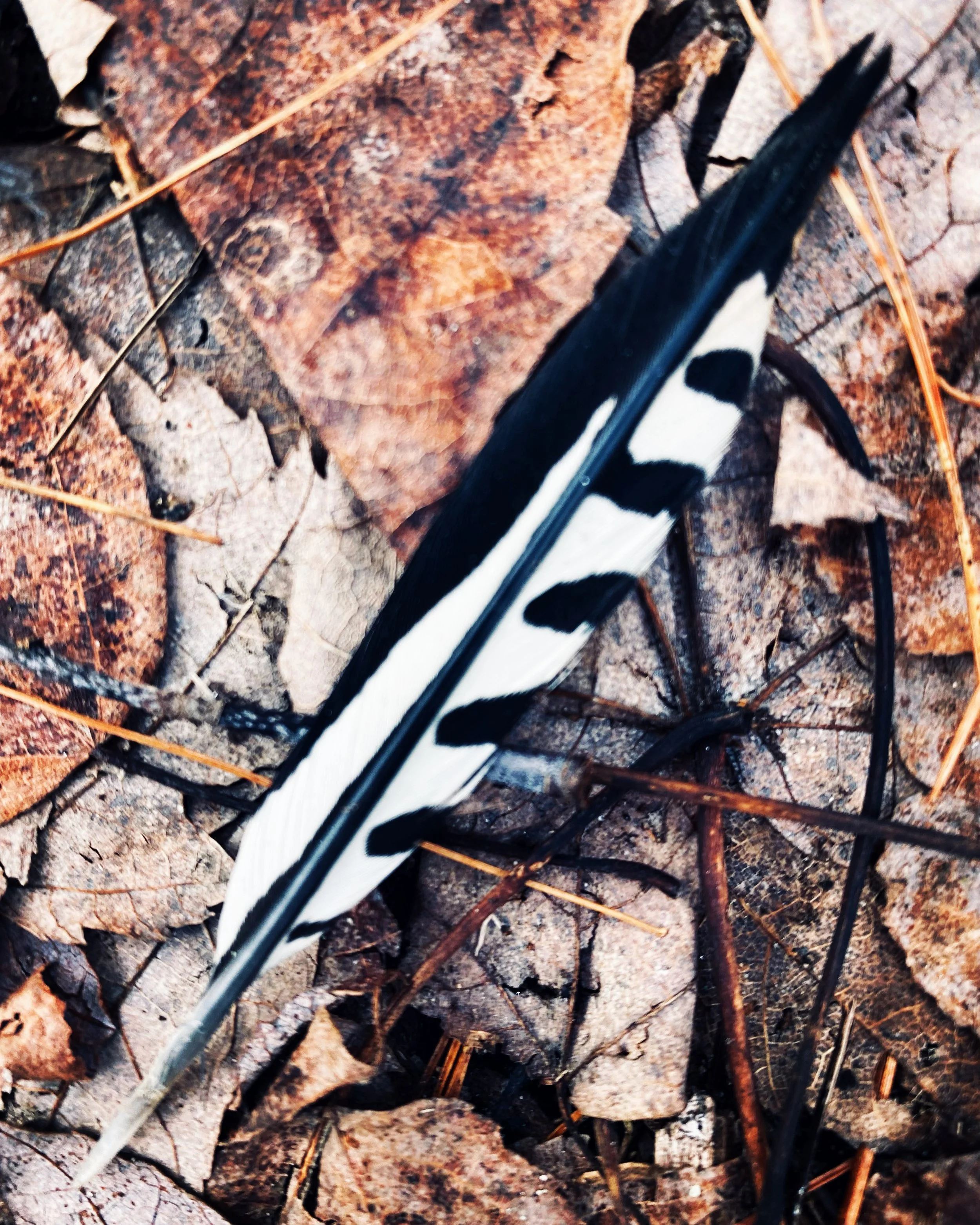 A red sunrise bleeds the morning sky. I spend some time at my computer finishing prep for the Charles River Writers before going out. I am refreshed from a good night’s sleep and eager to meet with the writers. In this season of Covid, meeting online, instead of in person. The ice surprises me––the top layer has refrozen, is glass clear and holds fast when I step on it in the wetlands. There is quite a freeze/thaw circus going on out there. I take a lot of pictures, and two that I love. I find “The Sleepers,” (above) in the morning brook. All shades of blue so striking and energy-giving. One of the sleepers has a human form; the other is a bubble form. Human, perhaps, but bubbles. As I walk and take pictures I refine my thoughts about the webinar and prompt, and I am warmed up with excitement about what will unfold. We don’t stay out that long; I plan to run, rather than swim, for a bit in the afternoon. The workshop produces some truly remarkable, spontaneous writing, and I’m really pleased about the warm-ups and prompts that I shared. Whew! We run over. Our cups runneth over. Splendid. Then, kept busy with emails and a phone call with a friend and then it’s time for my run at the track. I am not fast and energetic. But I manage three miles. It’s after school and the high school students, the track team, I guess, are sharing the track. My goodness, I feel slow! Who cares? I got my run in. I am pleased to run into the supermarket to drop a meal for a dear friend; I wish I had the wherewithal to make something homemade today. But, with Frank away and my daughter in her new job, I have delightful extra duties with the Special One. Oh! The feather I found on my walk! Gorgeous. A woodpecker? Just as I came back onto our property, there it was. Such a lovely find, a lovely moment to stop and consider the fine bird who lost it in flight.