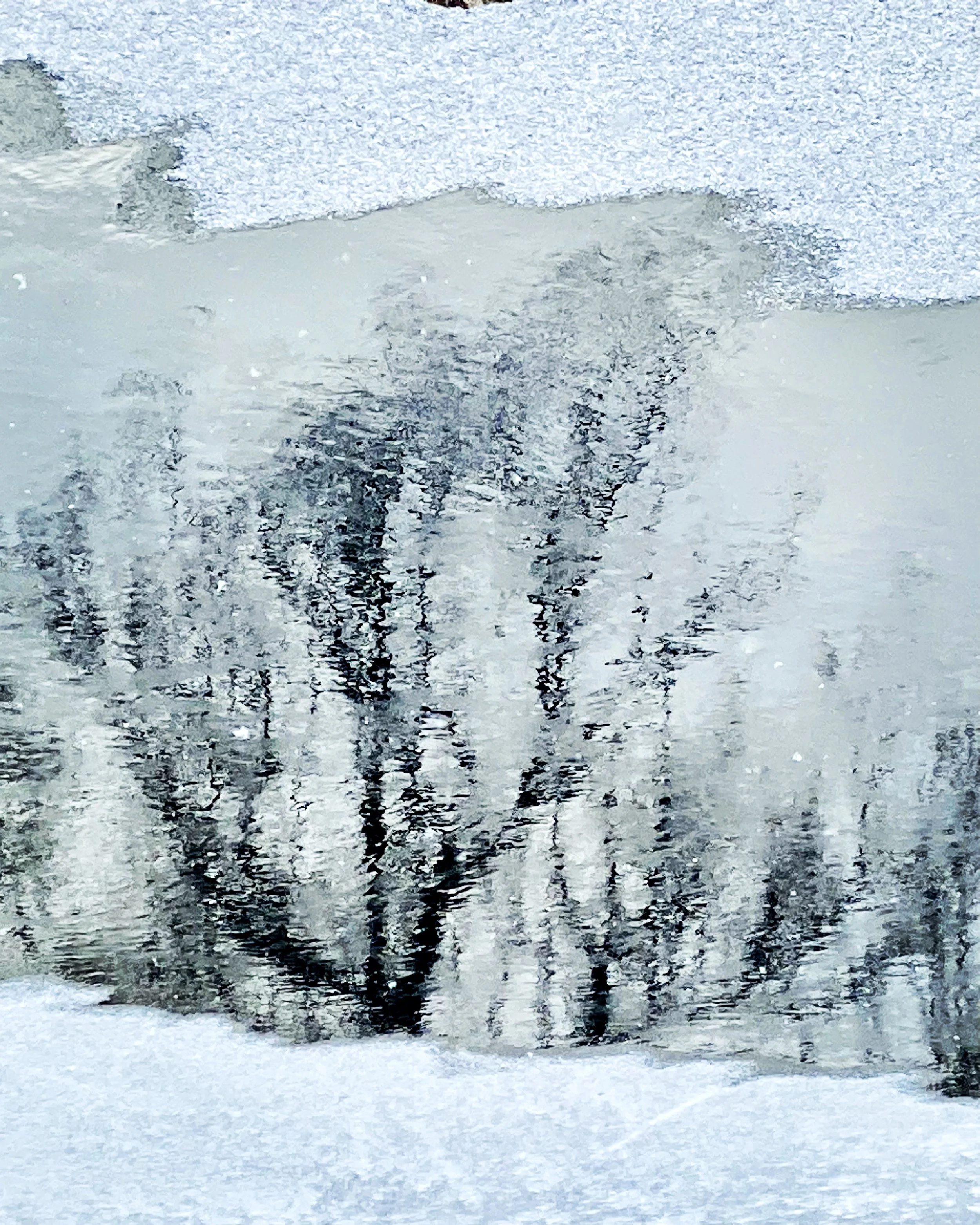 Today, I have to say the ice was a bit unsatisfying to look at. There was no sun. It was snowing very lightly; the thinnest coating on the river. The way the layers have froze this time is that the top-most layer is kind of cloudy and marred. Nothing very inspirational, until I got to the trestle bridge over the river, and there the black trees reflecting in the river were lovely. The edges, not the center of the river, ice. On my back, I carried a passenger. This passenger was happy most of the way, and fell asleep, but woke up in the woods crying. I had kept checking his head in my camera, looking behind me, to make sure he had no removed his hat as he is wont to do. Finally, I discovered the problem: he was missing a boot! I warmed it up and hurried home with him. Then backtracked to find the boot but came home empty handed somehow. Tomorrow must look again. A day of reorganization and clean up, exhausting. But, tonight I feel the satisfaction of having done it even though I overdid it. Tomorrow, I intend to have creative time in my day no matter what. Frank is on his way home.