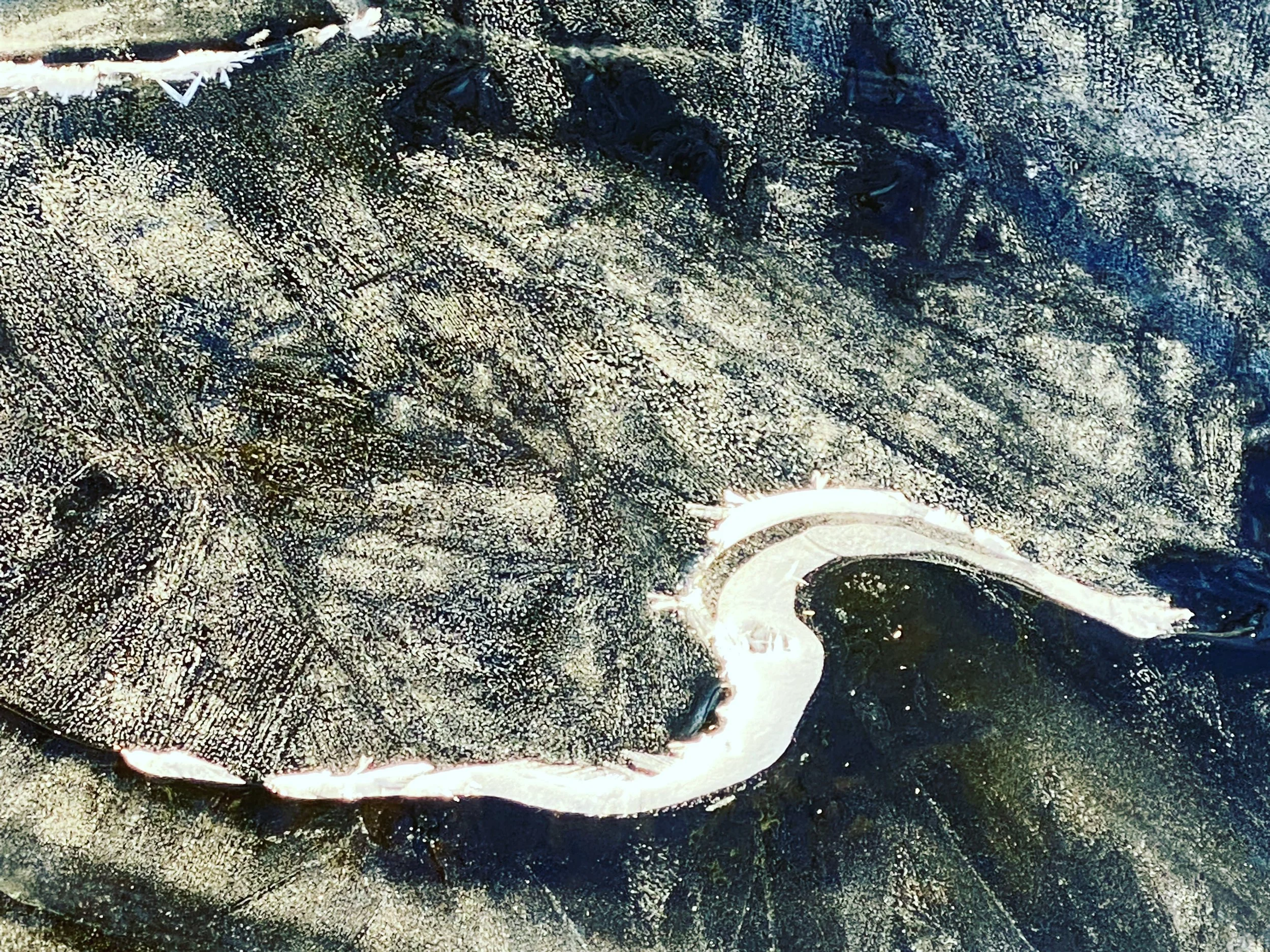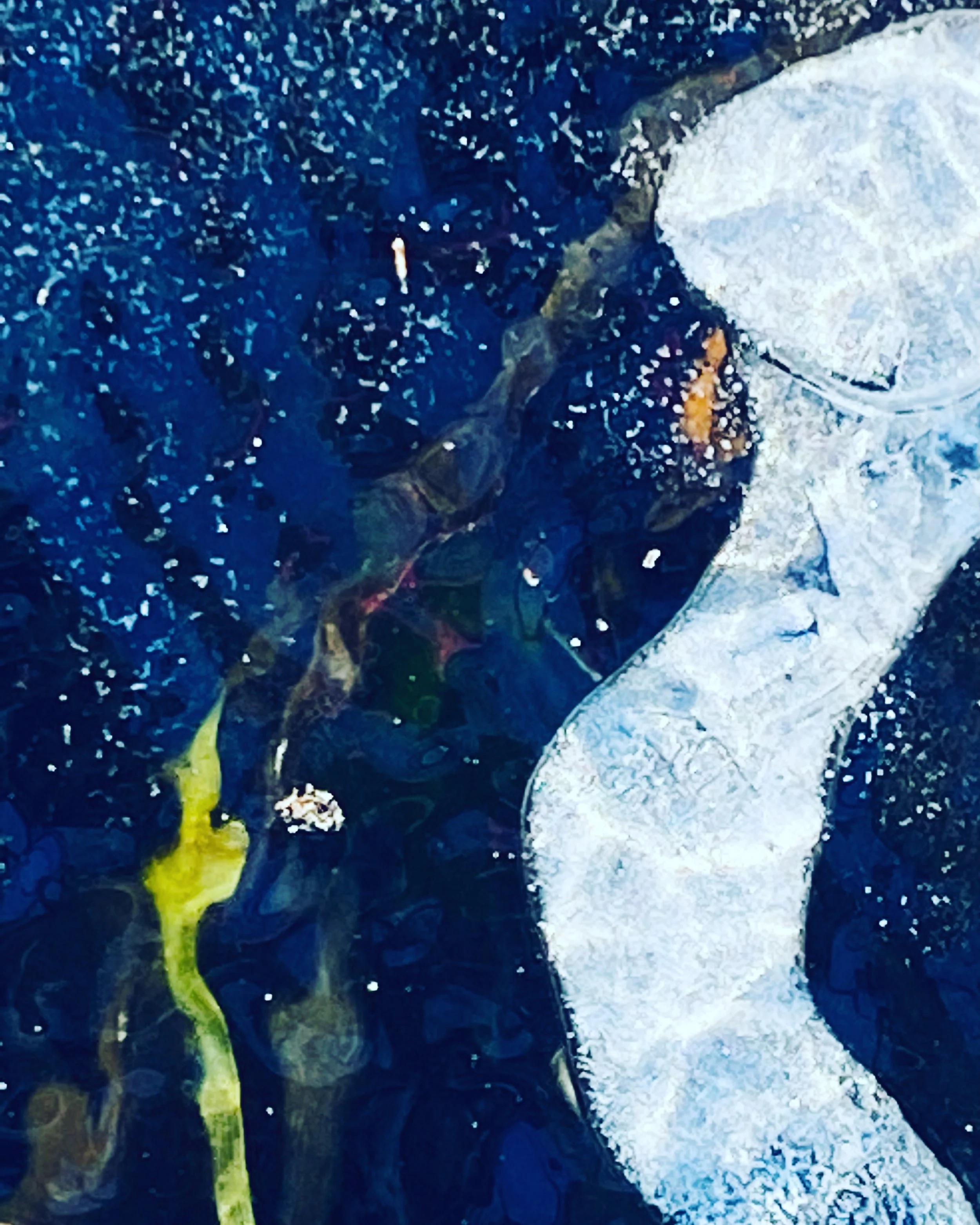 It’s dry ice; only four degrees out so I decide to swim this morning and walk later. I find a meditative rhythm. I practice enjoying every stroke, stroke, stroke, turn of my head and open mouth into breath. I swim for forty minutes enjoying my time. It’s warm here. I sense a poem coming from this swim. Will I have time to draft it before it’s gone? It’s a summer poem I’m thinking about, an outdoor swim, from a picture I have of a swimmer in Farm Pond that I took one morning from friend’s high path down to the water’s edge. I make the time once I am at my desk and a draft comes that I take to a monthly poetry workshop meet up I go to. I feel glad that I’ve gotten the draft. It’s begun, not done, and I like where it went and I’m curious about where it’s going. To get to my office I must go through the plastic, zipped up, two layers of plastic and zippers, or go outside across the deck, which is what I choose since the men are working on tearing up floors in the rooms. Blasted by cold, I think, Kelly, remember the poem you love by Ursula K. LeGuin, the lines, Let there be deep snow in your inbreathing and your outbreath be the shining of ice. So, when I breathed across the deck I went into the enchantment of this poem. In the afternoon before workshop and then an appointment I went out with the dogs planning to go pretty far, but I got involved with the fantastic ice and all the pictures. Never left the property. The dogs were not unhappy. Tonight I went back to the office to make sure the heat was turned down and decided to go through the zips. Closing the zippers on my return I heard my mother’s voice, Close it quick and all the way––don’t let the mosquitoes in! And, for a flash of a moment I was in our big family tent on Uncle Donn’s hill on the way to my sleeping bag after dark. Smell of canvas and repellant and music of crickets, feet wet from night grass.