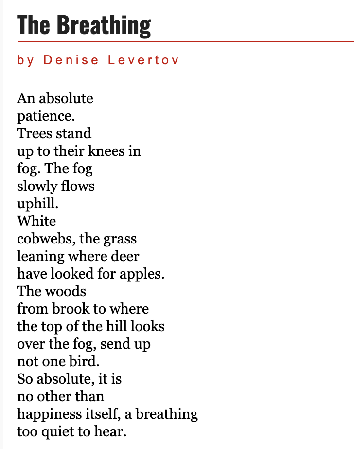 Here is an unusual morning: I choose not to go for a walk that, last night, I imagined I would enjoy. A sleepless night, coughing, and I want to conserve my energy. Starting the new session of the Charles River Writers and have three new members I am eager to welcome. I am prepared, and we gather, not in person, but each from our own homes. How lovely it is to be together to write in the New Year; old friends and new. We go deep and into authentic, intimate territory. In the afternoon, the rain and wind come as promised. I have a short nap. And then a session with my wonderful psychodrama trainer via Zoom. We do a psychodrama virtually that is quite meaningful and emotional and gives me more energy. Since I took no walk, took no pictures, since I let the dark of the day fall without being outdoors, I find, instead, this Denise Levertov poem, an exquisite one for this January moment and scene of life. I enter it as if it’s a meditation prompt, connecting me with my deepest breath. January in the bones today. Thinking of my mother, how calming and comforting to be in her low-lit kitchen in the early dark of January, present with her busy attention to making a sit-down dinner for us around her table. January.